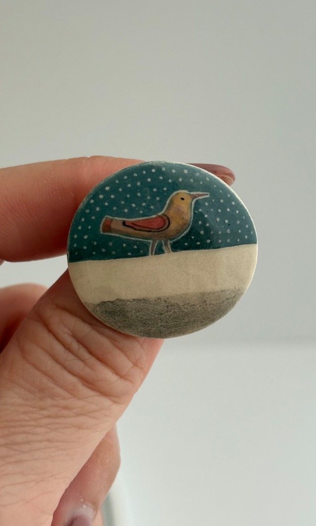まだ雪深い大地にポツンと佇む小鳥さん とは言え空の色は確実に季節が変わってきているようです。 バルト三国のリトアニア、ウクメルゲに住む陶器作家のAdomasさんが作る sutverimai_artの技法で作られたセラミック製のブローチです。細い針で削り、釉薬を筆で塗り焼いていきます。 民間伝承や民族文化、リトアニアの豊かな自然などからインスピレーションを受けて作られています。 とても繊細で細かい作業と時間を有する手仕事です。 いくつもの色を塗り重ねて出来た色合いが見ているだけでこの小さな世界に引き込まれそうです。 自分だけの物語が作れそうな素敵なブローチです。 お取り扱いにはご注意くださいませ。 陶器 縦2.6cm横2.8cm