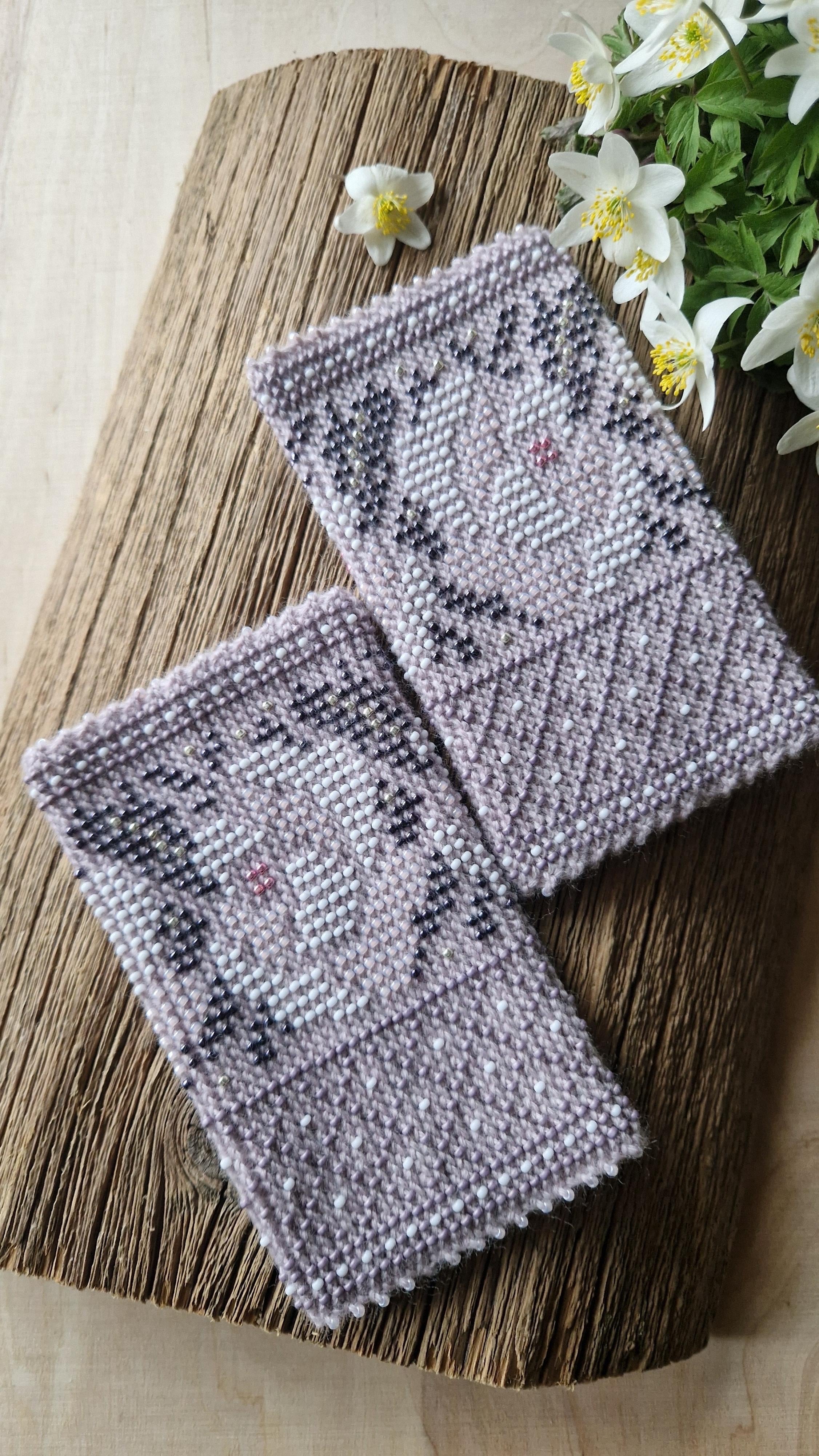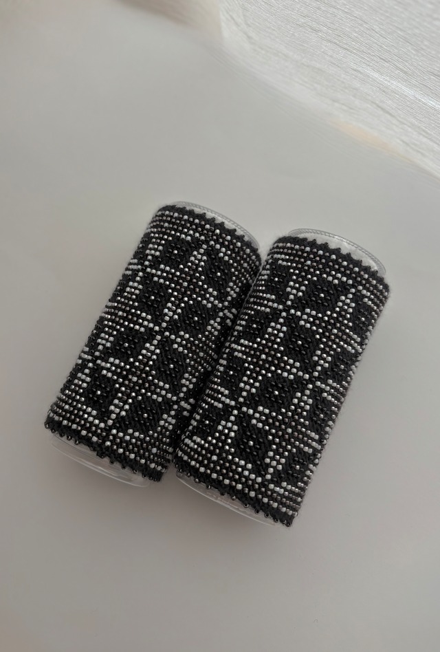 今回、白やシルバーをメインにオーダーしましたが この文様で黒ってオーダーしたことない、、、 と思いあたり、かっこいい黒を作って欲しいとお願いしました。 黒とシルバー。。シンプルながらクールでカッコいい⭐︎そんなマウチが完成しました! こちらも十字部分はシルバー一色ではなく ガンメタリックのビーズが作って使われているから モチーフに奥行きが表現されています。 素敵♡♡ Auseklisアウセクリス 金星の化身であるラトビアの神様 Ausの語源はラトビア語で「夜明け」 闇に対する光の勝利を象徴する。 悪いものを追い出す。。 そんな意味合いを持つ文様です。 マウチの模様を眺めていると 色々な模様が浮き出てきて このマウチも同様、、。 アウセクリスの文様も見えますが ちょっと斜めにしてみると 今度はマーラスクルスツの文様も 浮き出して見えてくるのです。 マーラスクルスツ クロス(十字)は幸せを運んでくれる文様 2つも伝統的な文様が使われているのです。 evijaさんの作り出すマウチの模様は それが古くさくなく、いかにも文様にも見えず とても洗練されていると思うのです。 マウチは編み始める前に柄を全て計算して(図におこして)全てのビーズを毛糸に通してから細い編み棒で編むという想像もつかない大変な工程で作られています。 毎回マウチを見るたびに感動してしまう美しさです。 裏面はビーズが響かないよう編まれています。 あったかくて気持ちいいですよ♡ 秋冬の防寒具としてはもちろん、夏の冷房対策にそっとバッグに忍ばせておくのもオススメです♪ 季節問わずにお使い頂ける場面は多そうです。 メリノウール100% 横8cm縦11cm 手首周りは15cm前後〜 ほとんどの方はこのサイズで大丈夫です。 汚れが気になるときは30度以下のぬるま湯で 手洗いで、またウール用の中性洗剤などをお使いになっても大丈夫です。 乾かす時には平らなところで必ず 陰干ししてください