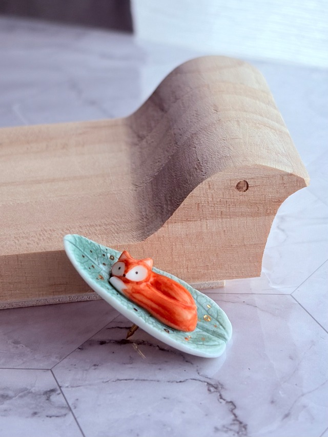 リトアニアの自然豊かなヴィルニュスで暮らし陶芸教室もしている作家Lauraさんの作品です。 2年ほど前にお子さんが産まれて去年から活動を再開された頃に偶然出会い、ご縁がありこの度ご紹介できることになりました。 鮮やかなオレンジ色のきつねさん。 ふわふわのしっぽを巻きつけて 葉っぱの上でのんびりとしています。 その様子がなんとも愛らしいです⭐︎ 素材:白磁器、22kゴールド 縦3.5cm横1.7cm