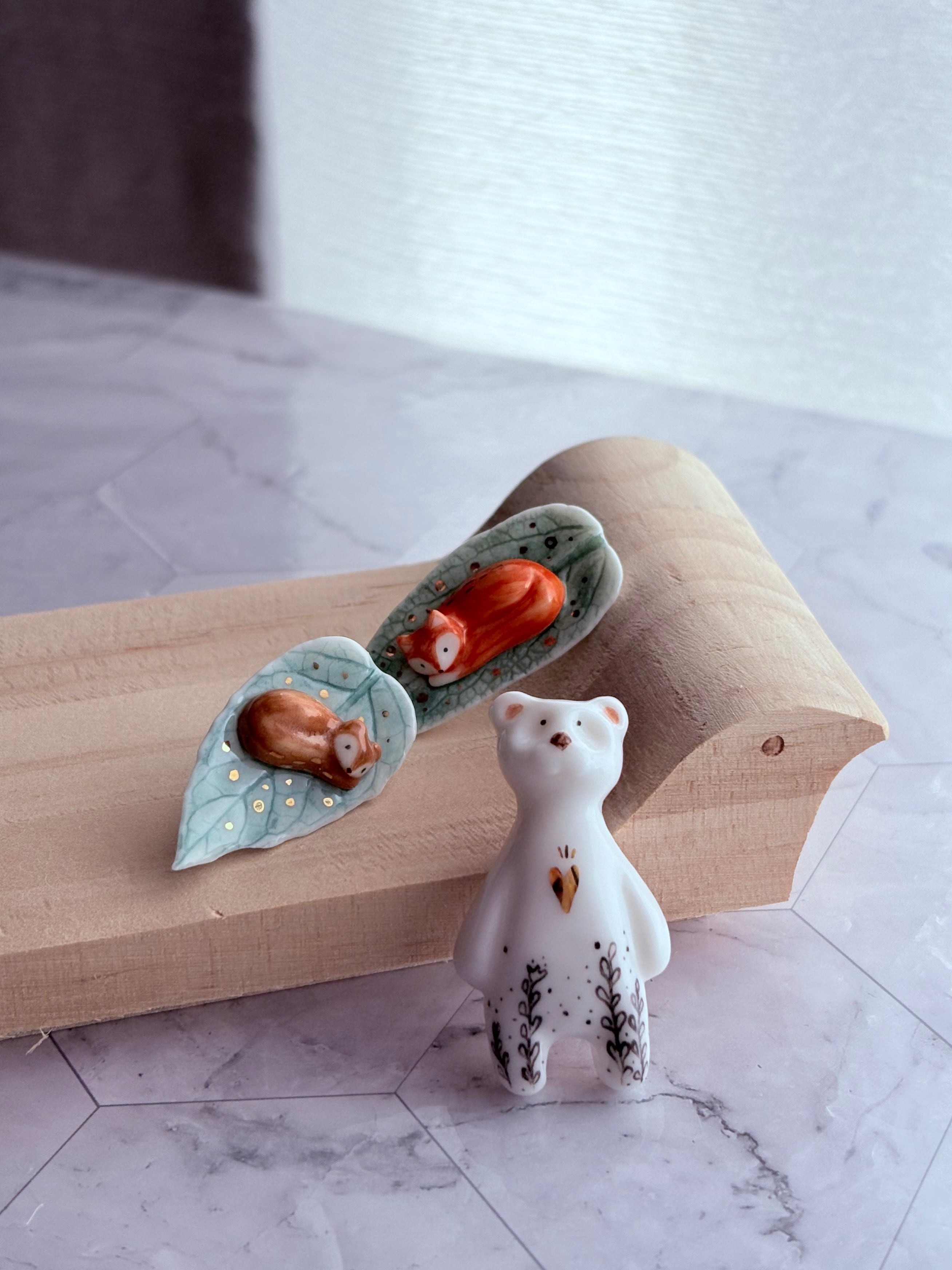 リトアニアの自然豊かなヴィルニュスで暮らし陶芸教室もしている作家Lauraさんの作品です。 2年ほど前にお子さんが産まれて去年から活動を再開された頃に偶然出会い、ご縁がありこの度ご紹介できることになりました。 薄茶のこぎつねさんのような可愛らしい子 葉っぱの上で丸まっていますが 胸元につけるとつぶらな瞳で こちらをしっかりと見上げて見つめています♪ 小さいのに細かいところまで 繊細に丁寧に作り上げてくださっています。 素材:白磁器、22kゴールド 縦3.2cmよこ1.7cm