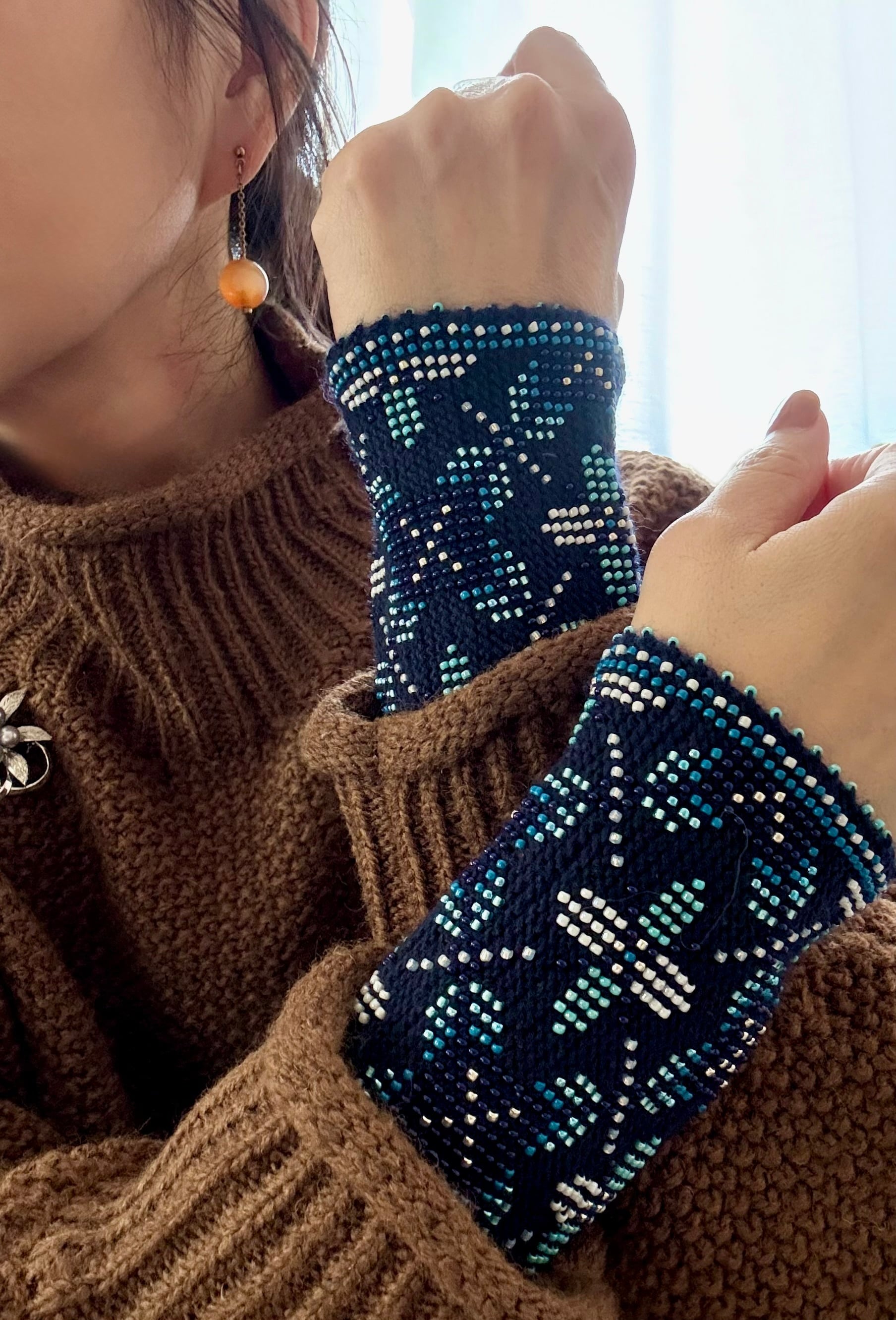 マウチは編み始める前に柄を全て計算して(図におこして)全てのビーズを毛糸に通してから細い編み棒で編むという想像もつかない大変な工程で作られています。