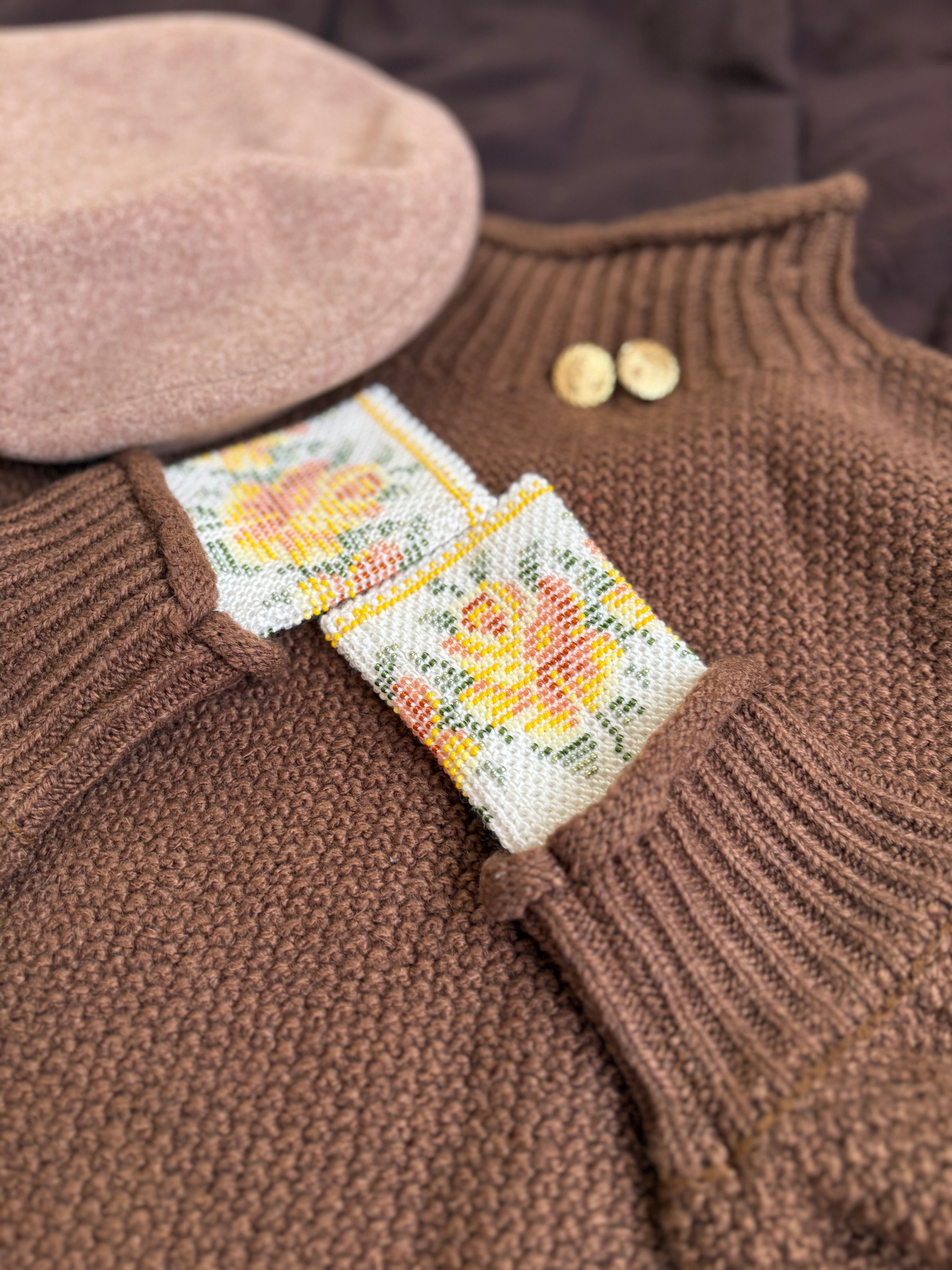 マウチは編み始める前に柄を全て計算して(図におこして)全てのビーズを毛糸に通してから細い編み棒で編むという想像もつかない大変な工程で作られています。