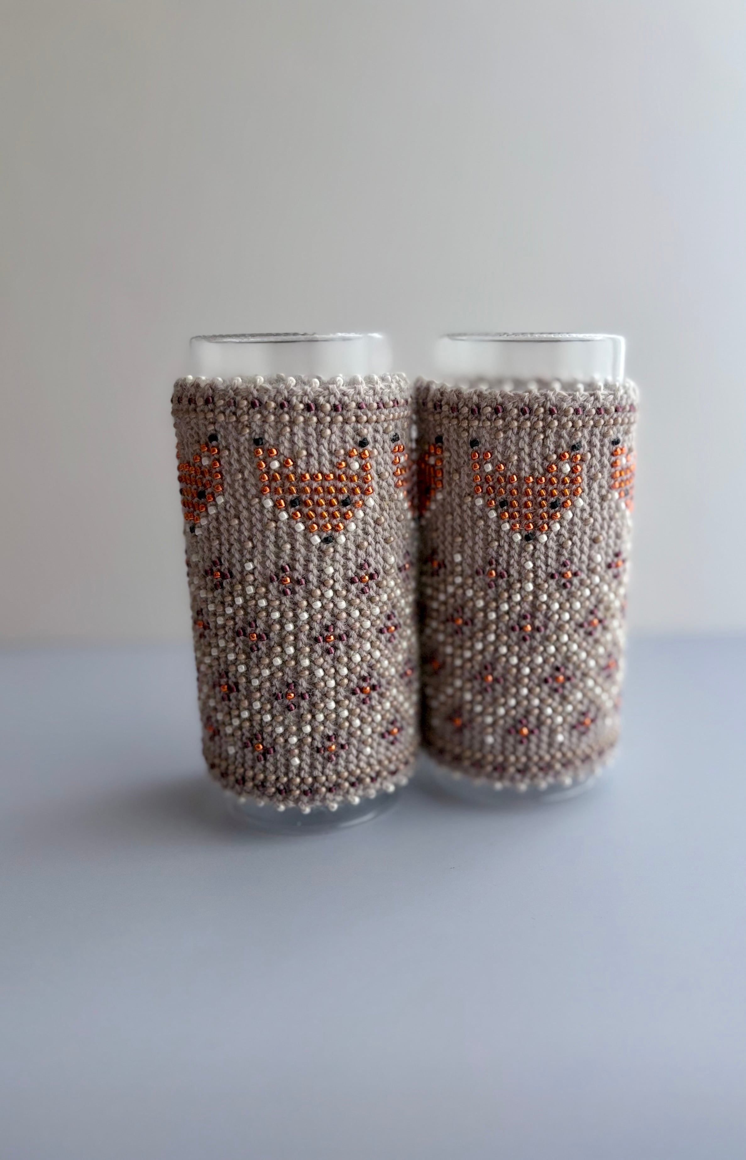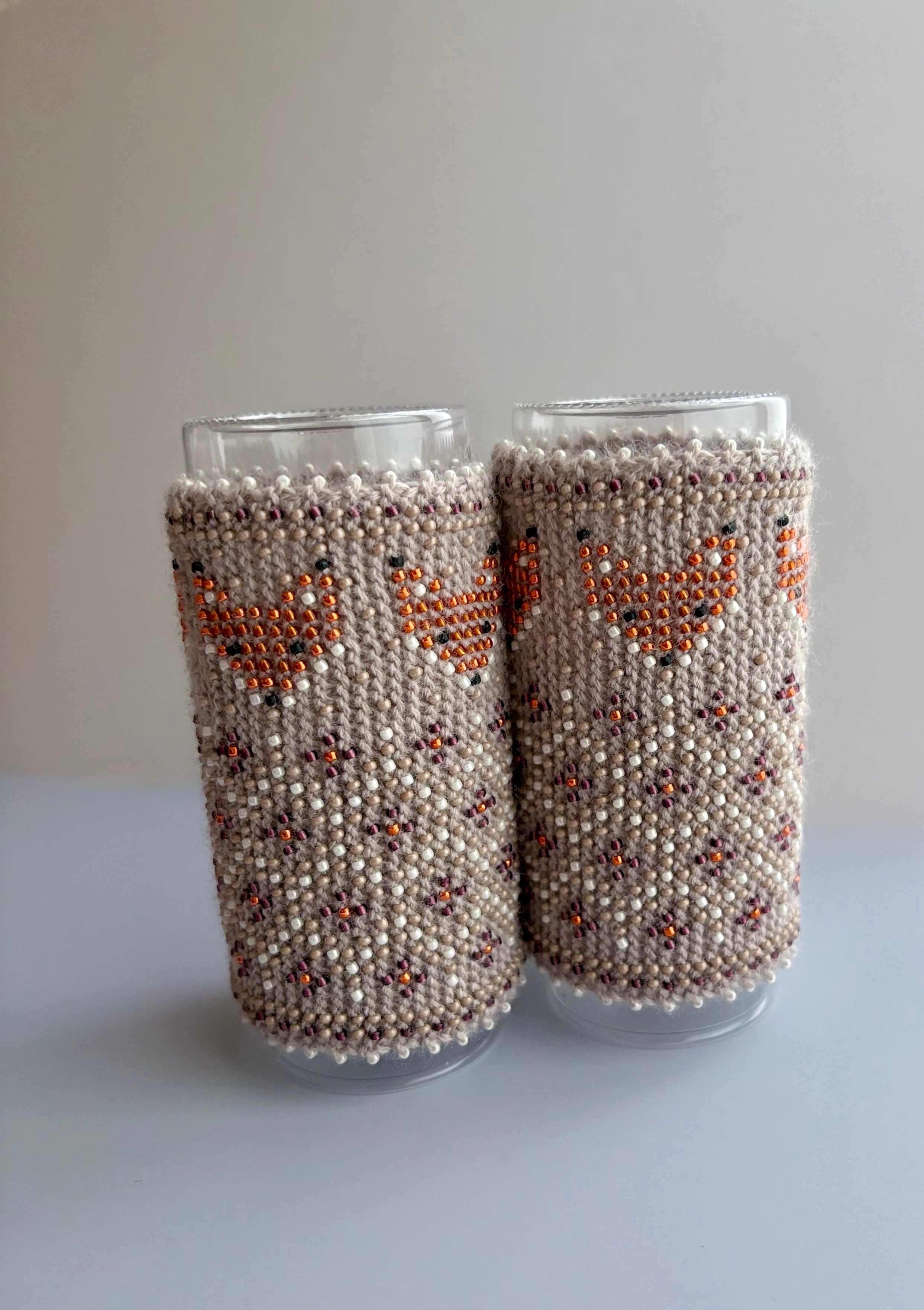 マウチは編み始める前に柄を全て計算して(図におこして)全てのビーズを毛糸に通してから細い編み棒で編むという想像もつかない大変な工程で作られています。
