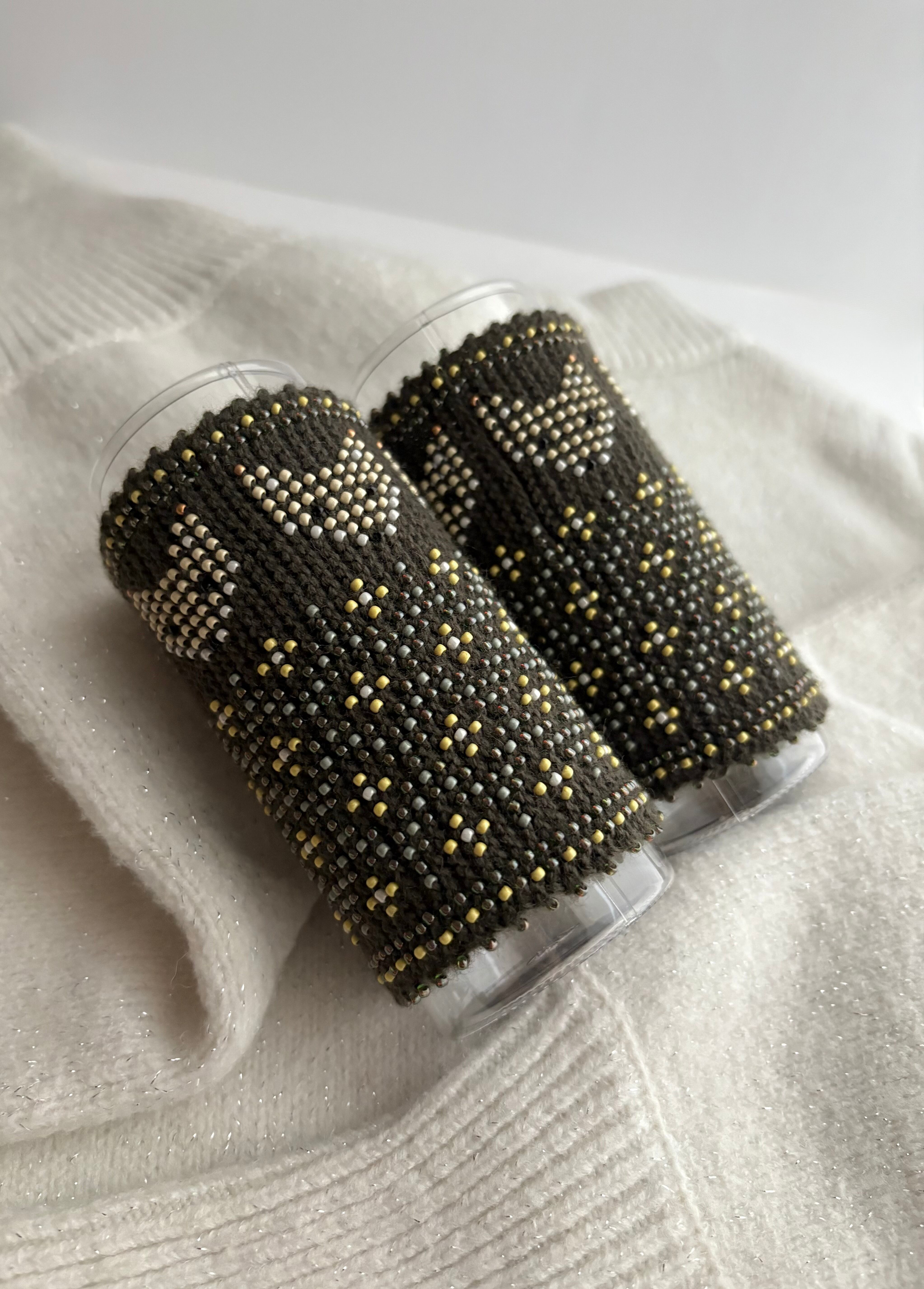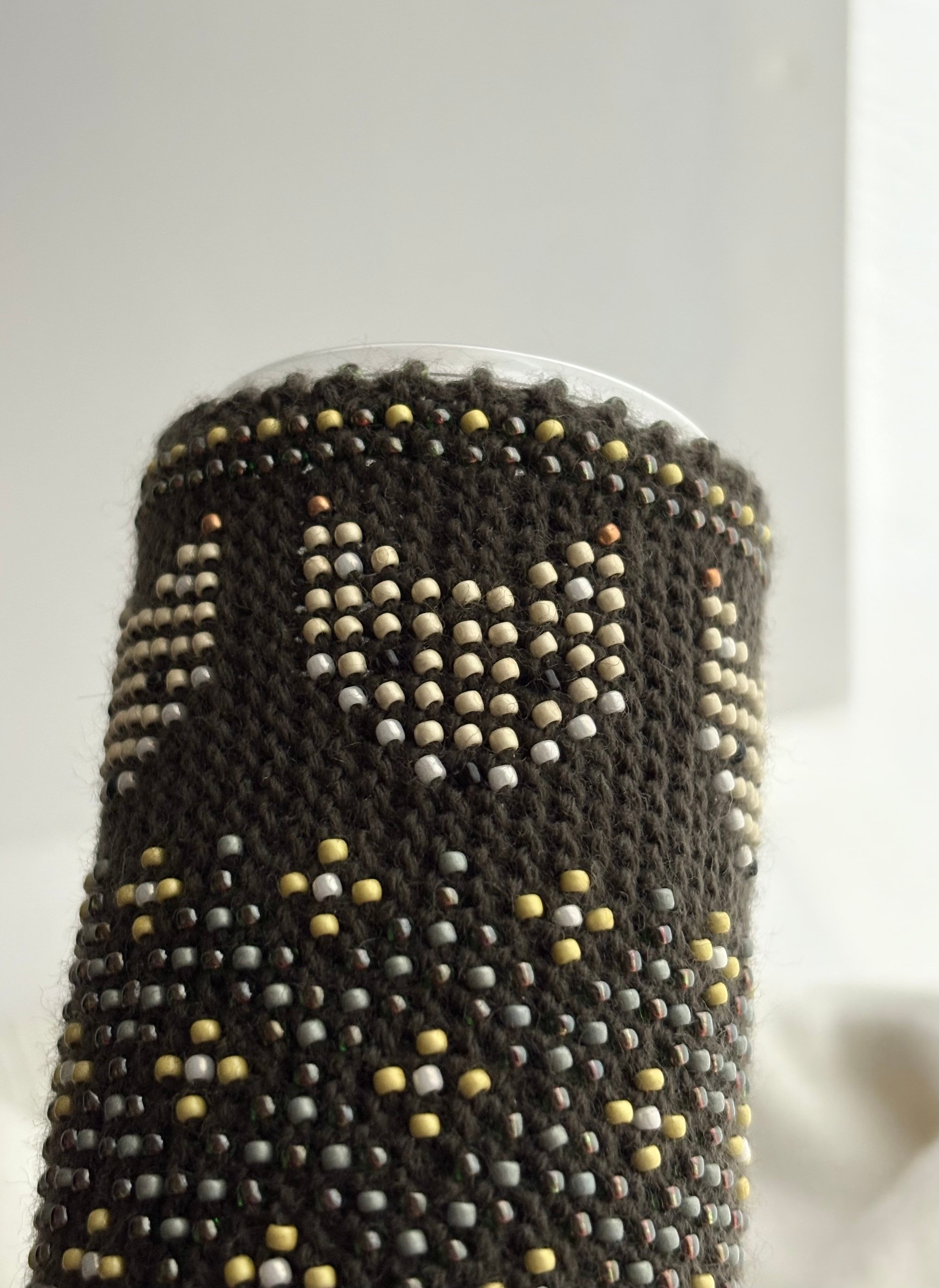 マウチは編み始める前に柄を全て計算して(図におこして)全てのビーズを毛糸に通してから細い編み棒で編むという想像もつかない大変な工程で作られています。