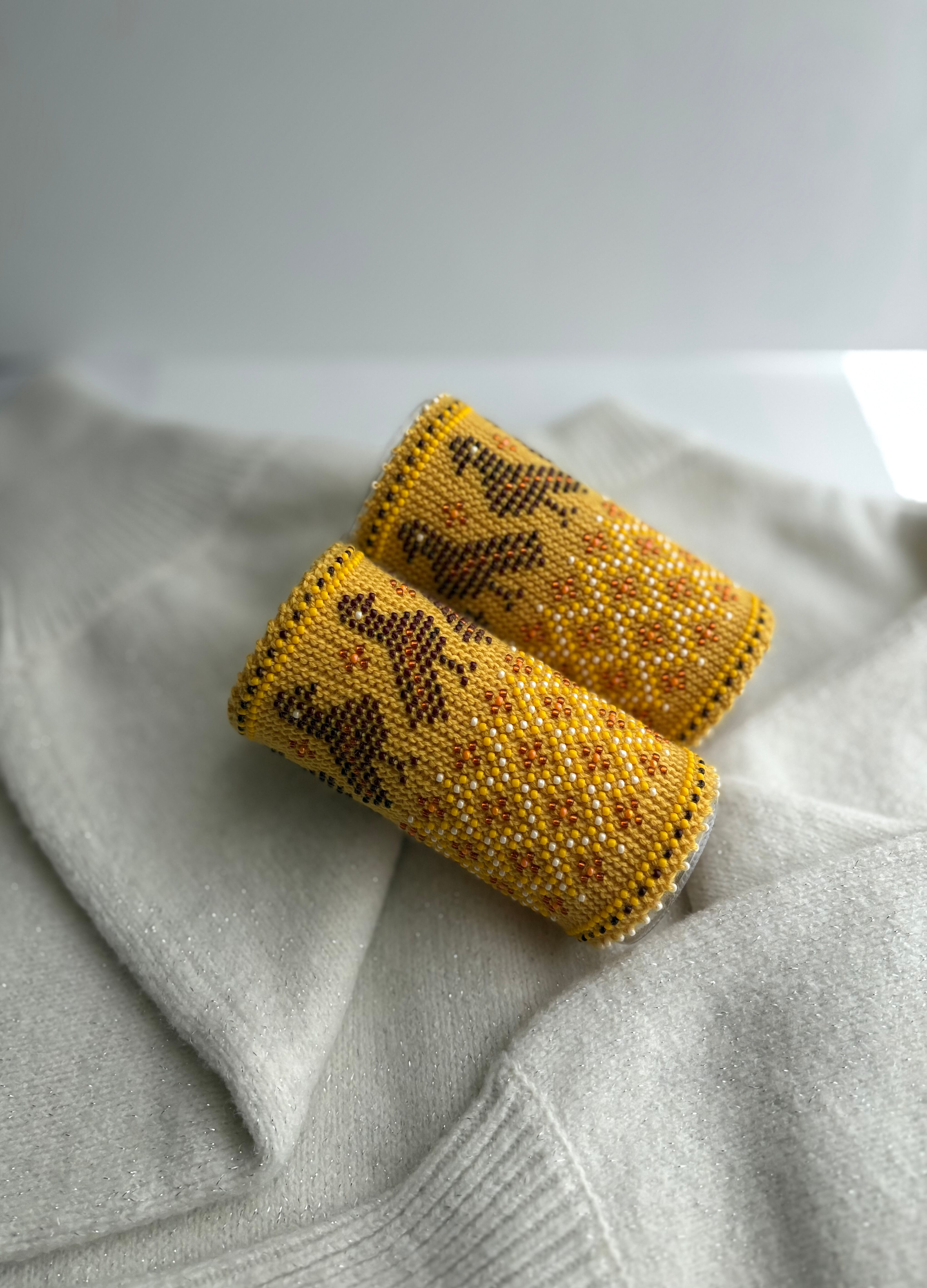 マウチは編み始める前に柄を全て計算して(図におこして)全てのビーズを毛糸に通してから細い編み棒で編むという想像もつかない大変な工程で作られています。