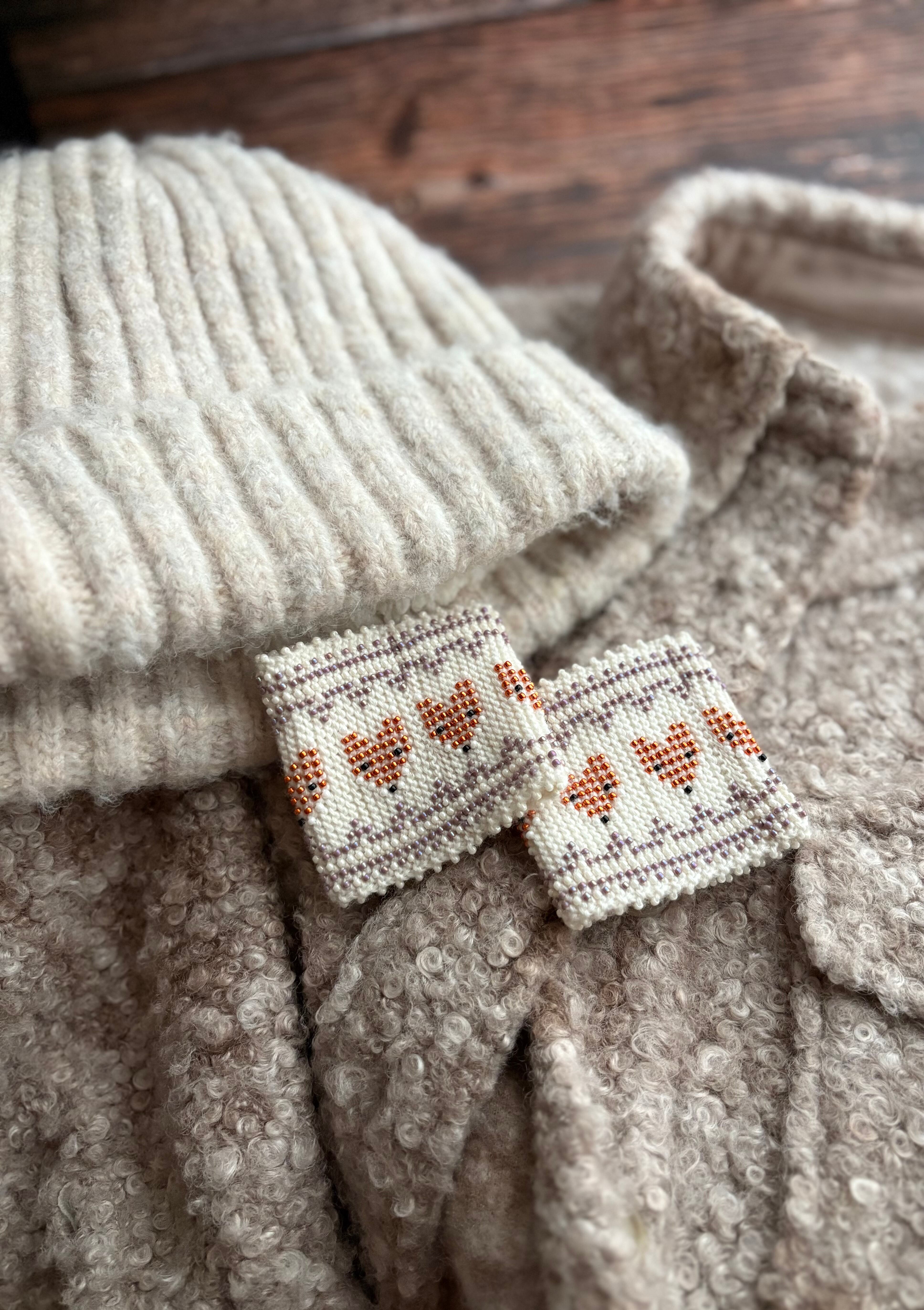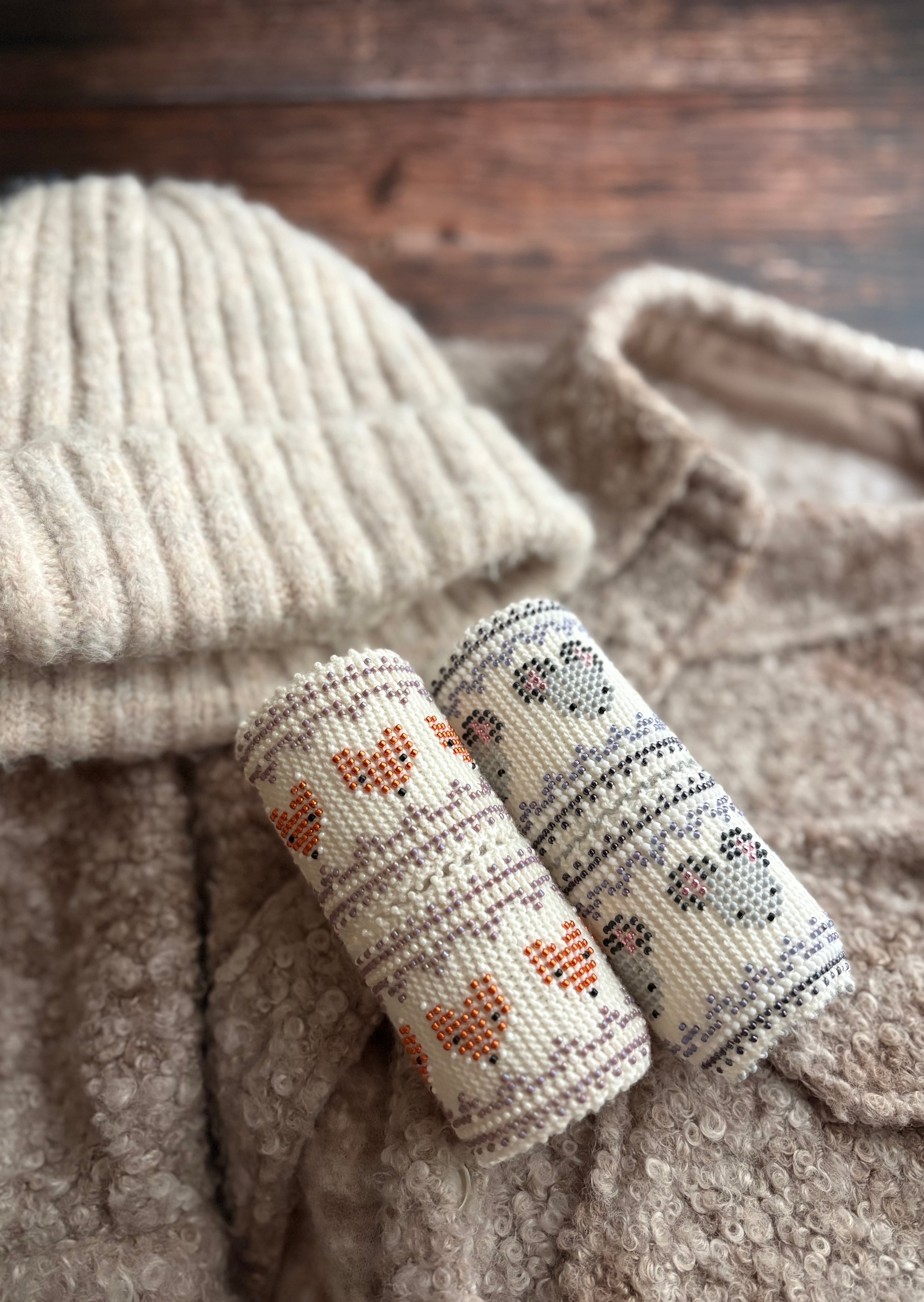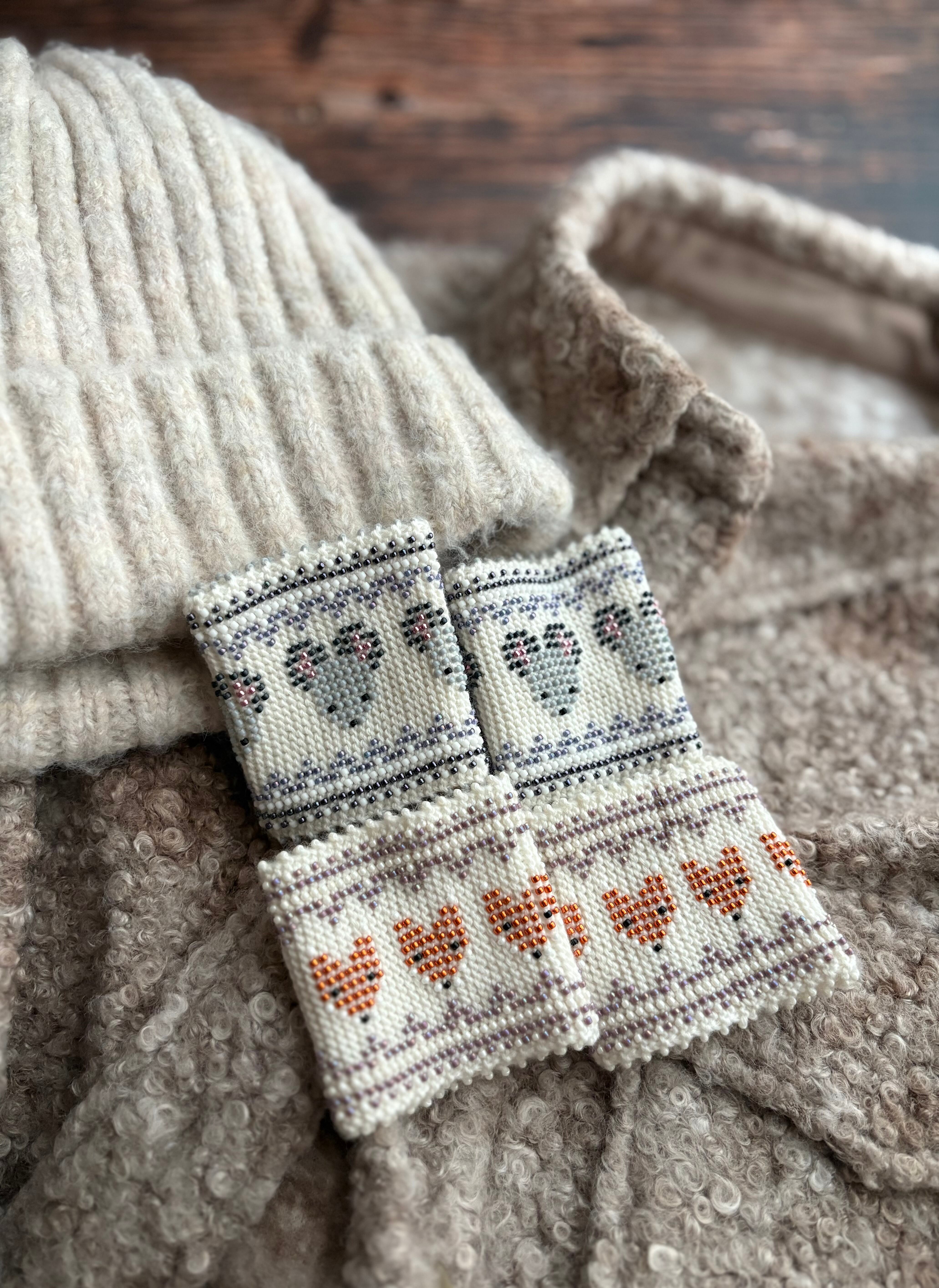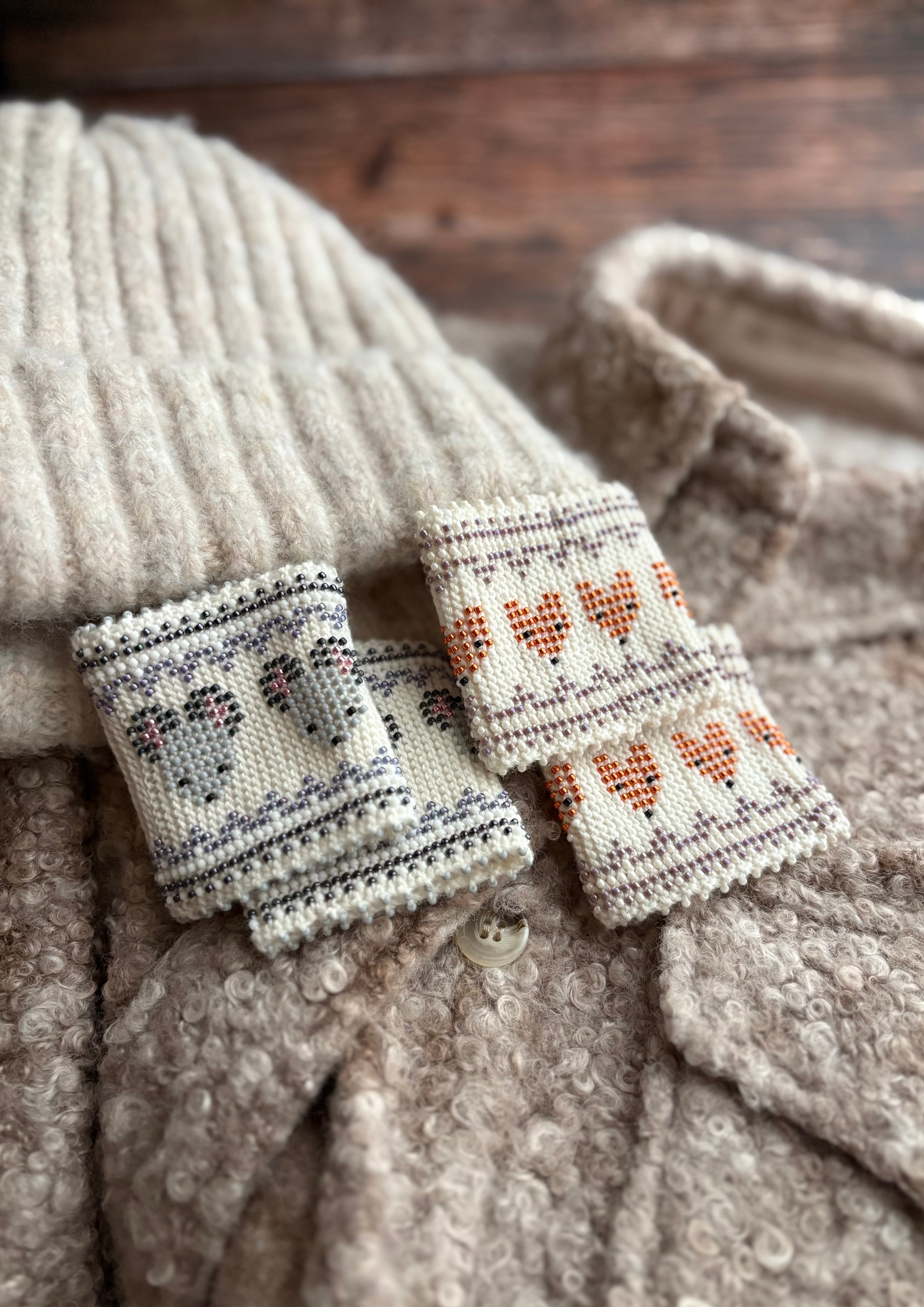 マウチは編み始める前に柄を全て計算して(図におこして)全てのビーズを毛糸に通してから細い編み棒で編むという想像もつかない大変な工程で作られています。