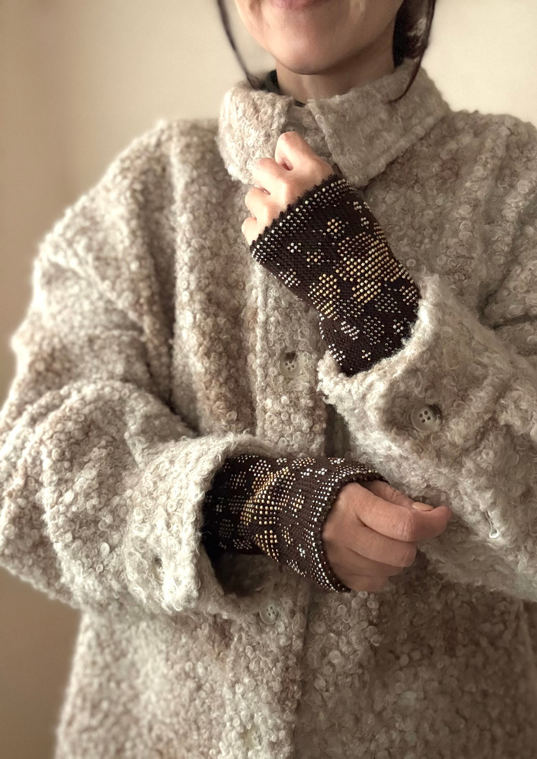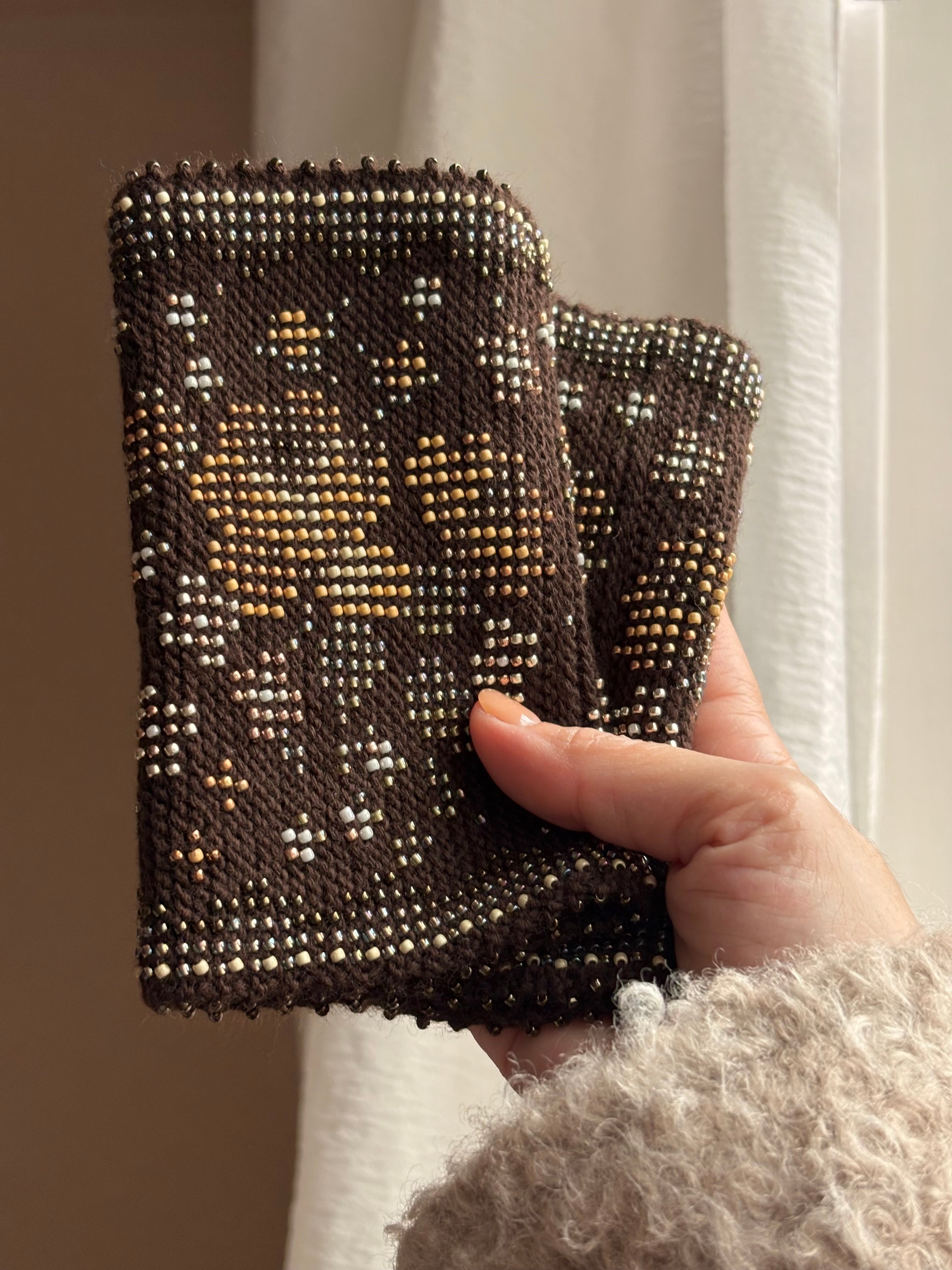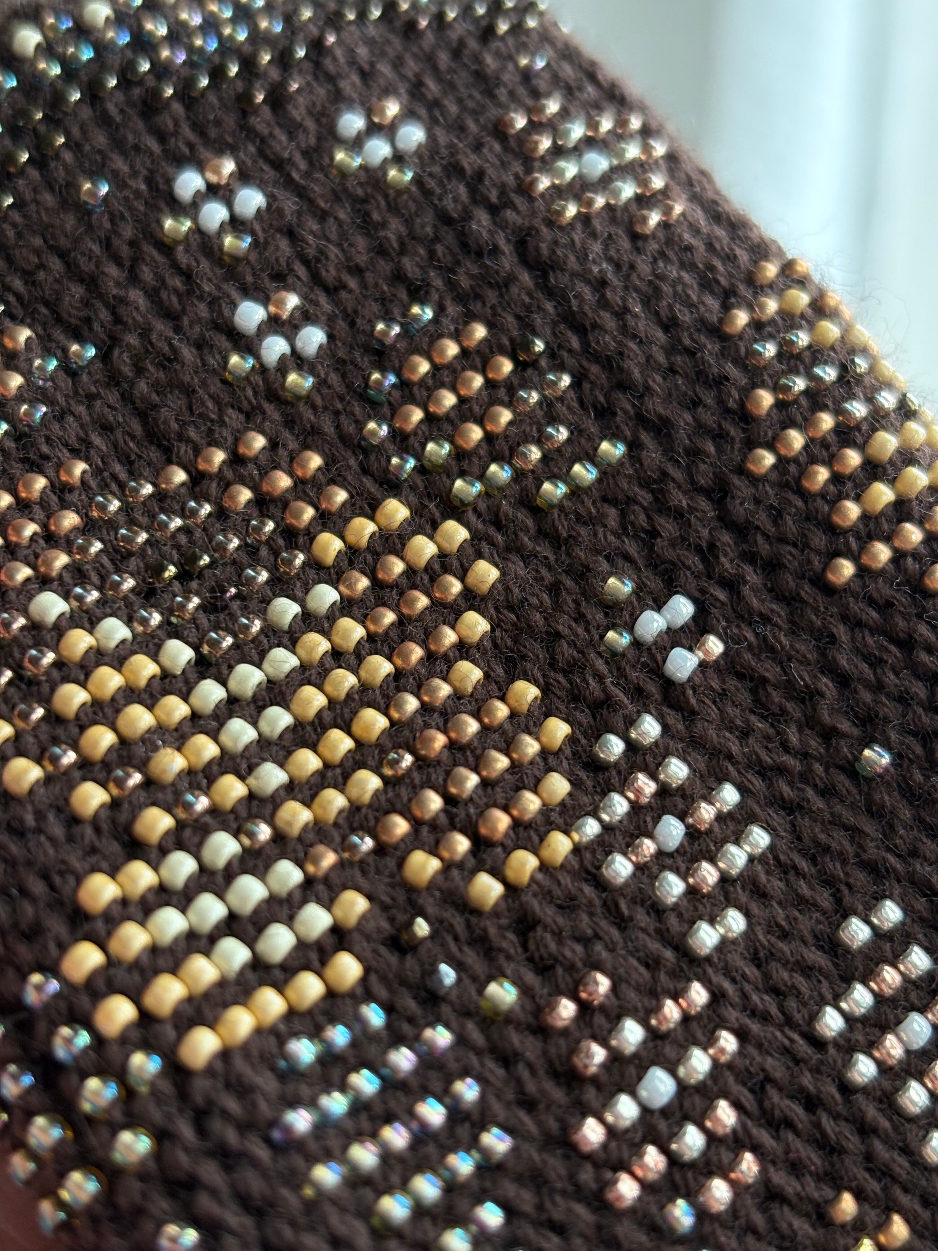 マウチは編み始める前に柄を全て計算して(図におこして)全てのビーズを毛糸に通してから細い編み棒で編むという想像もつかない大変な工程で作られています。