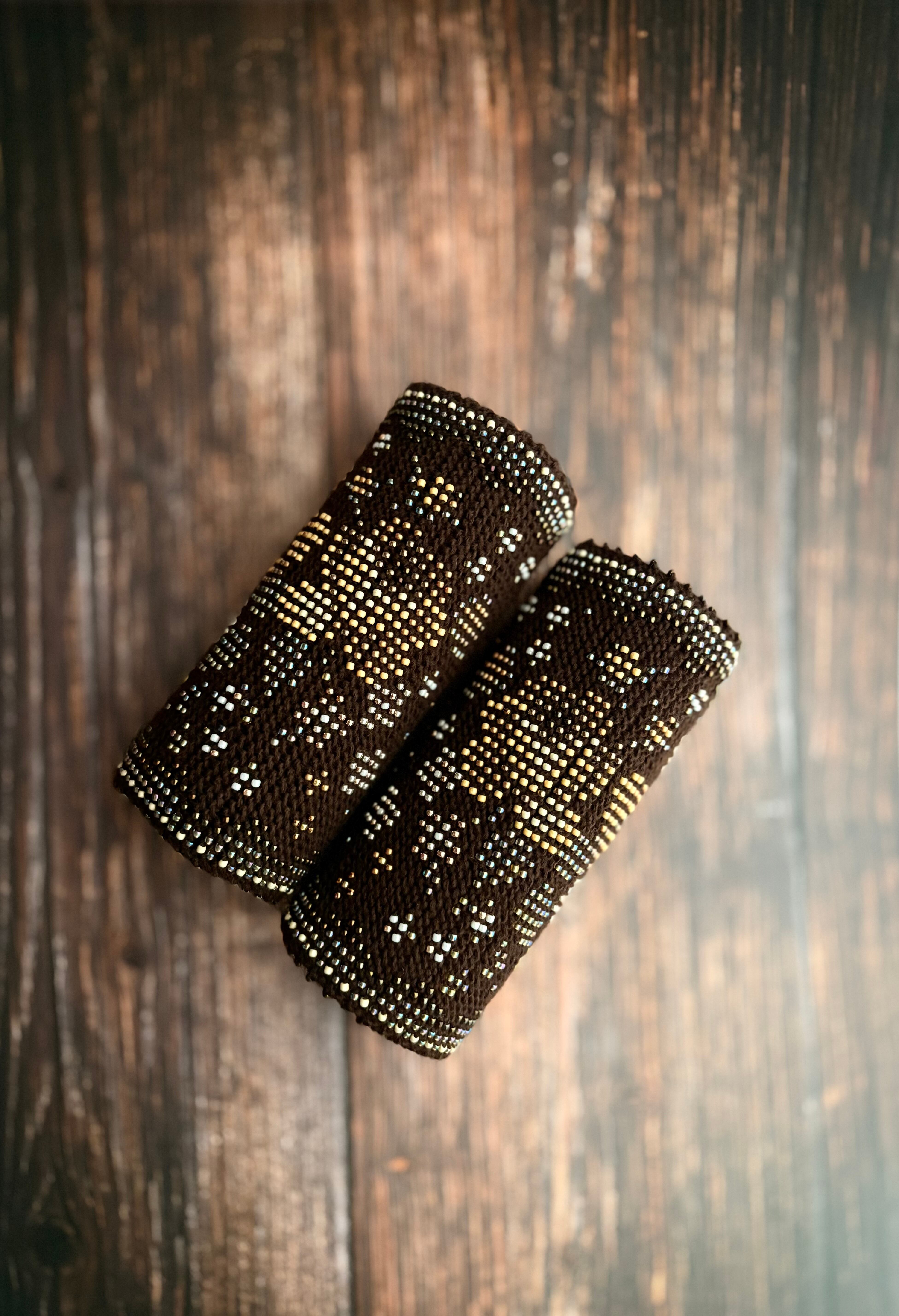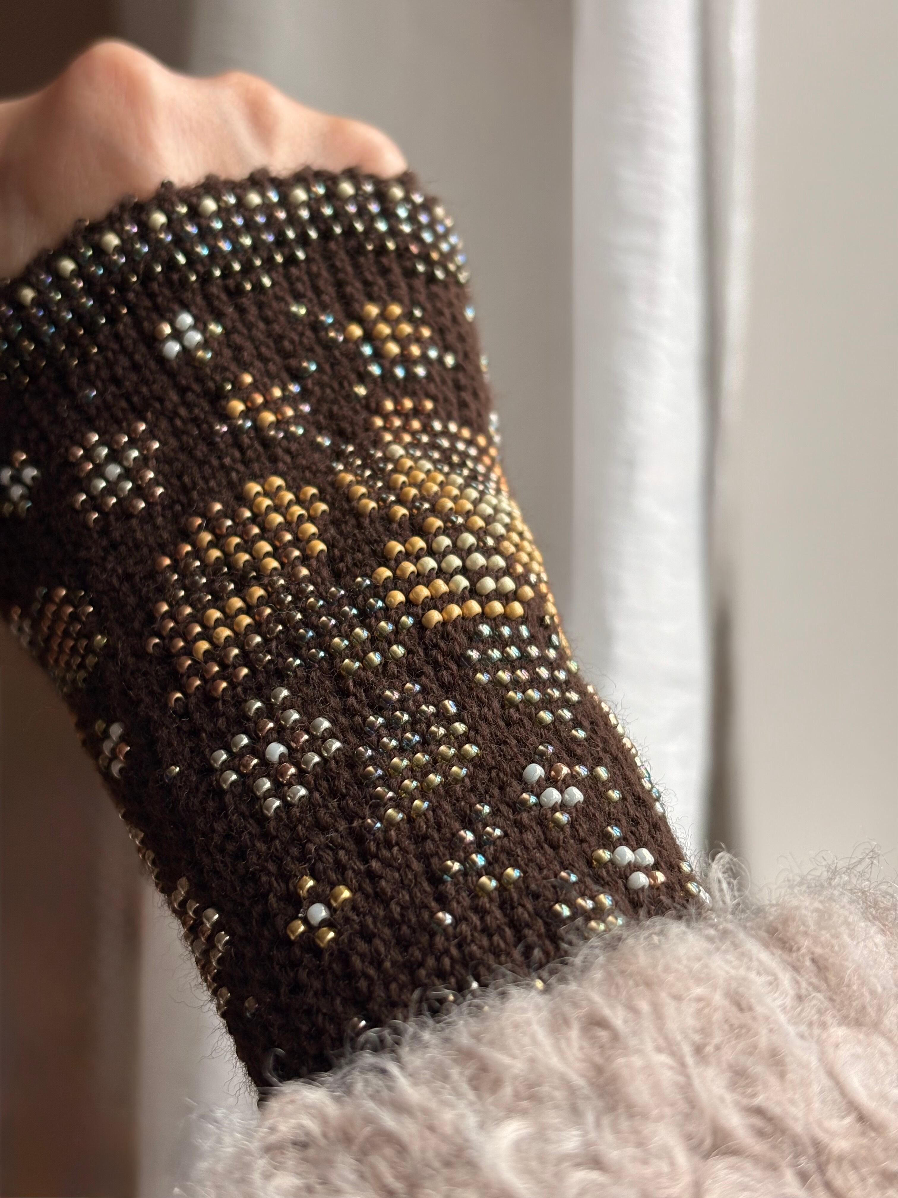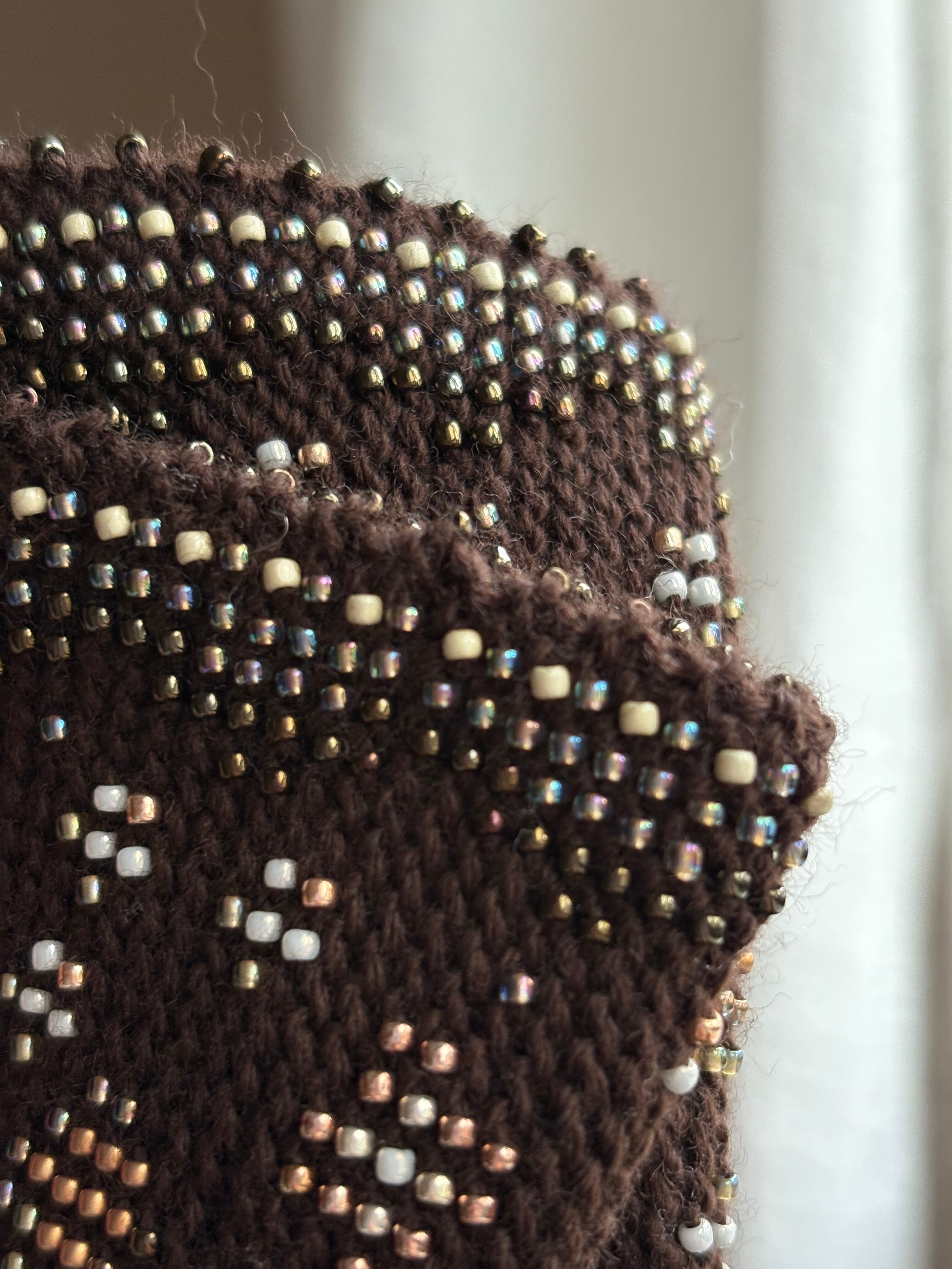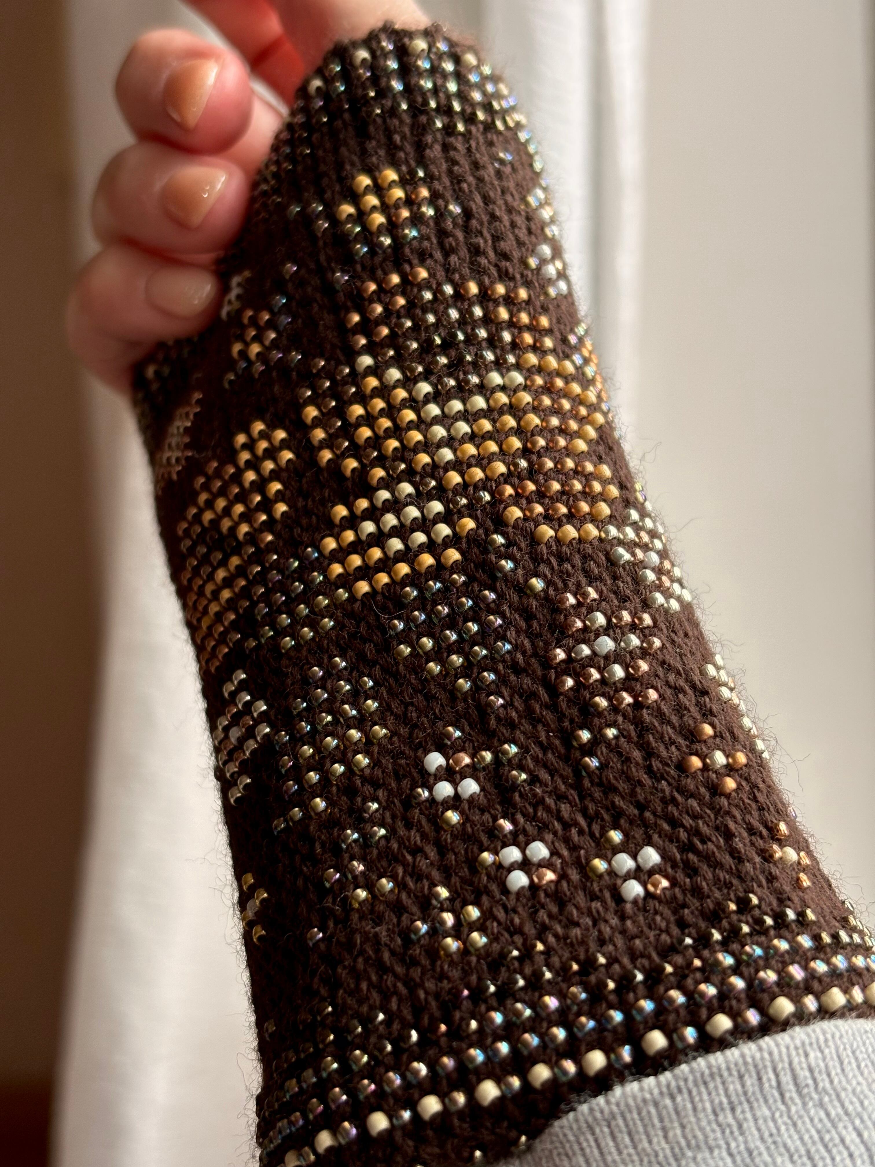 マウチは編み始める前に柄を全て計算して(図におこして)全てのビーズを毛糸に通してから細い編み棒で編むという想像もつかない大変な工程で作られています。