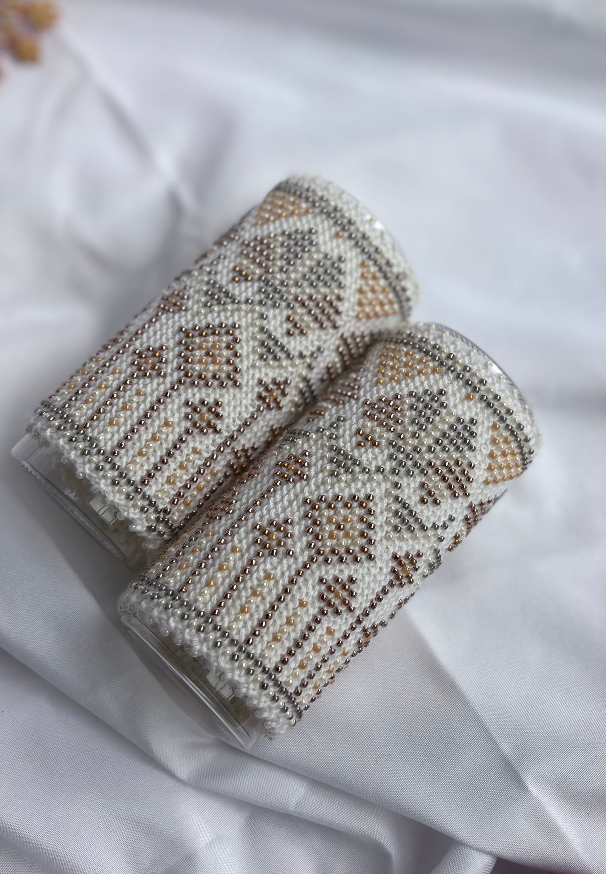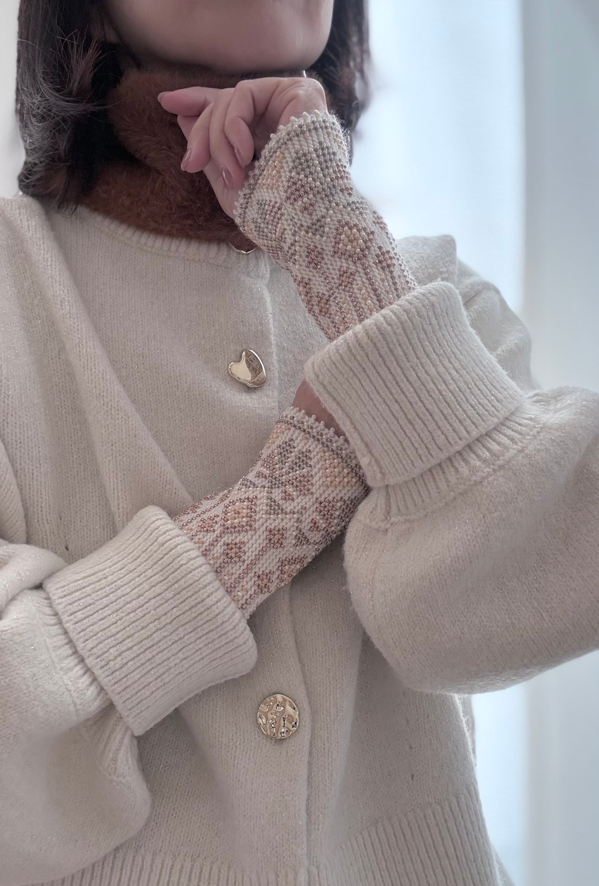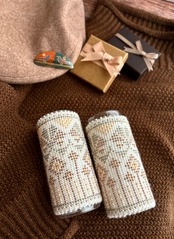 マウチは編み始める前に柄を全て計算して(図におこして)全てのビーズを毛糸に通してから細い編み棒で編むという想像もつかない大変な工程で作られています。