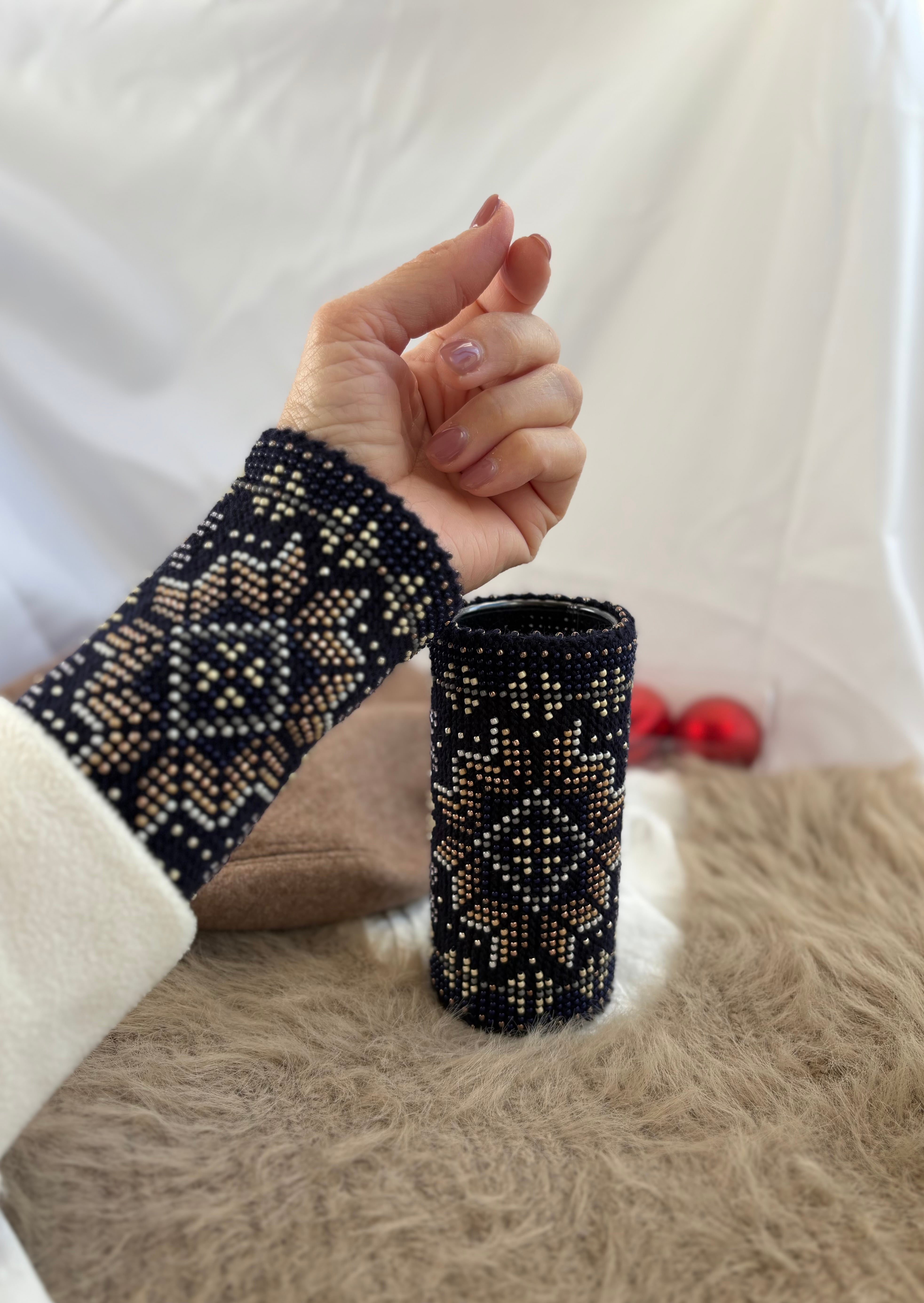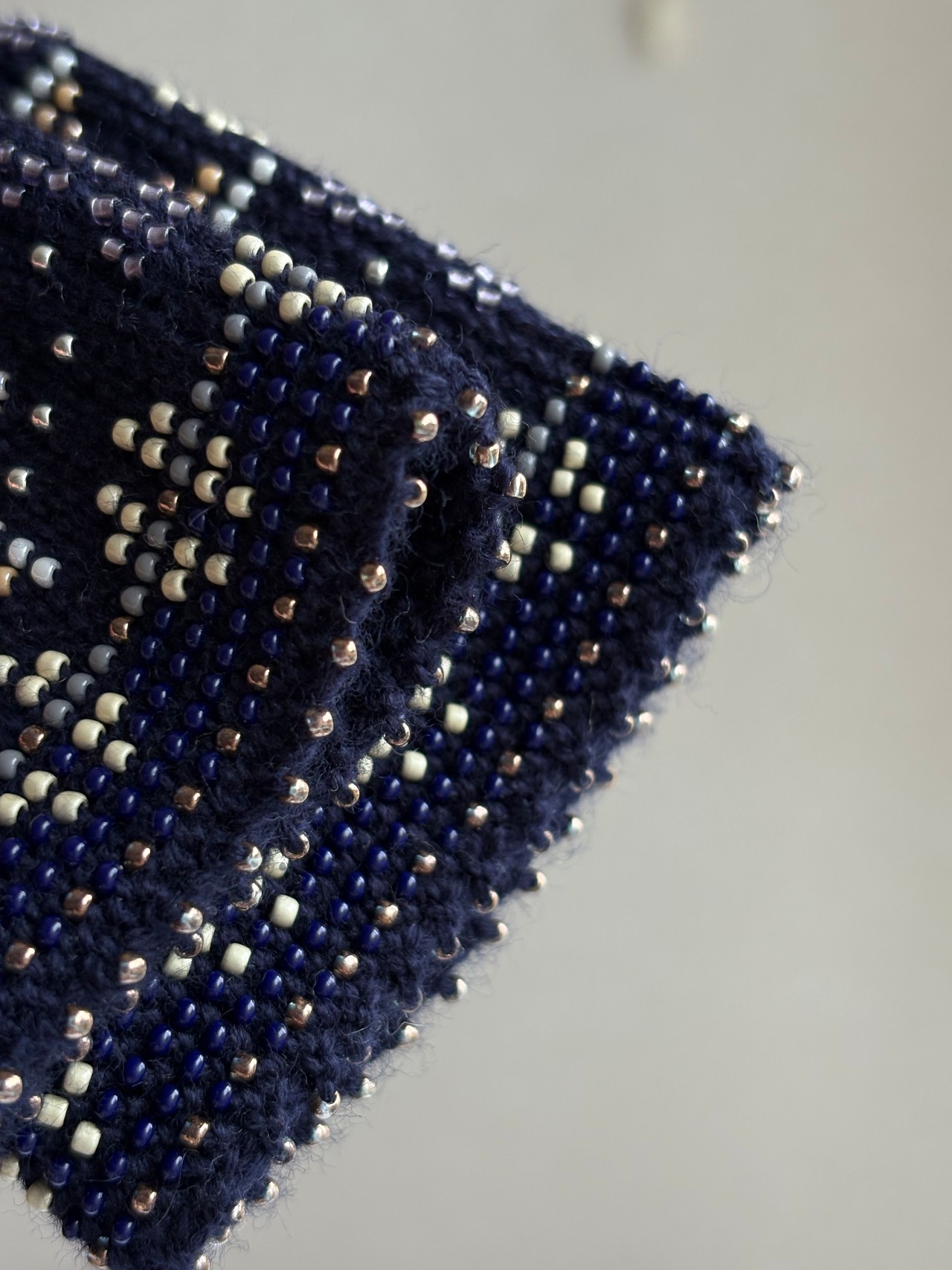 マウチは編み始める前に柄を全て計算して(図におこして)全てのビーズを毛糸に通してから細い編み棒で編むという想像もつかない大変な工程で作られています。