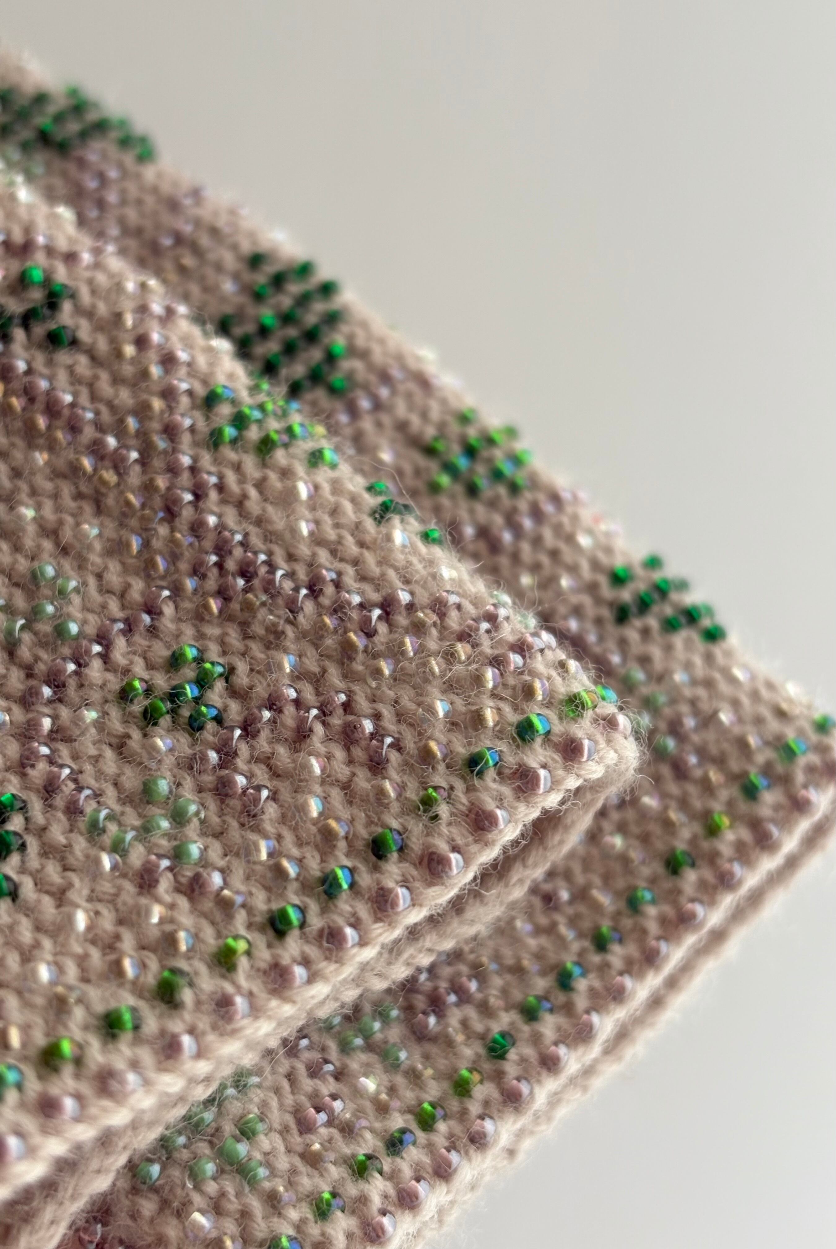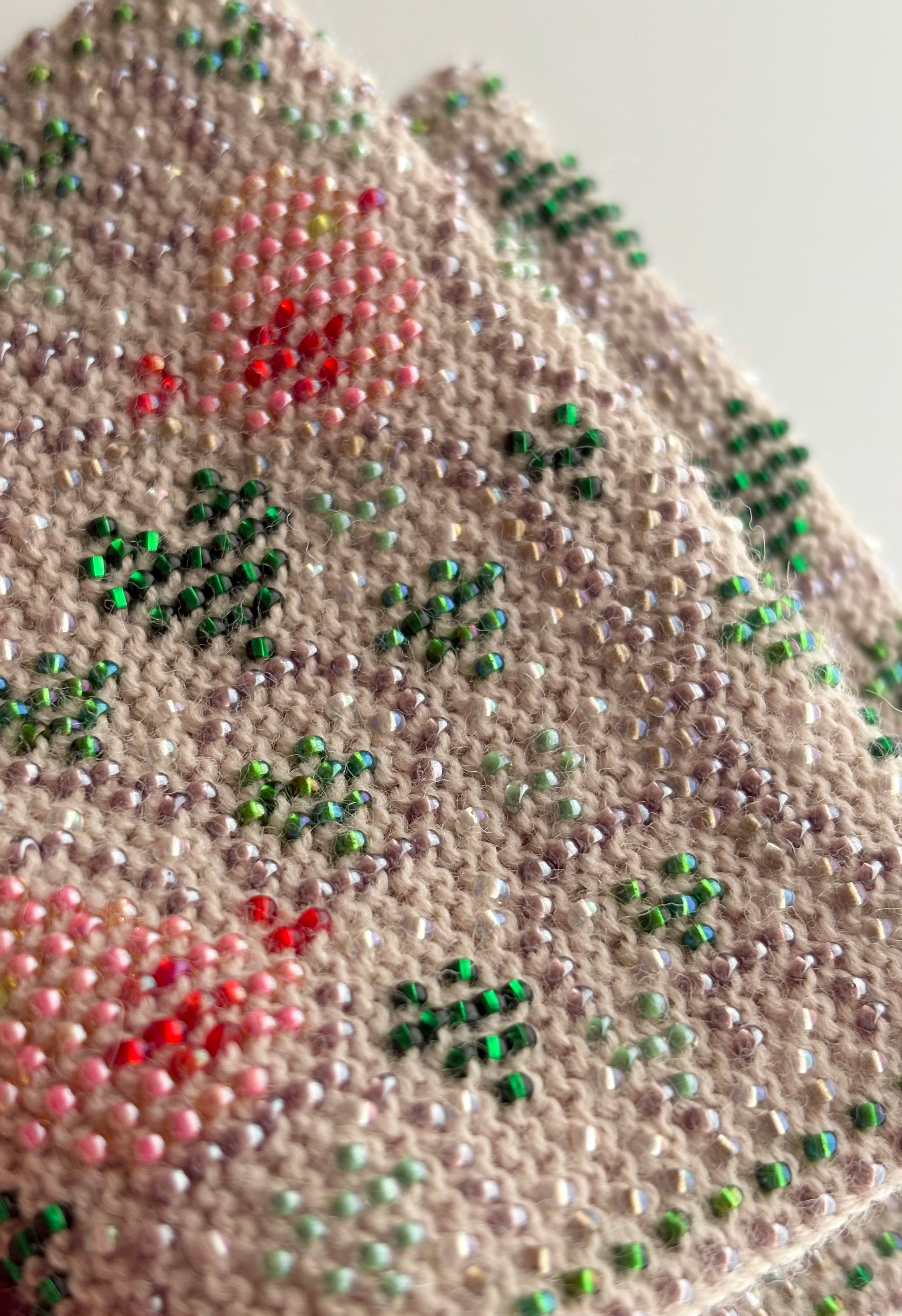 バルト三国のビーズのリストウォーマーは編み始める前に柄を全て計算して(図におこして)全てのビーズを毛糸に通してから細い編み棒で編むという想像もつかない大変な工程で作られています。