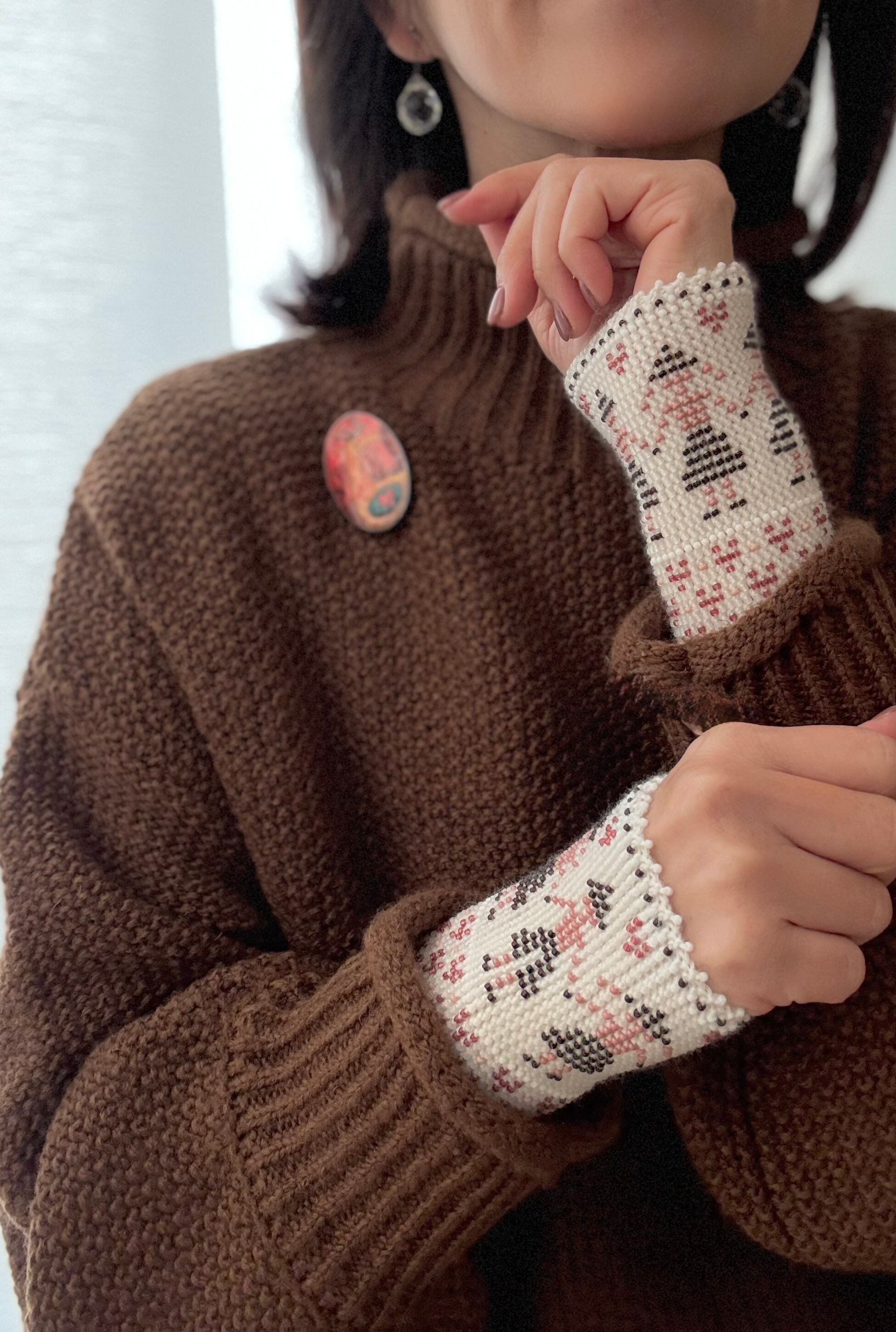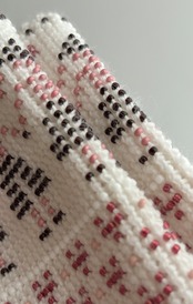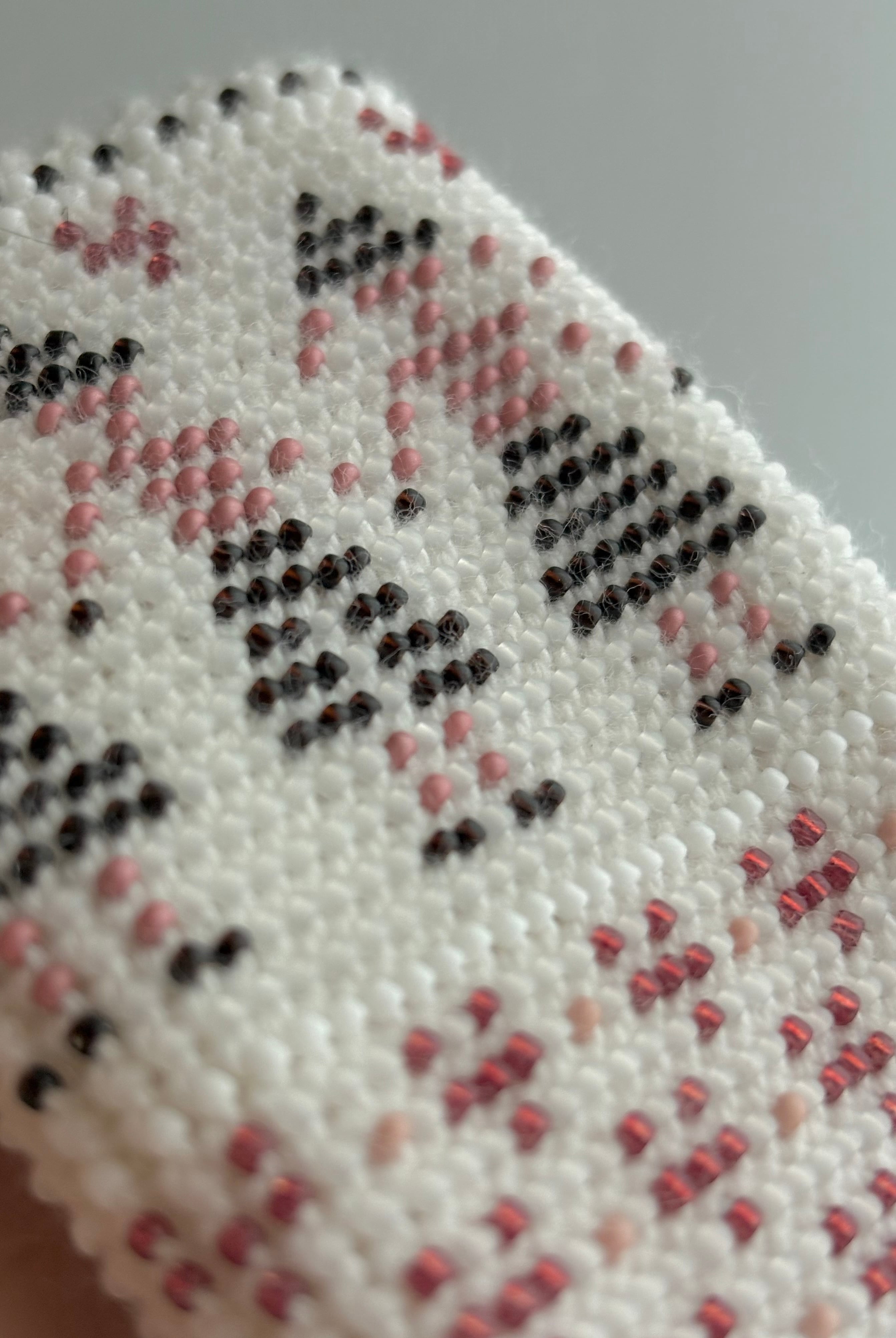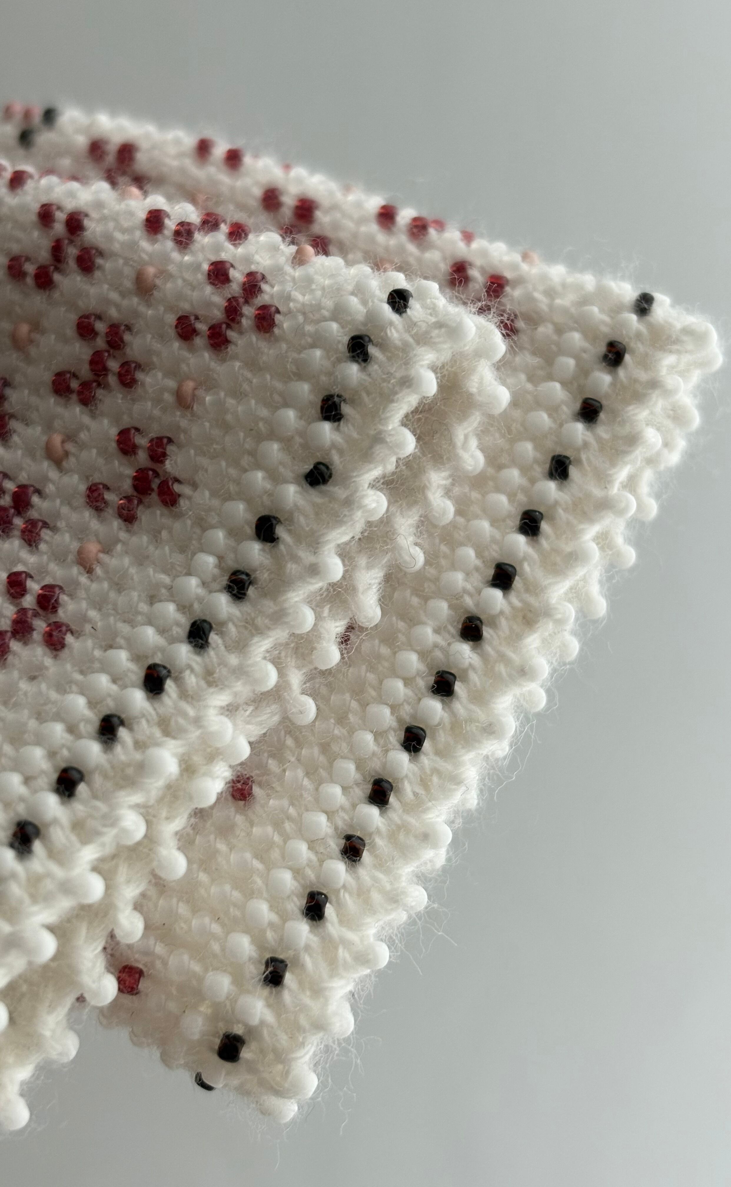 マウチは編み始める前に柄を全て計算して(図におこして)全てのビーズを毛糸に通してから細い編み棒で編むという想像もつかない大変な工程で作られています。