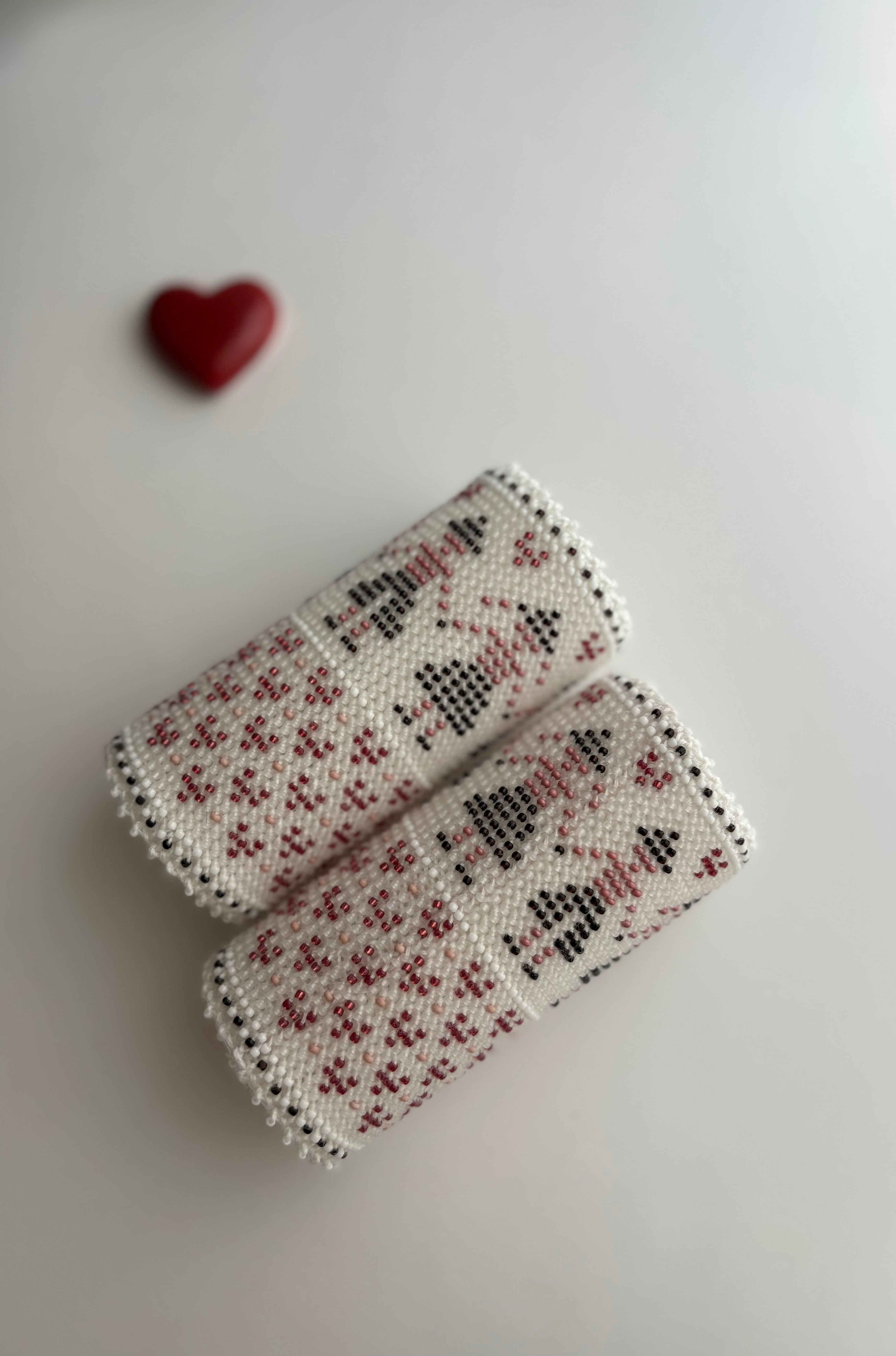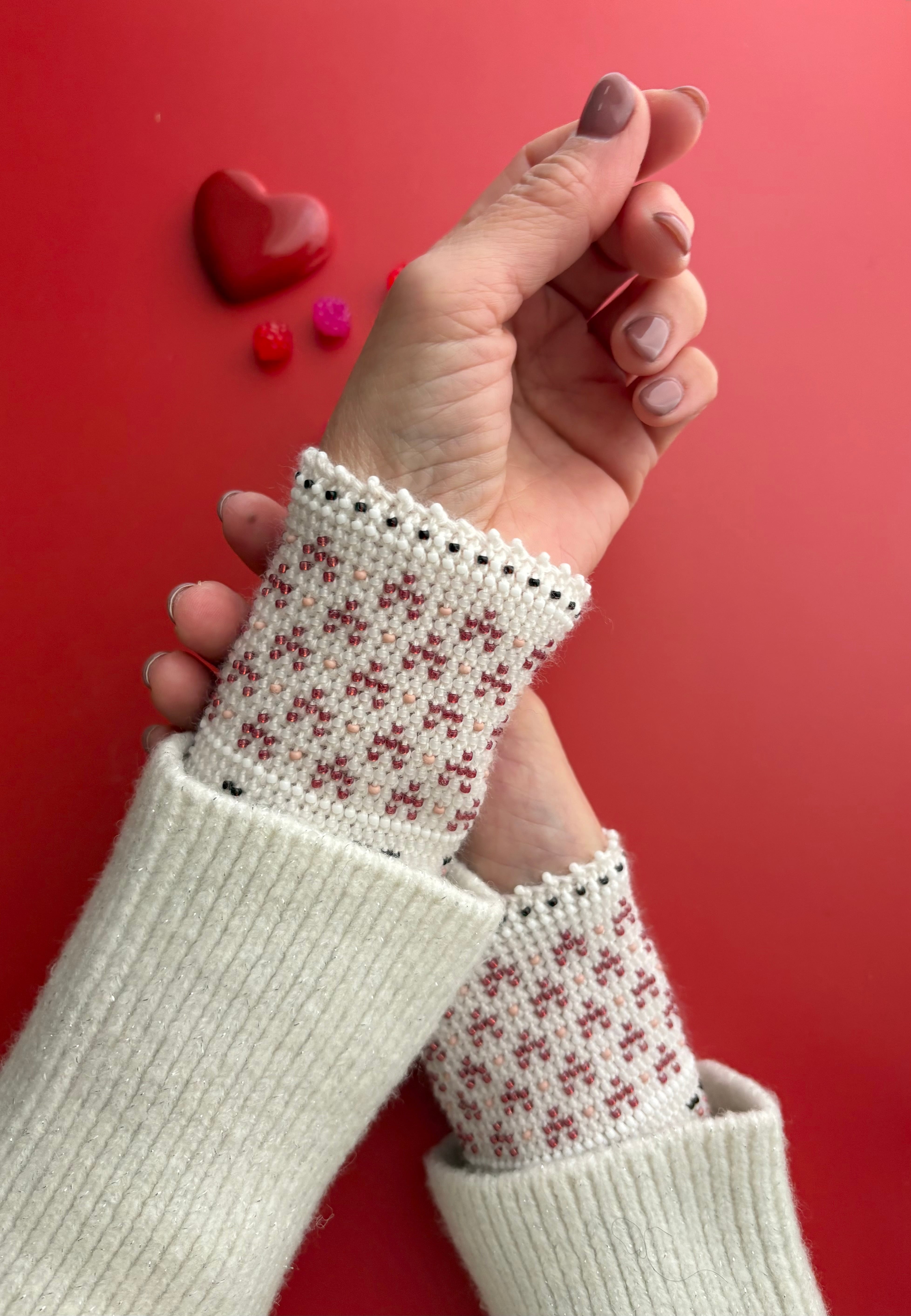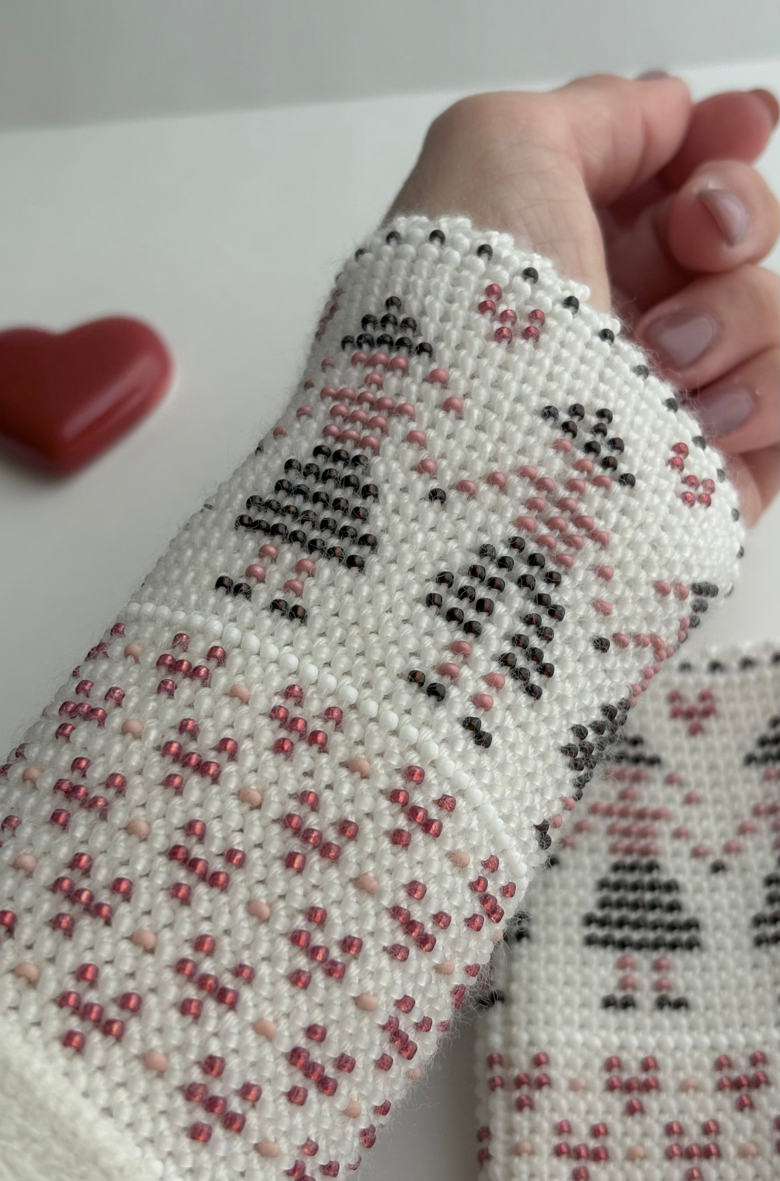 マウチは編み始める前に柄を全て計算して(図におこして)全てのビーズを毛糸に通してから細い編み棒で編むという想像もつかない大変な工程で作られています。