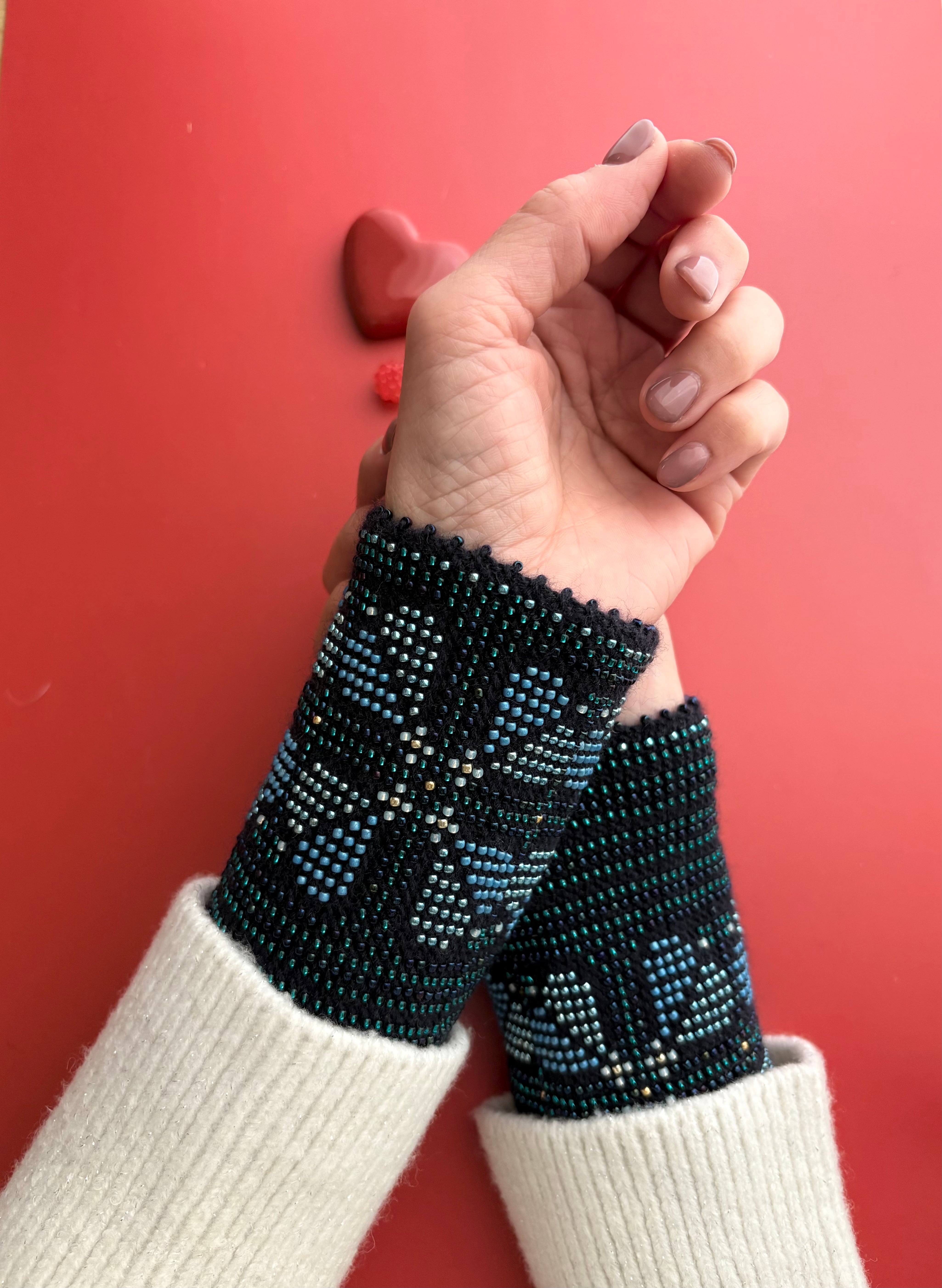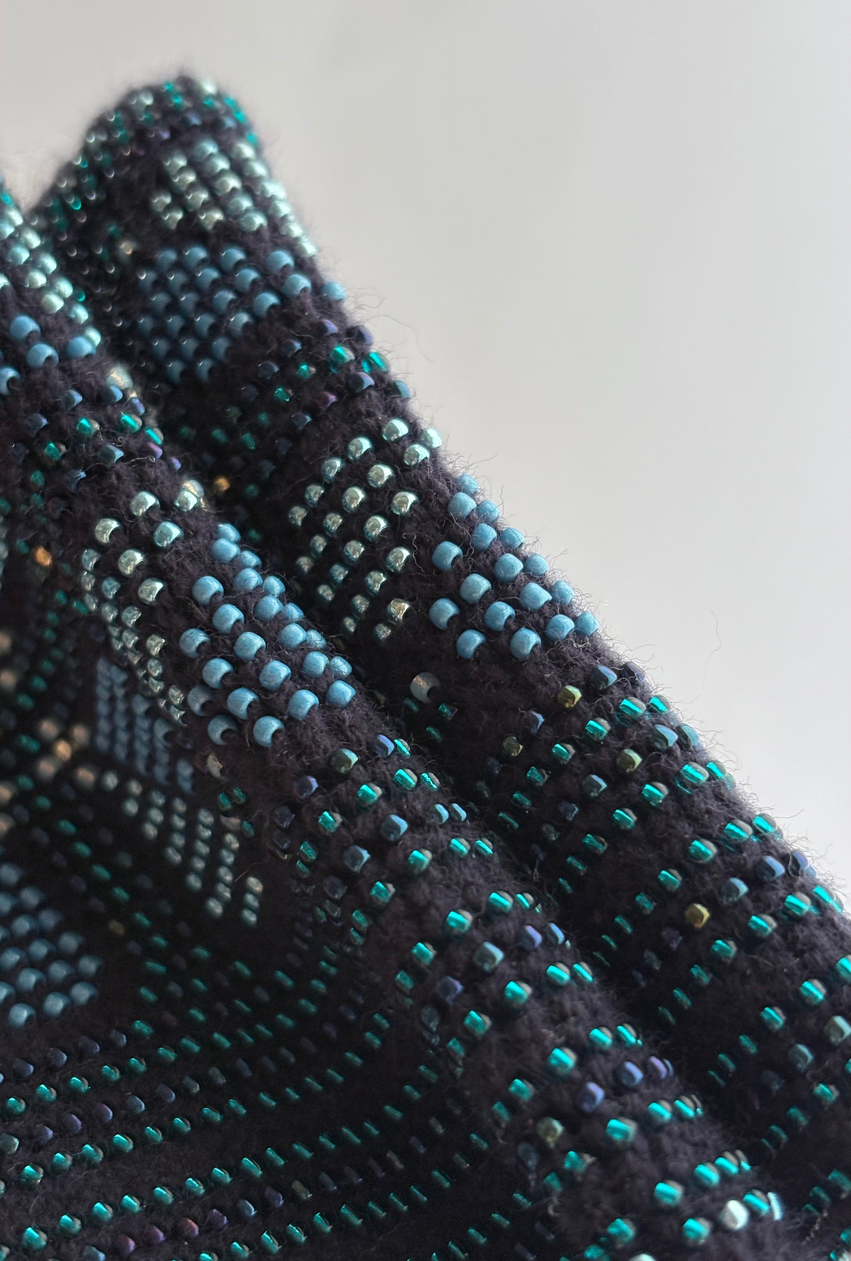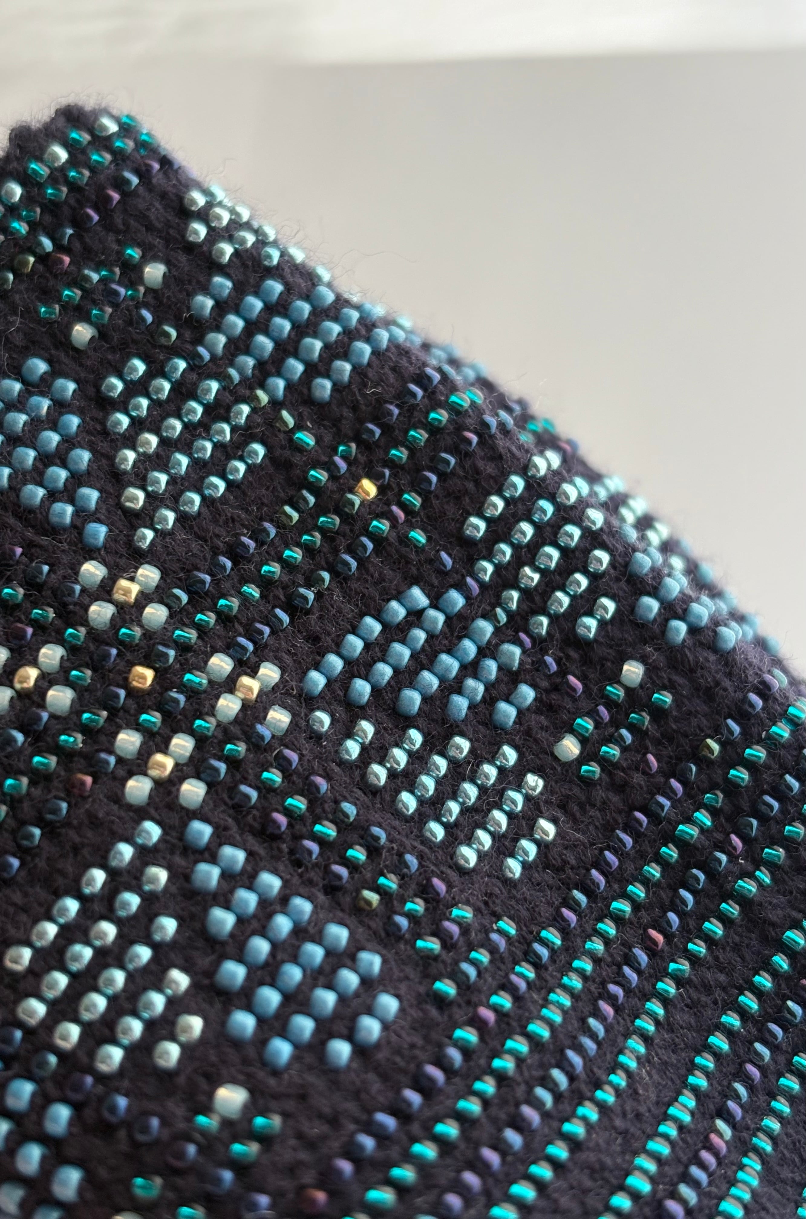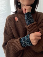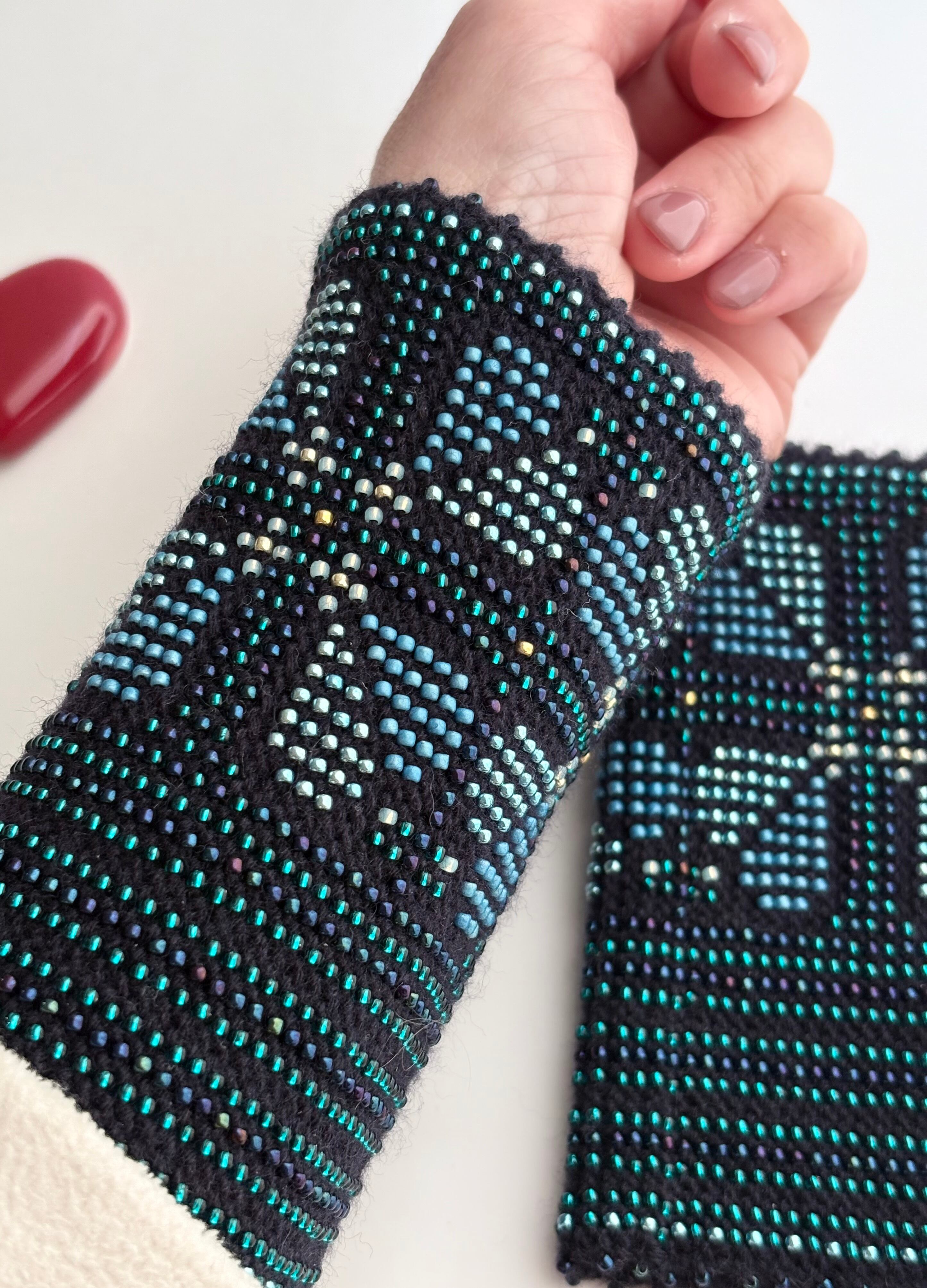 マウチは編み始める前に柄を全て計算して(図におこして)全てのビーズを毛糸に通してから細い編み棒で編むという想像もつかない大変な工程で作られています。