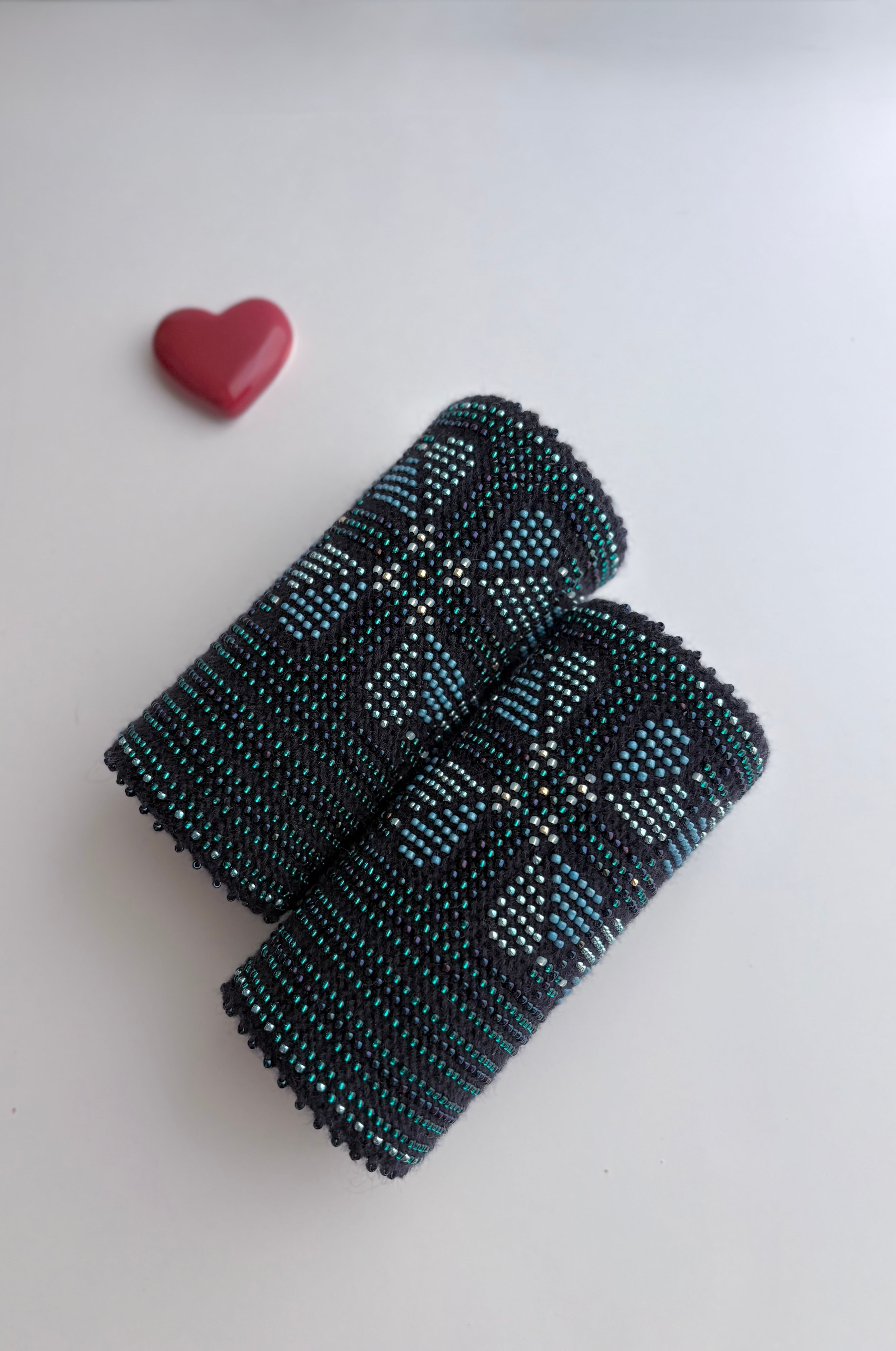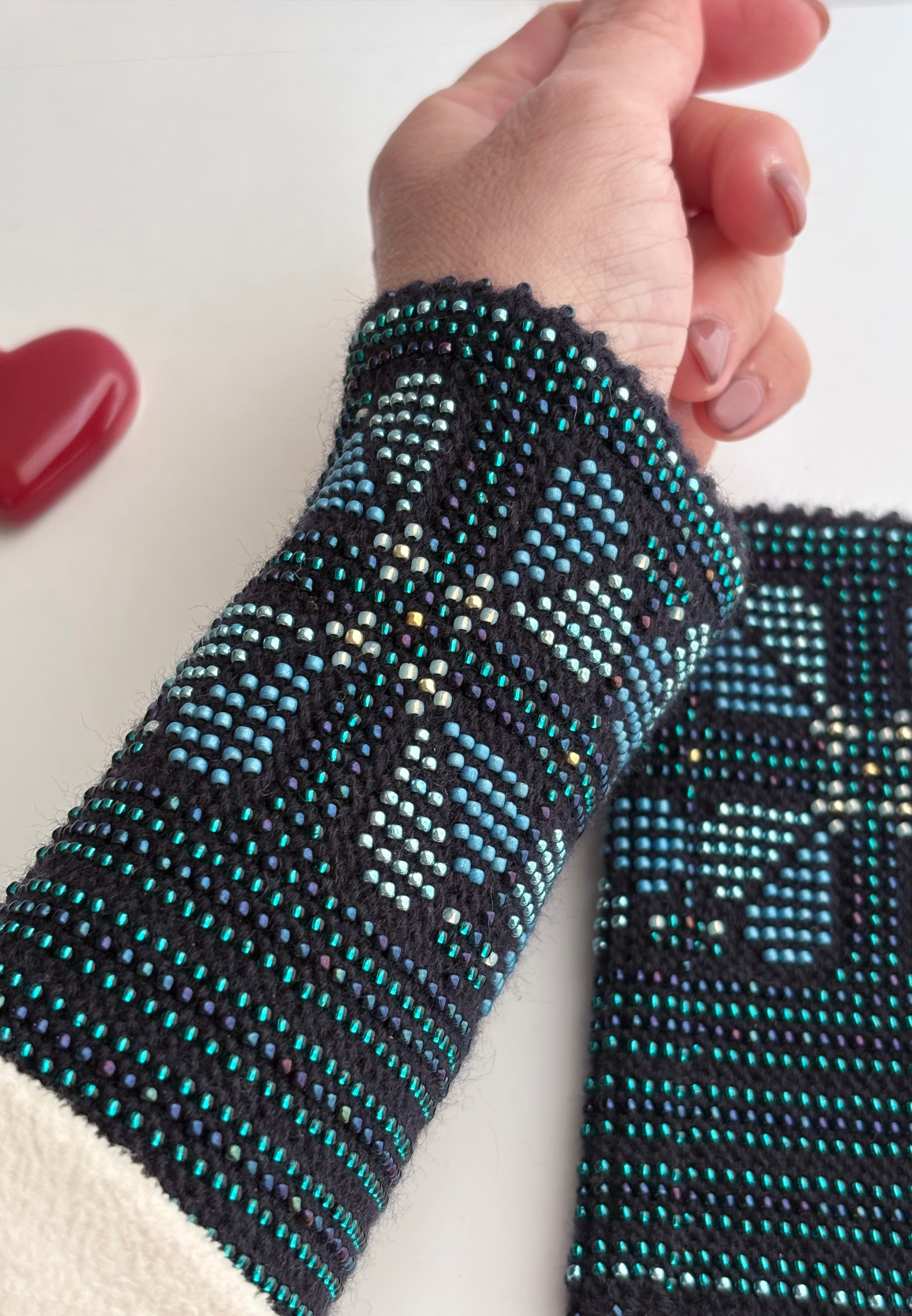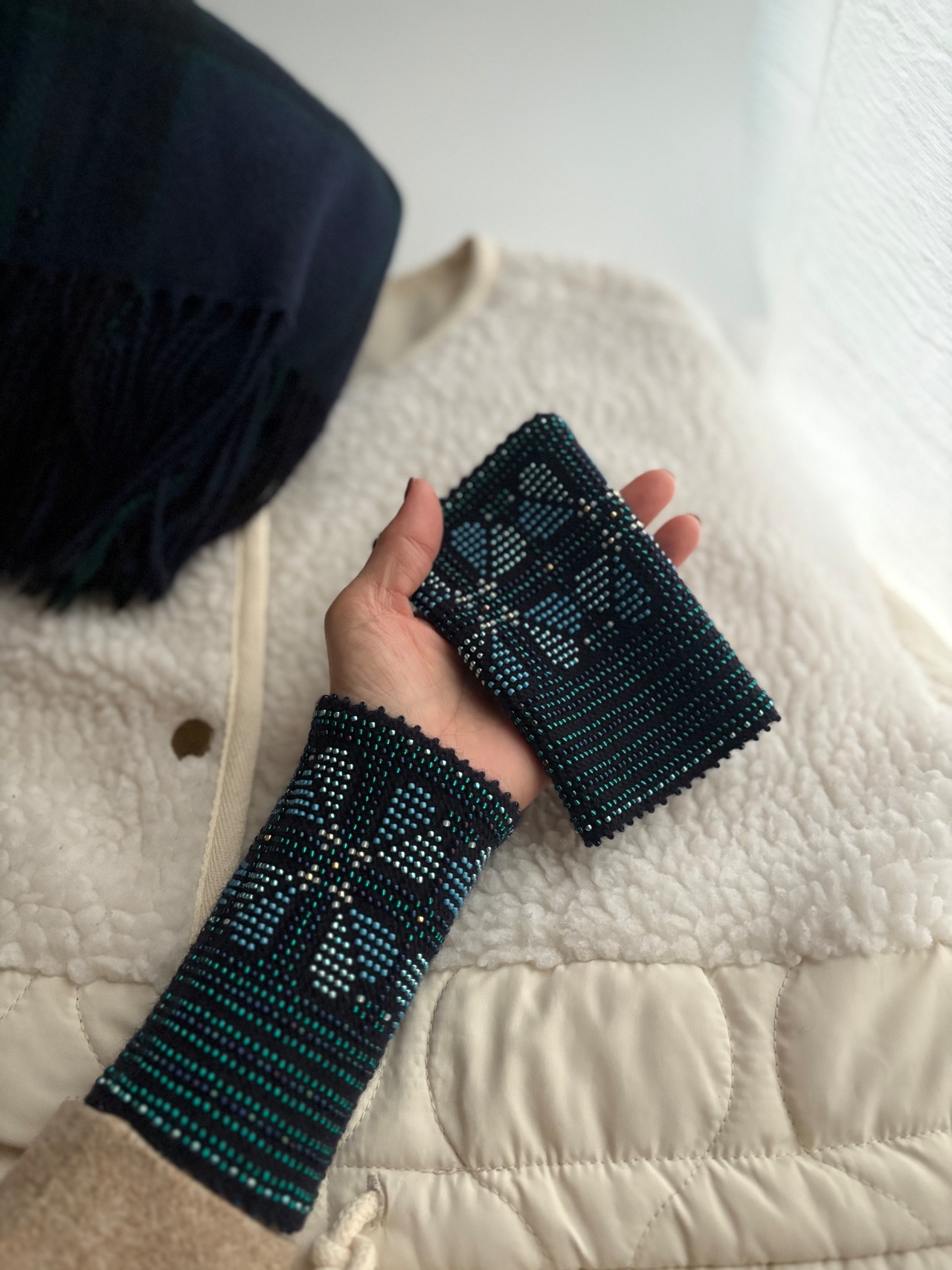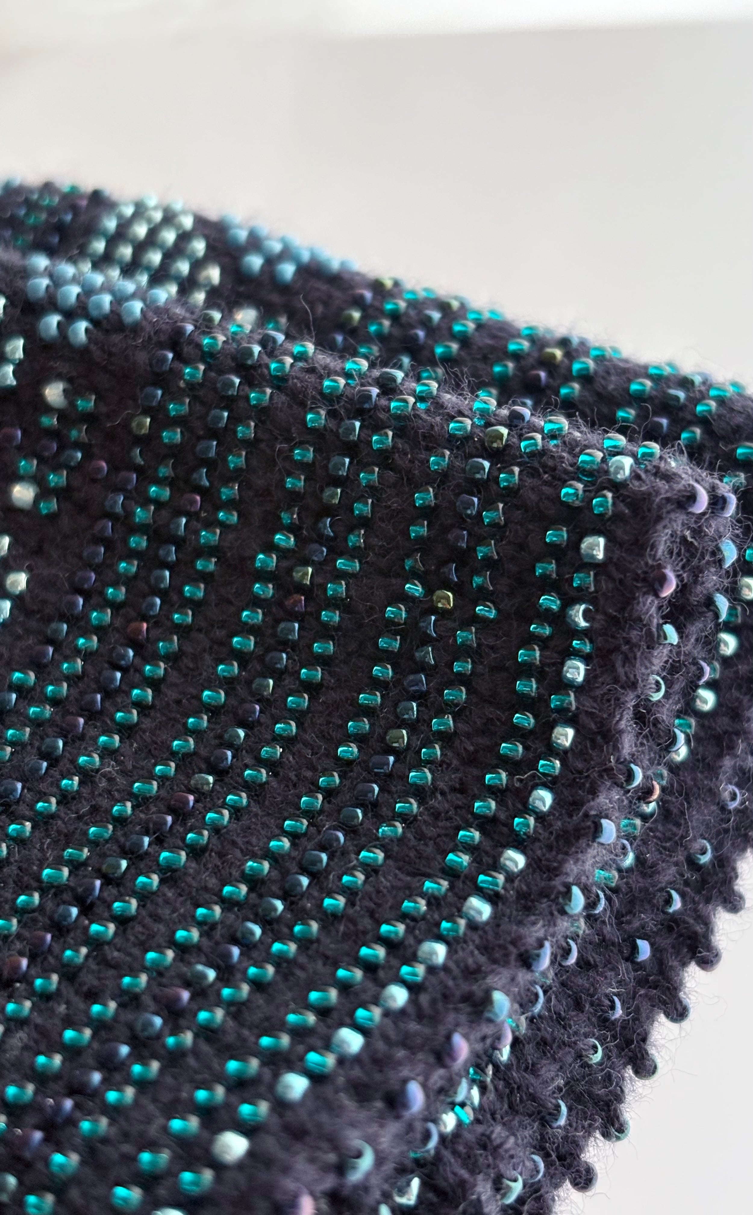 マウチは編み始める前に柄を全て計算して(図におこして)全てのビーズを毛糸に通してから細い編み棒で編むという想像もつかない大変な工程で作られています。