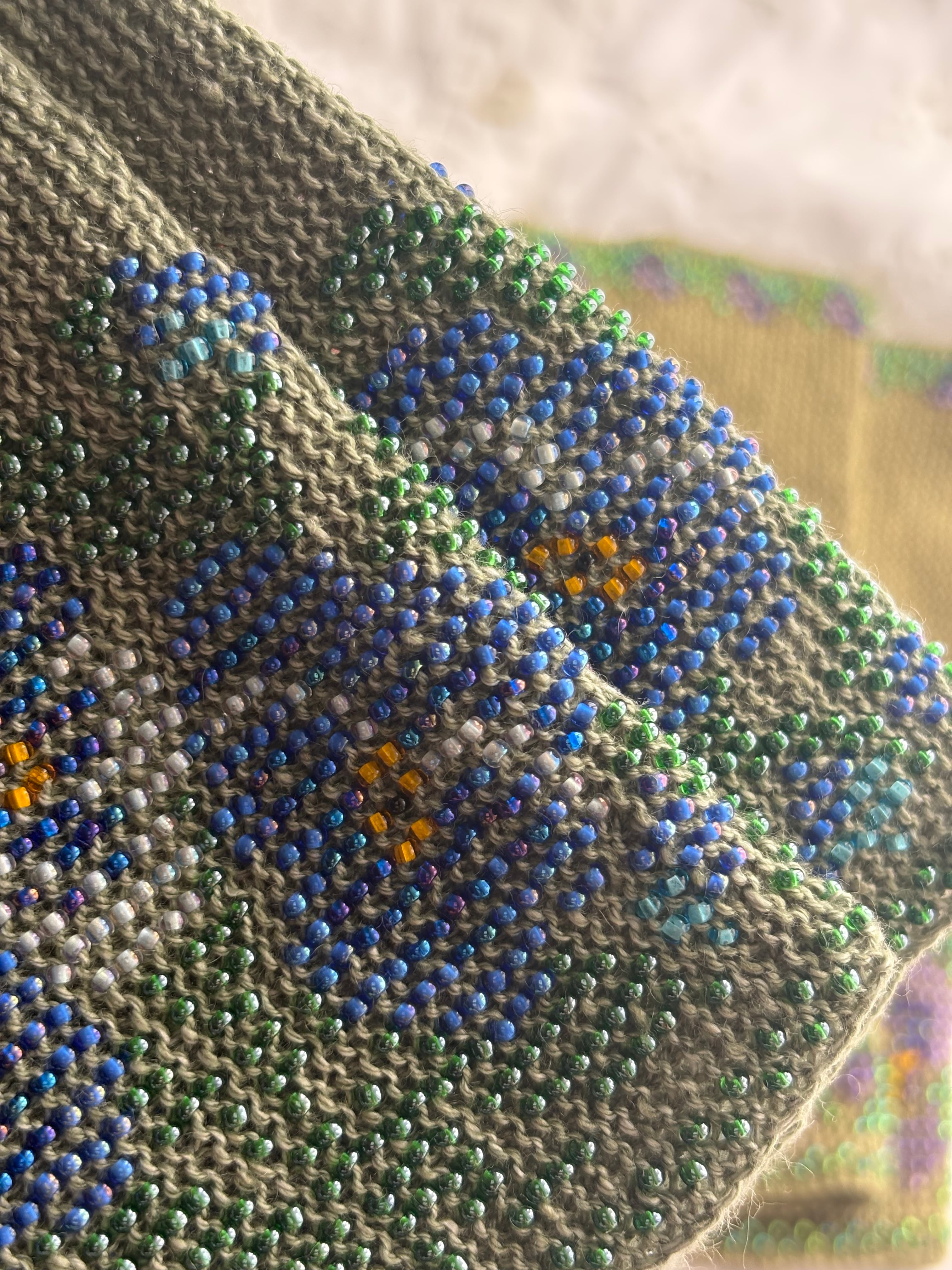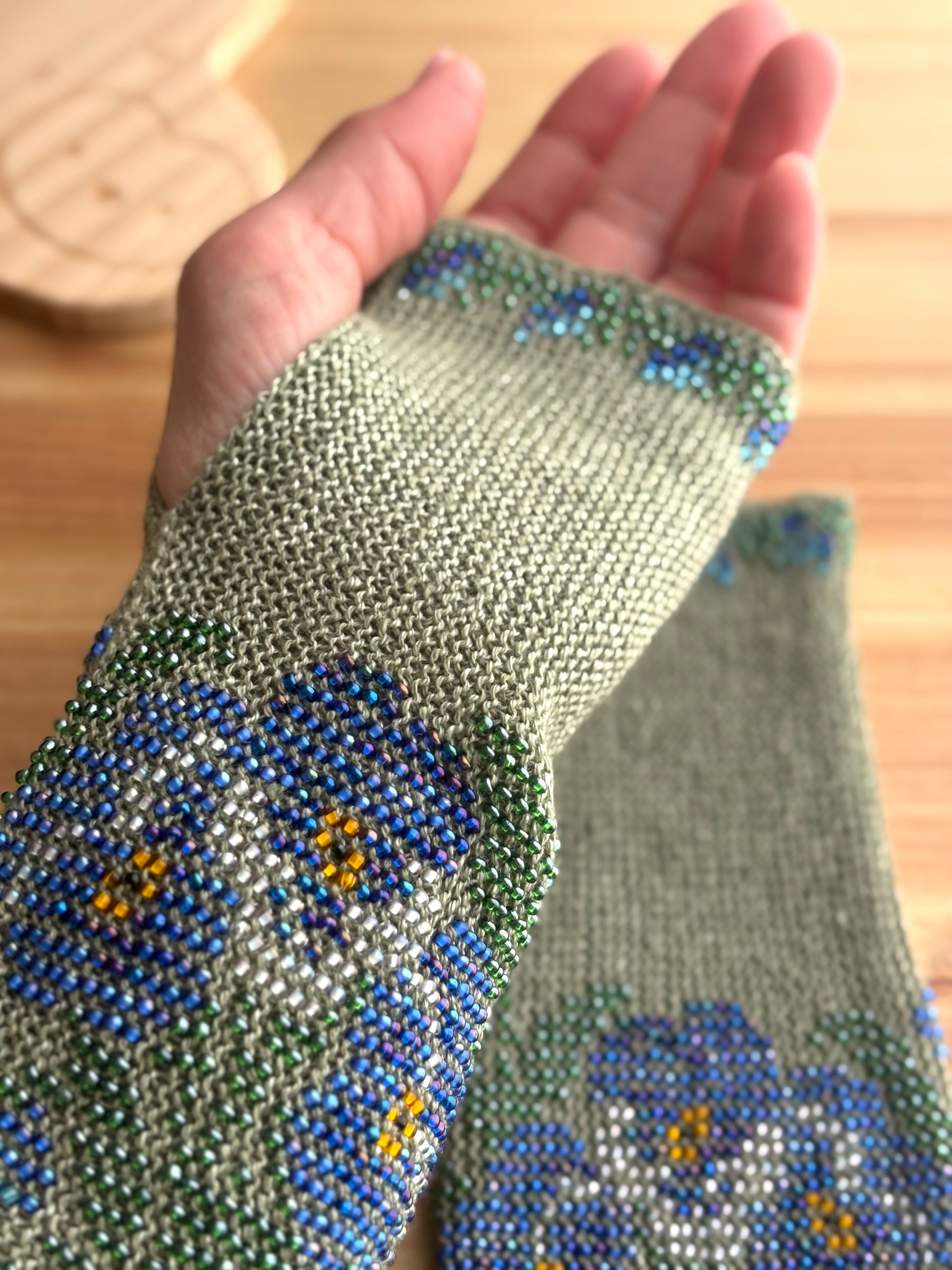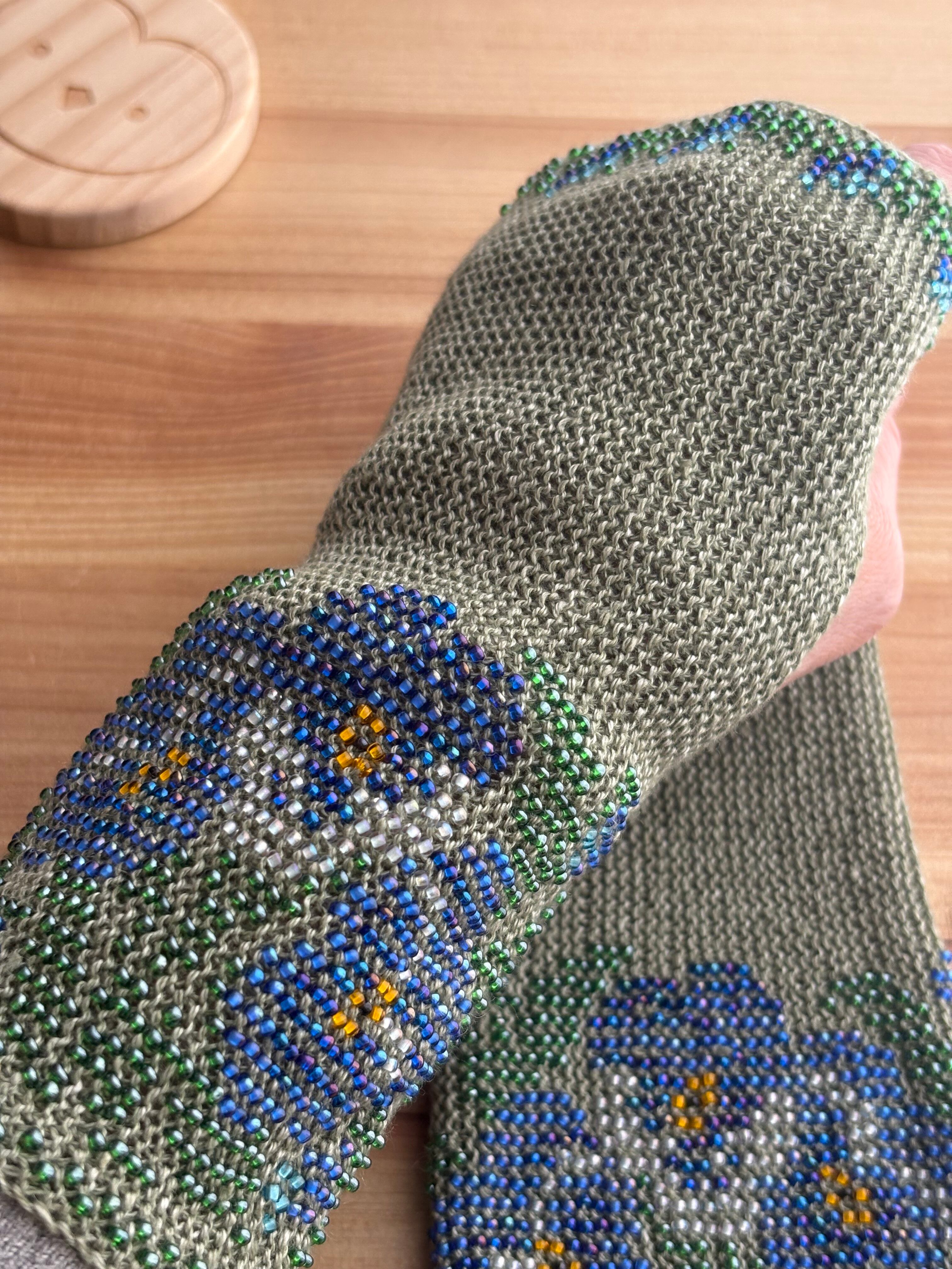 バルト三国のビーズのリストウォーマーは編み始める前に柄を全て計算して(図におこして)全てのビーズを毛糸に通してから細い編み棒で編むという想像もつかない大変な工程で作られています。