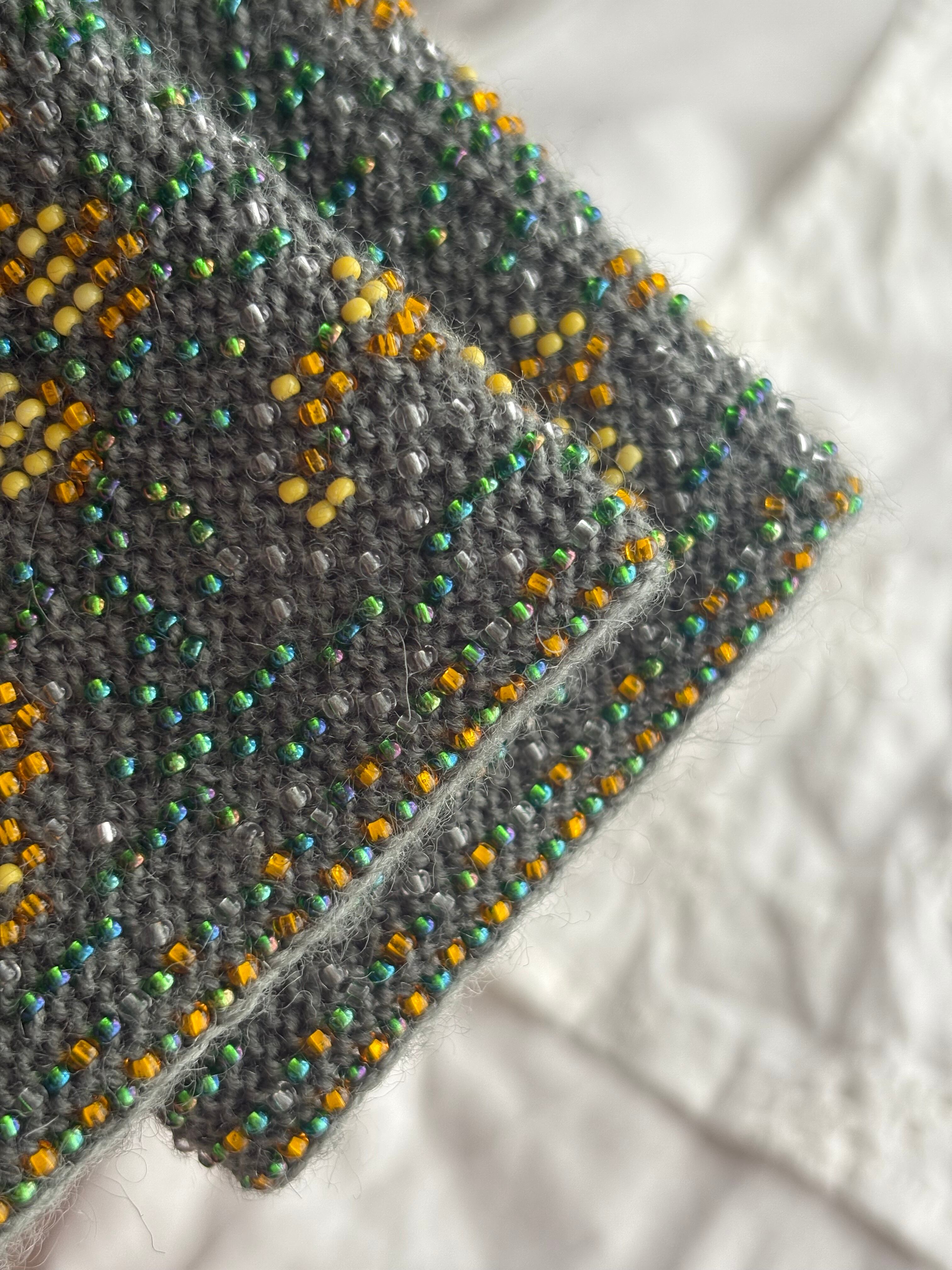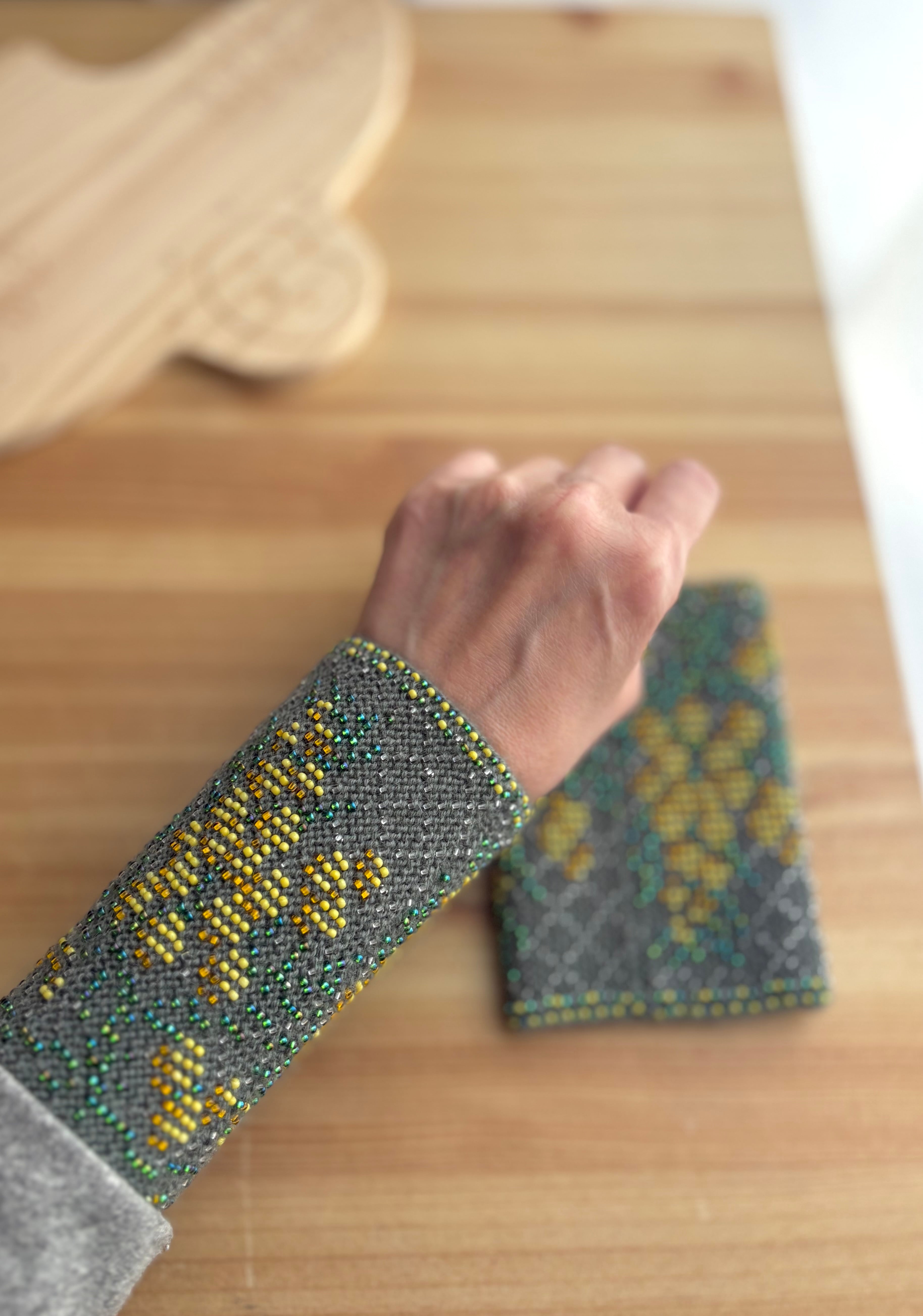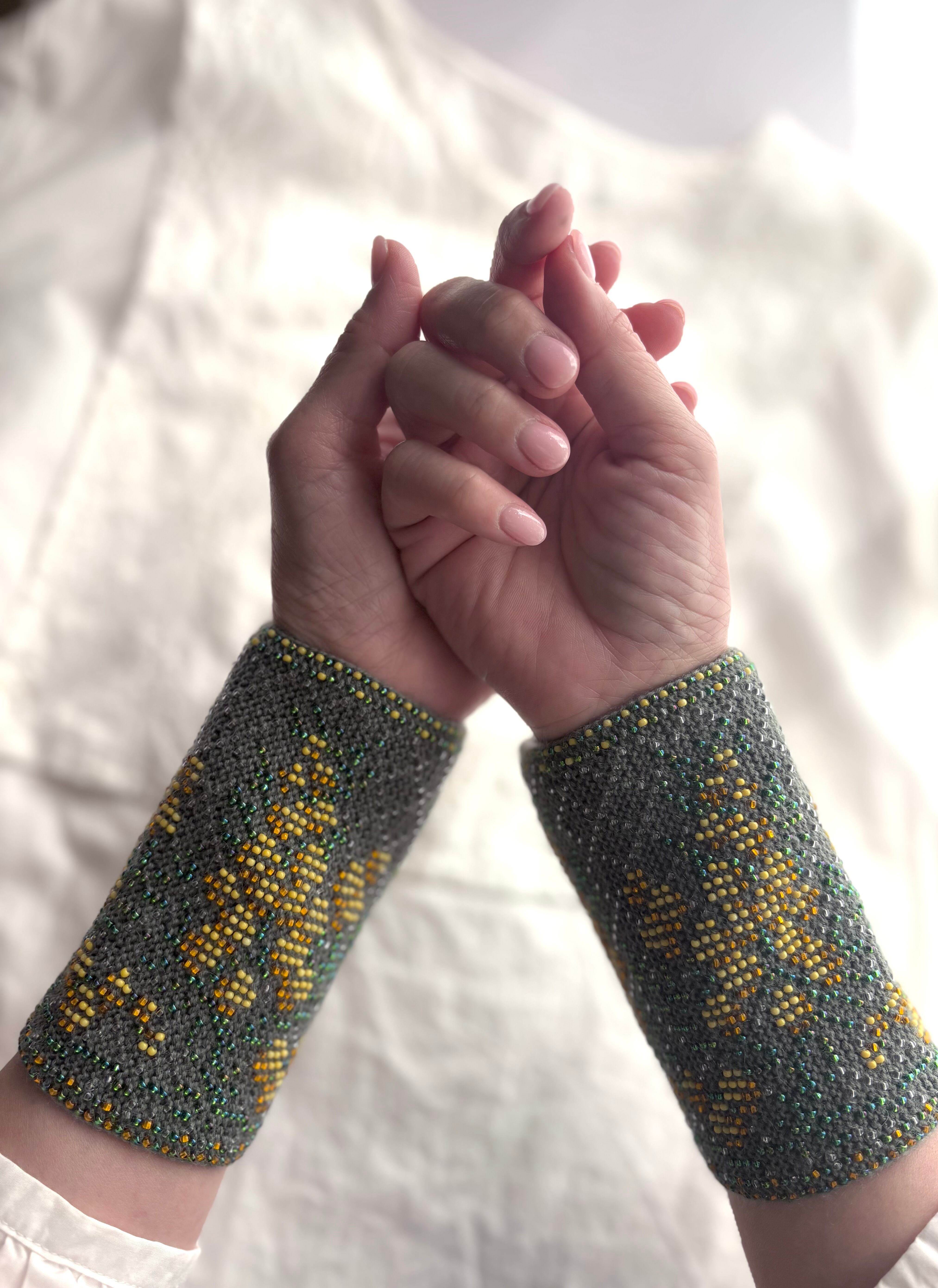 バルト三国のビーズのリストウォーマーは編み始める前に柄を全て計算して(図におこして)全てのビーズを毛糸に通してから細い編み棒で編むという想像もつかない大変な工程で作られています。