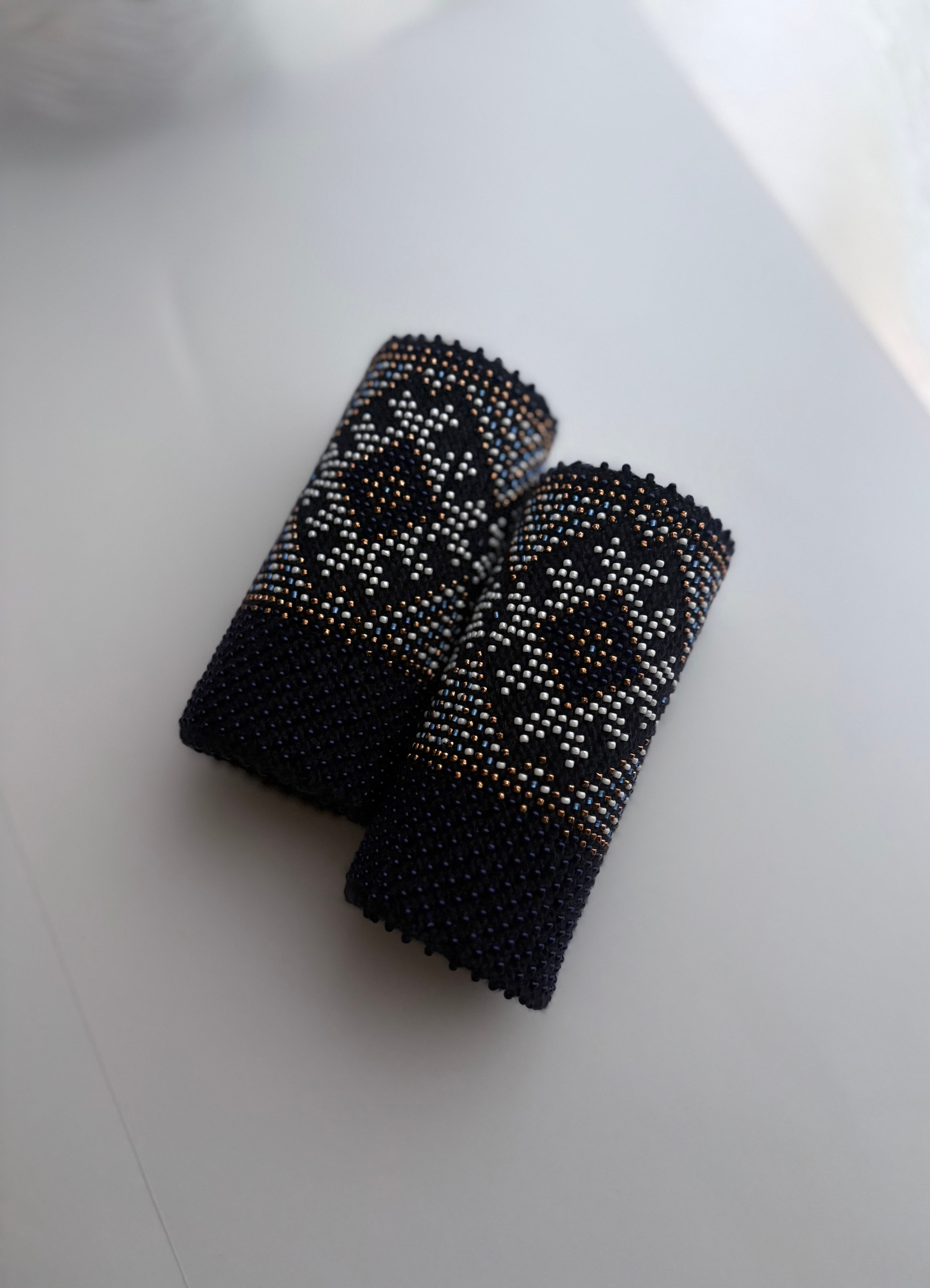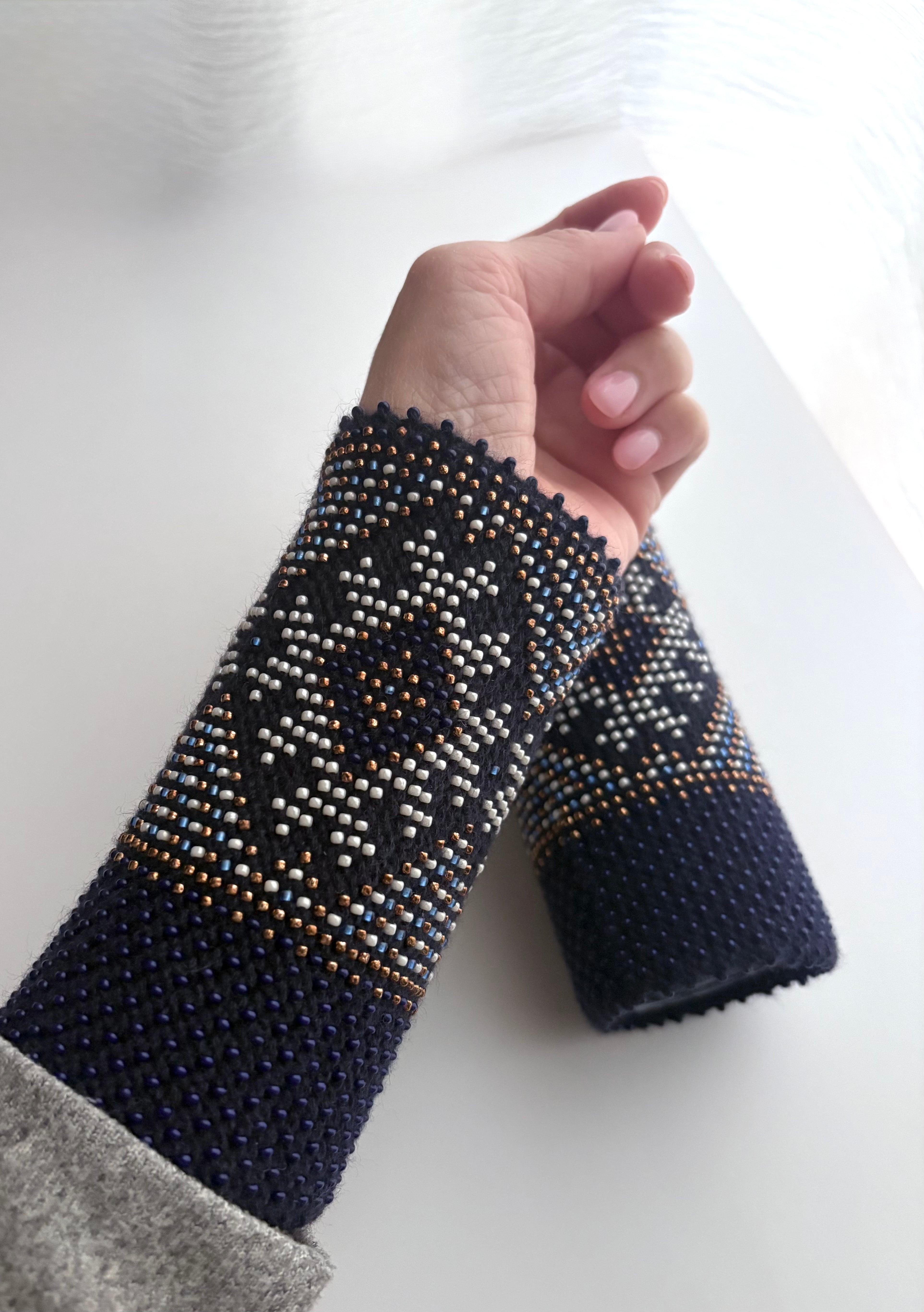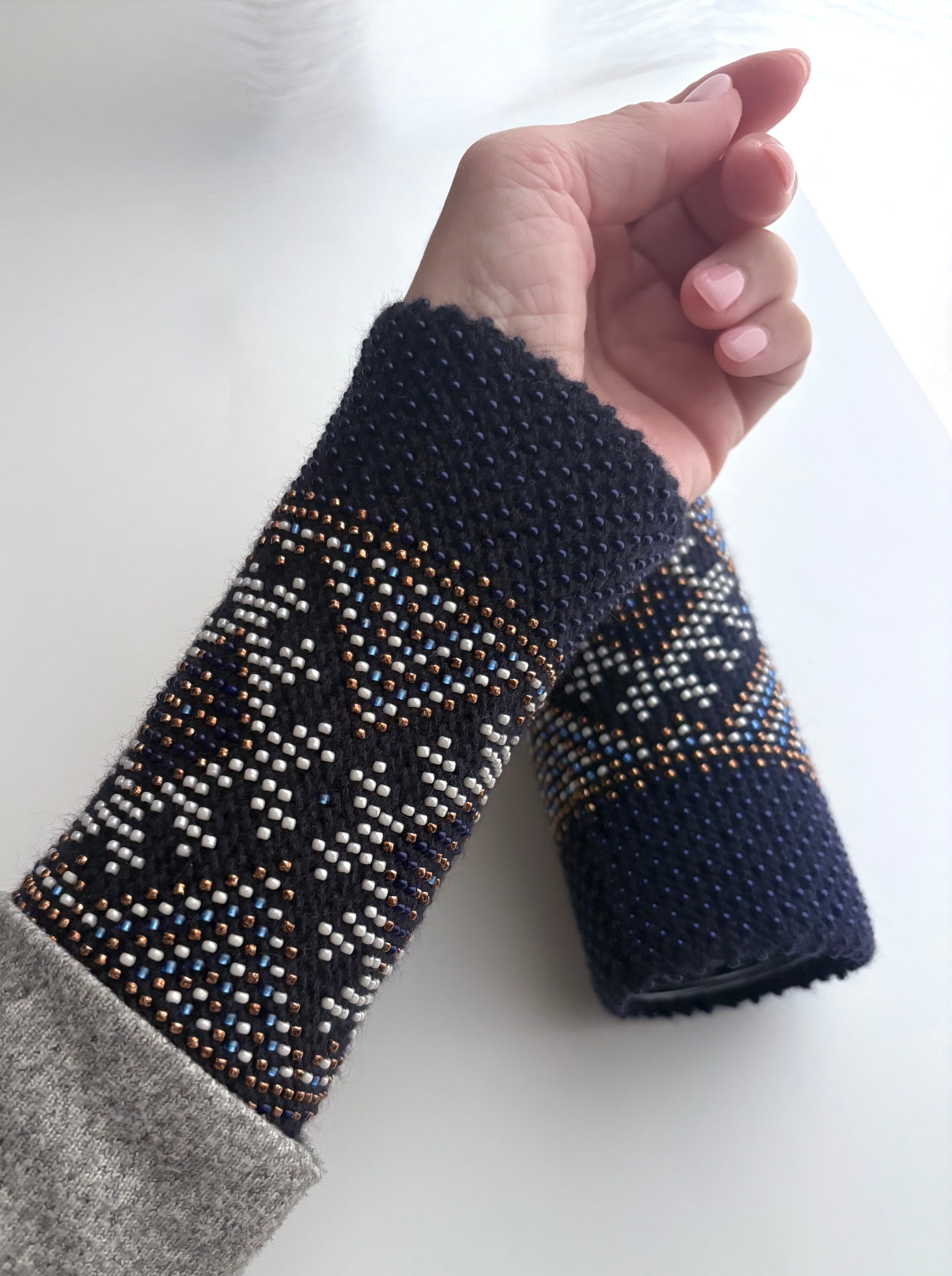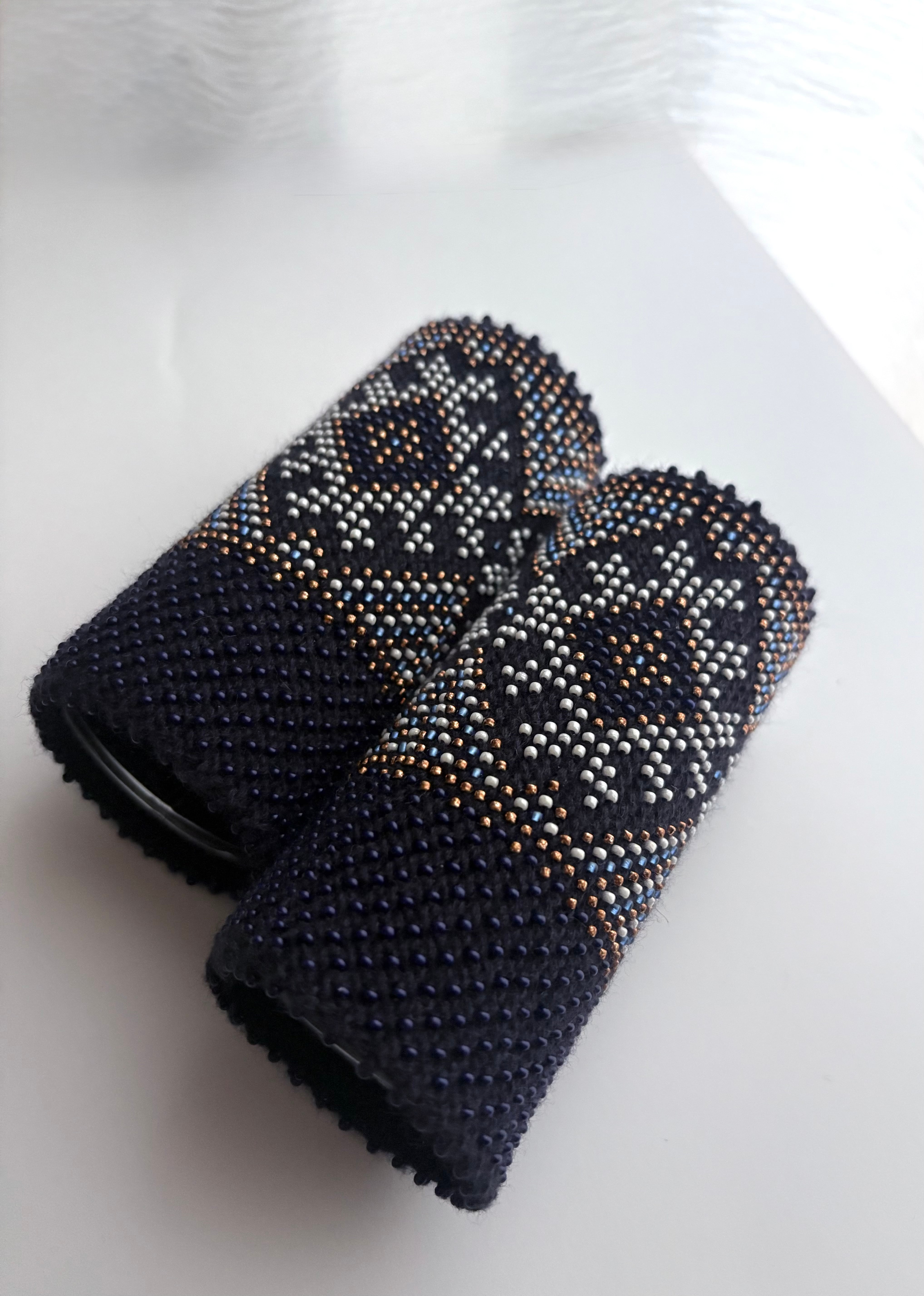 マウチは編み始める前に柄を全て計算して(図におこして)全てのビーズを毛糸に通してから細い編み棒で編むという想像もつかない大変な工程で作られています。