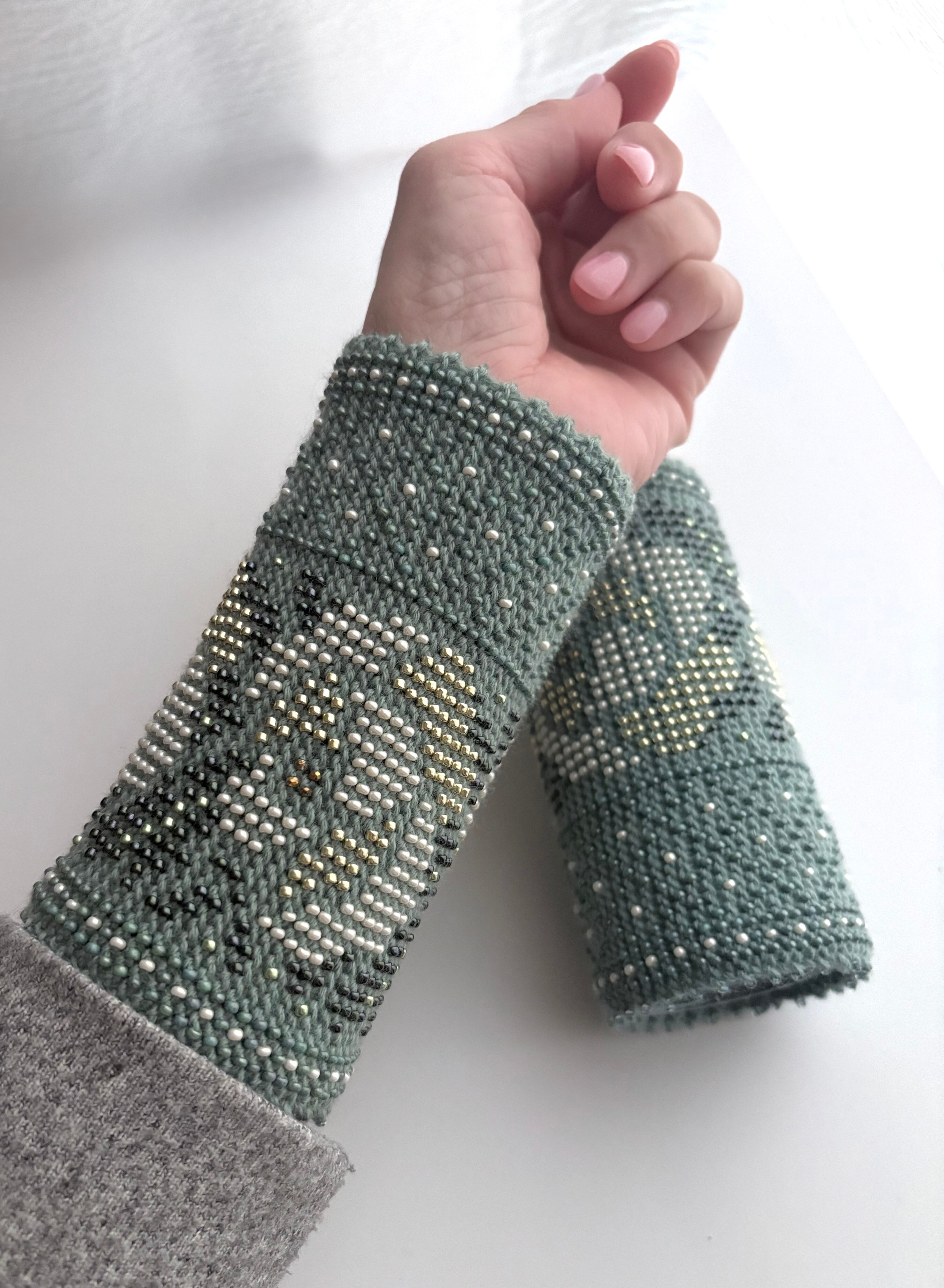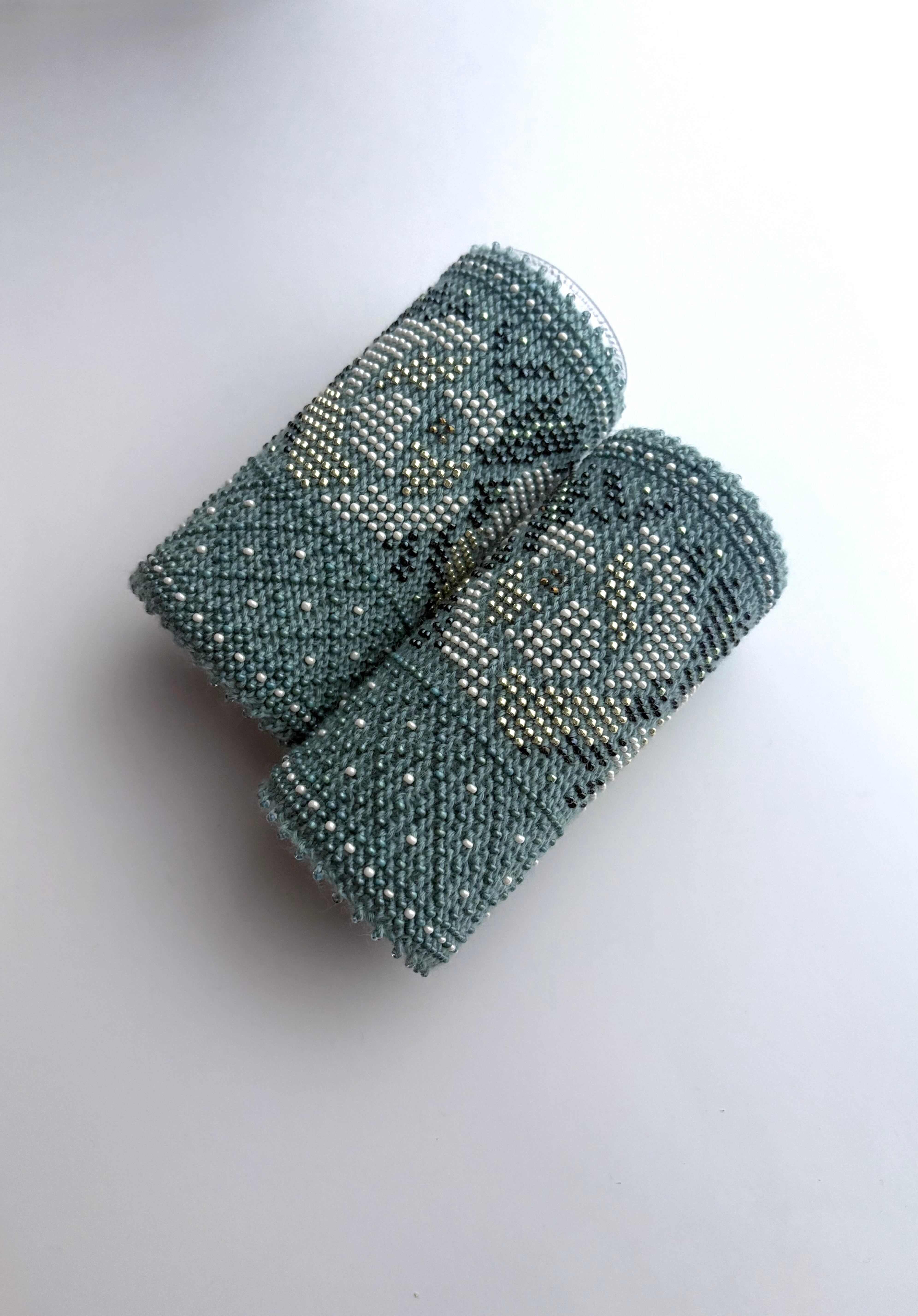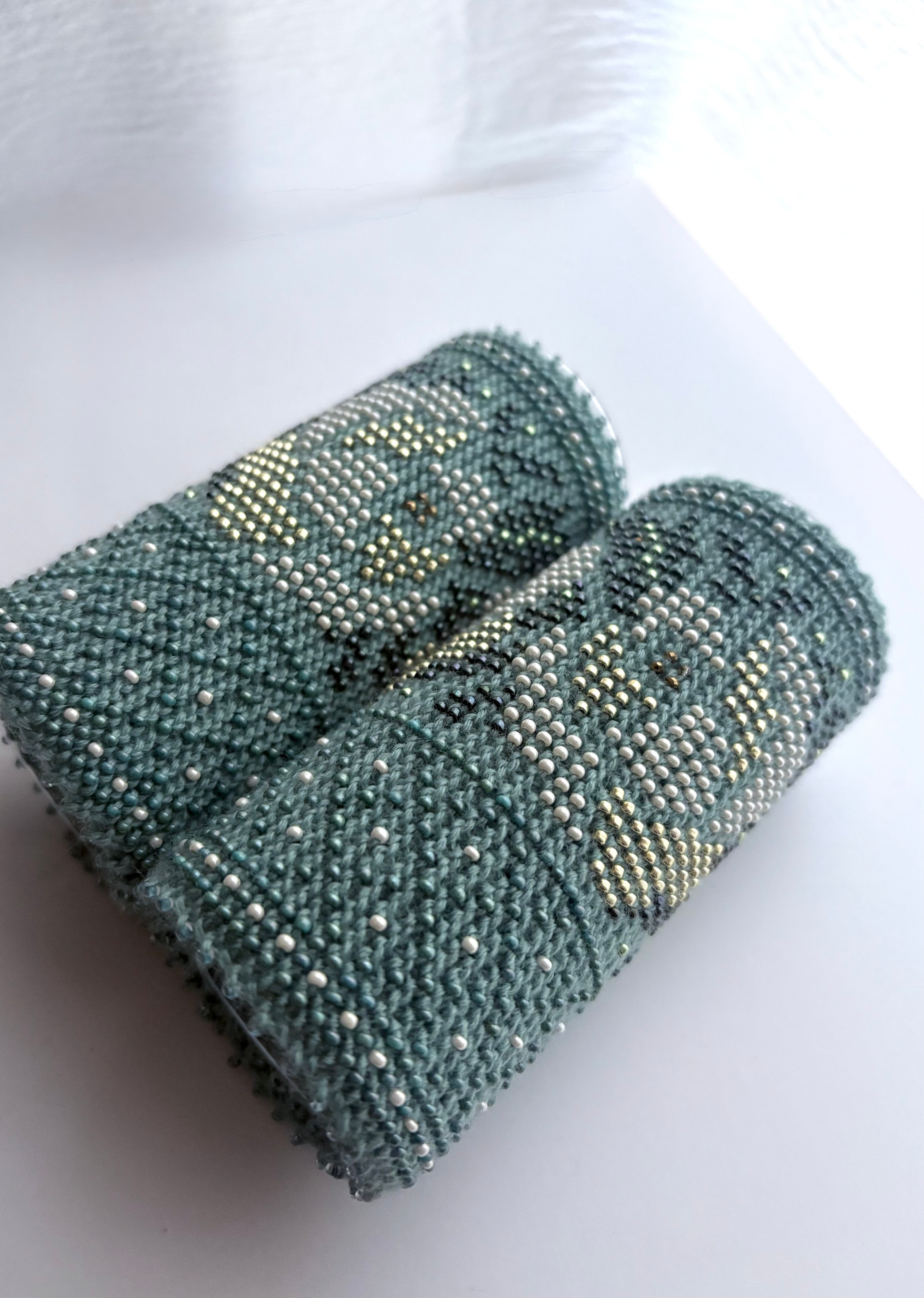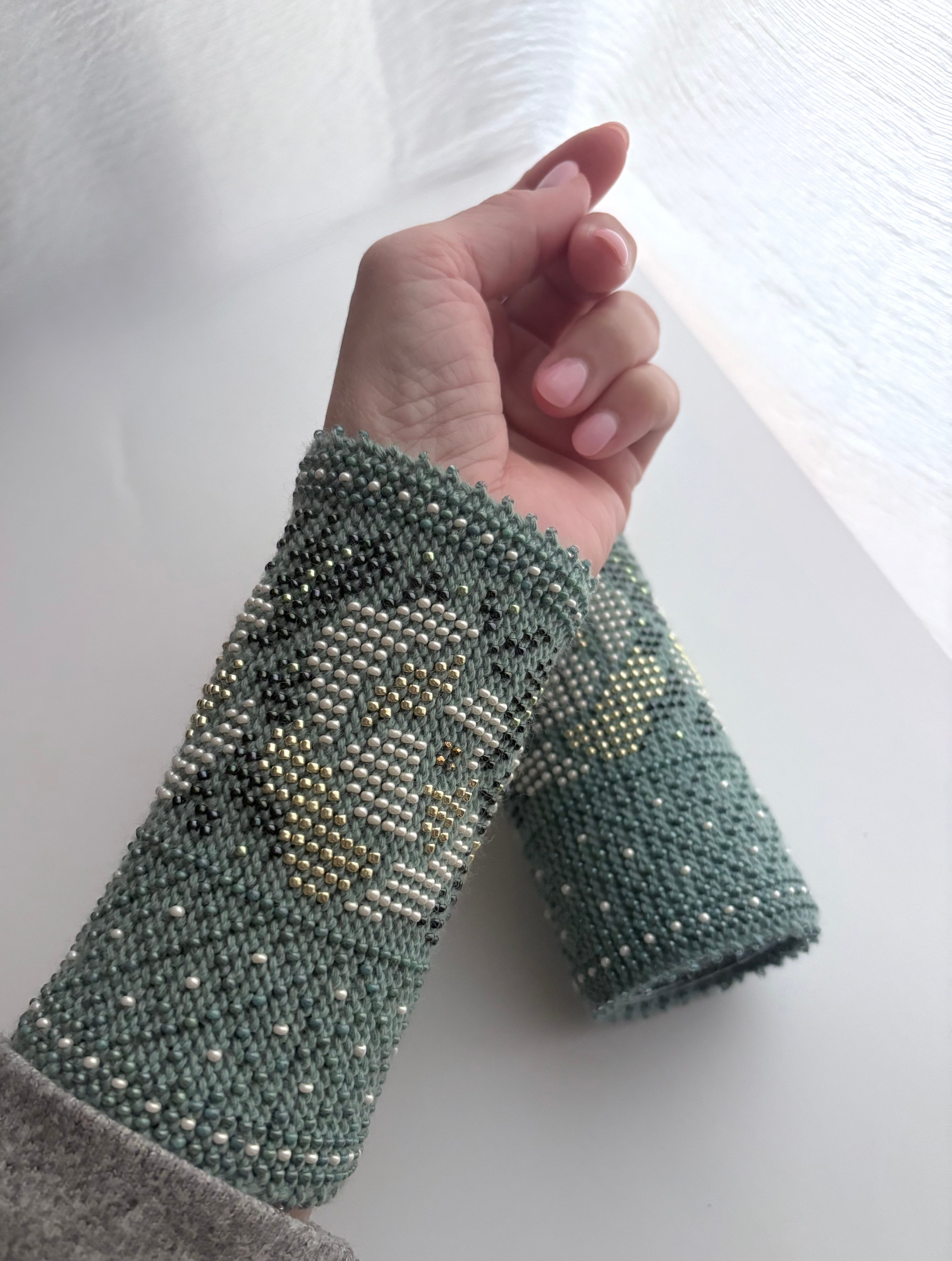 マウチは編み始める前に柄を全て計算して(図におこして)全てのビーズを毛糸に通してから細い編み棒で編むという想像もつかない大変な工程で作られています。