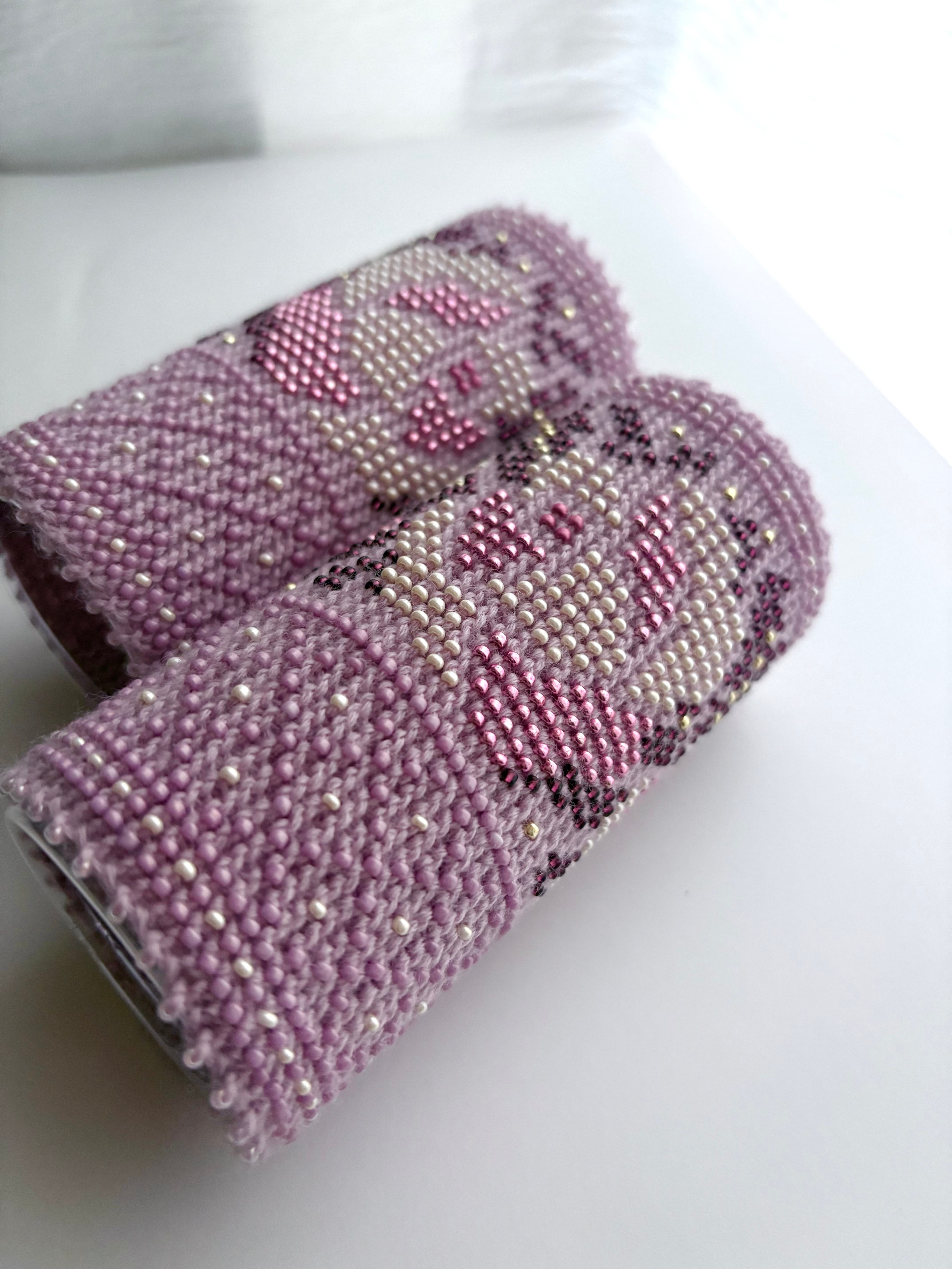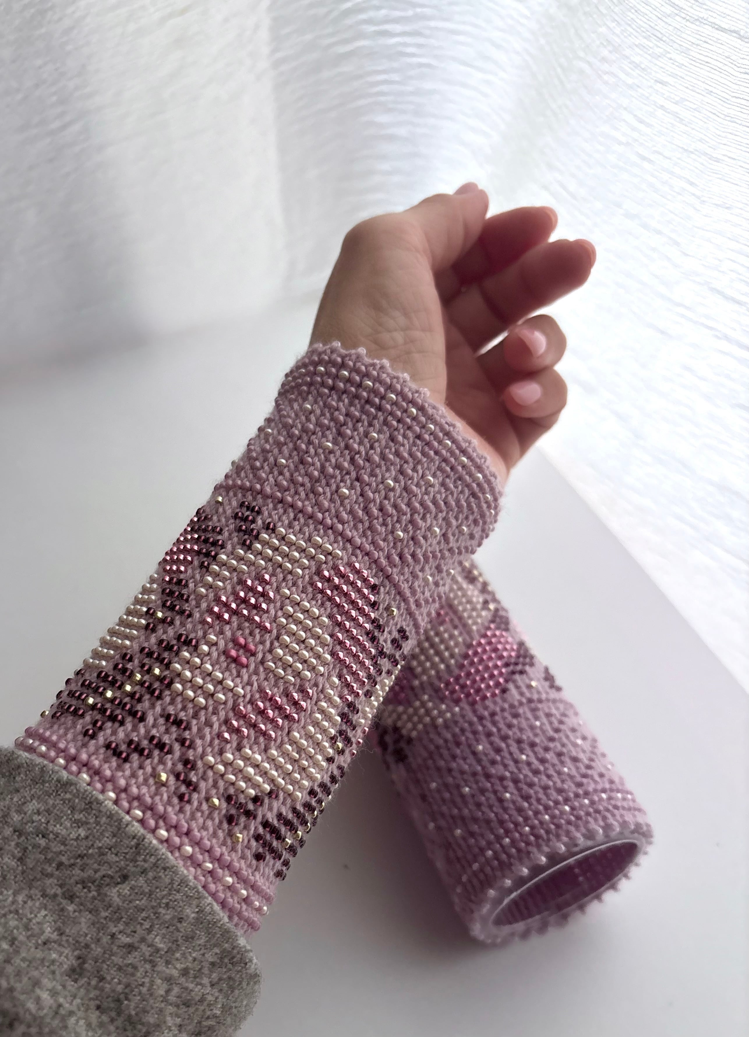 マウチは編み始める前に柄を全て計算して(図におこして)全てのビーズを毛糸に通してから細い編み棒で編むという想像もつかない大変な工程で作られています。