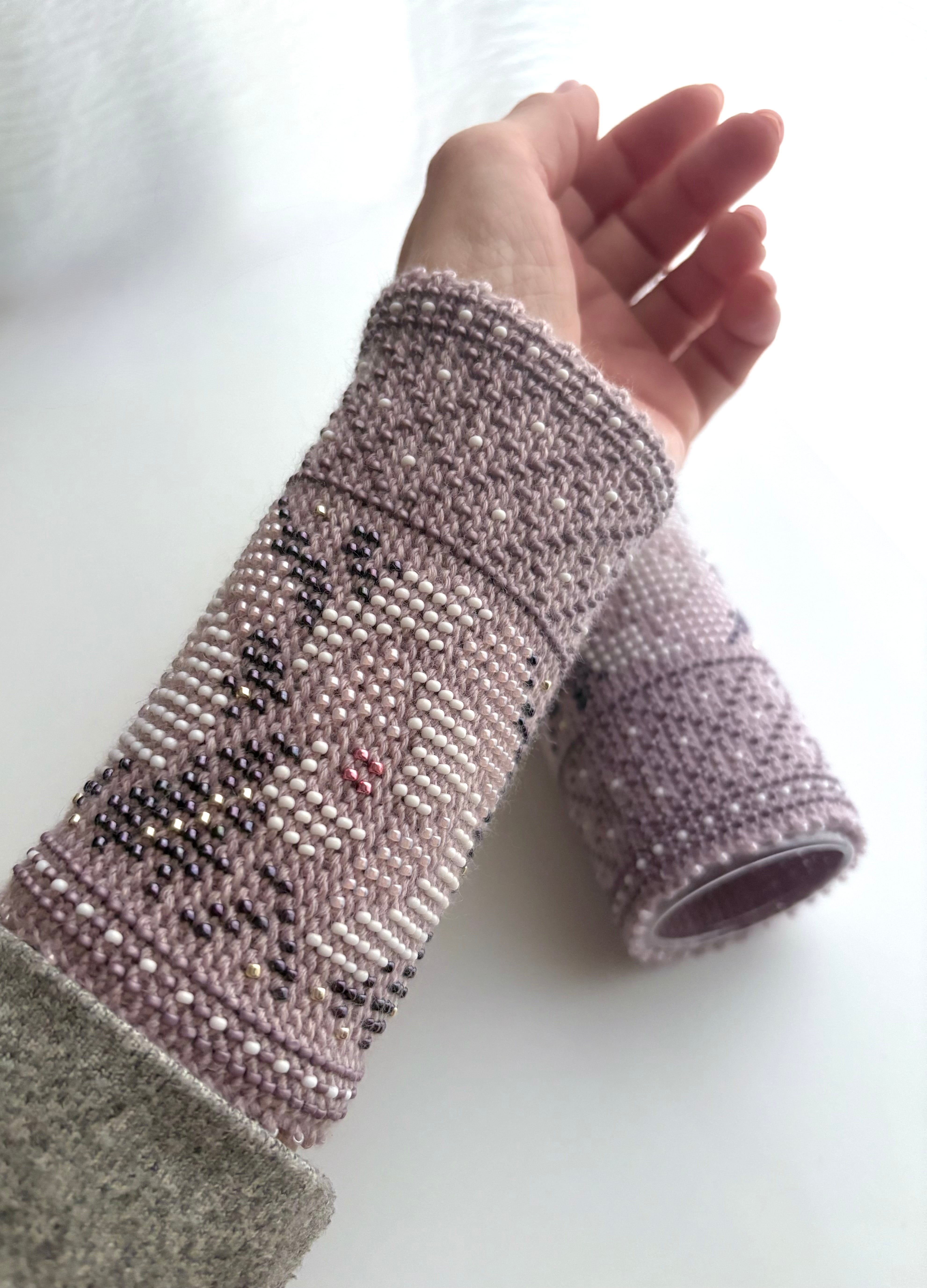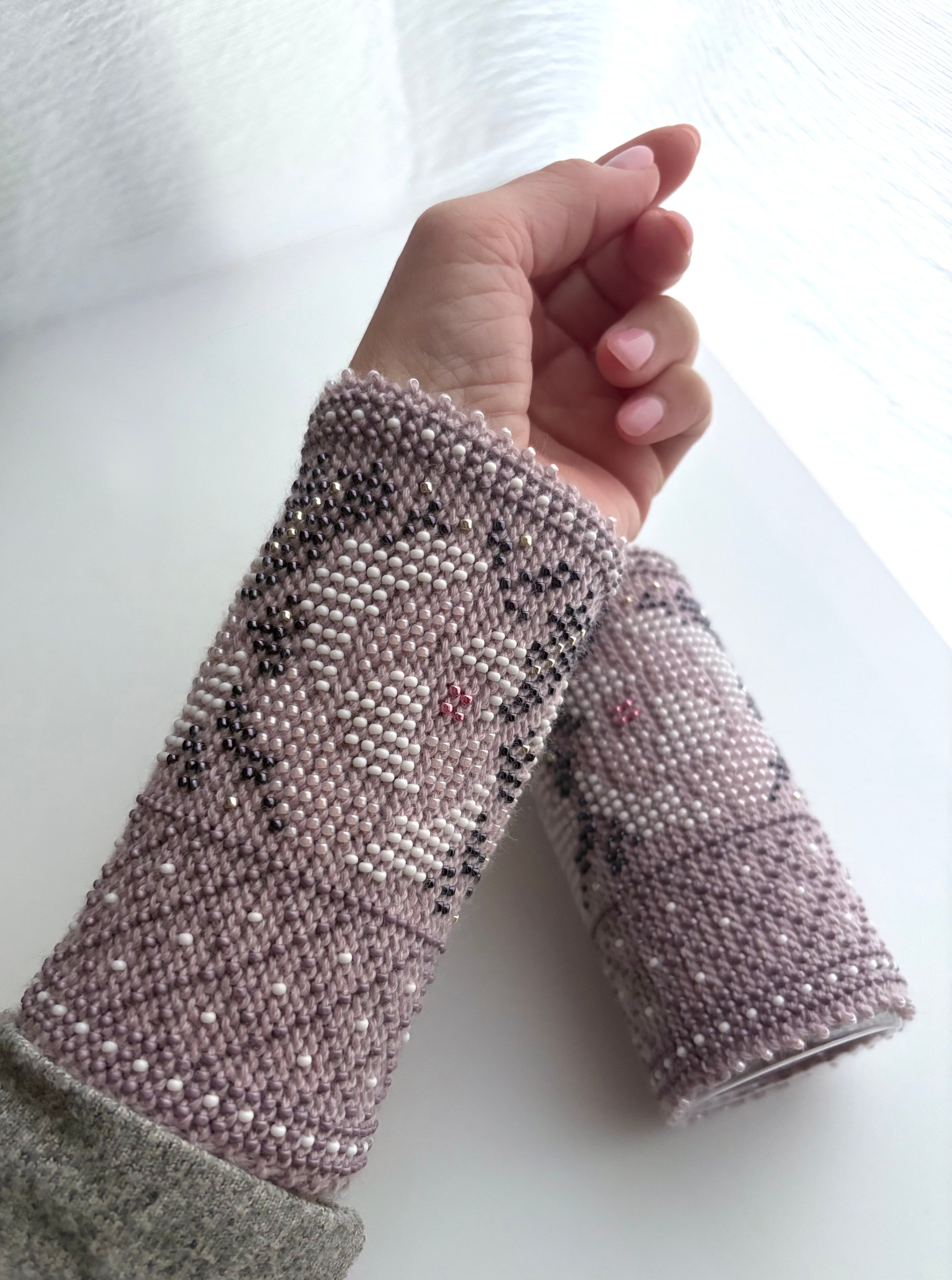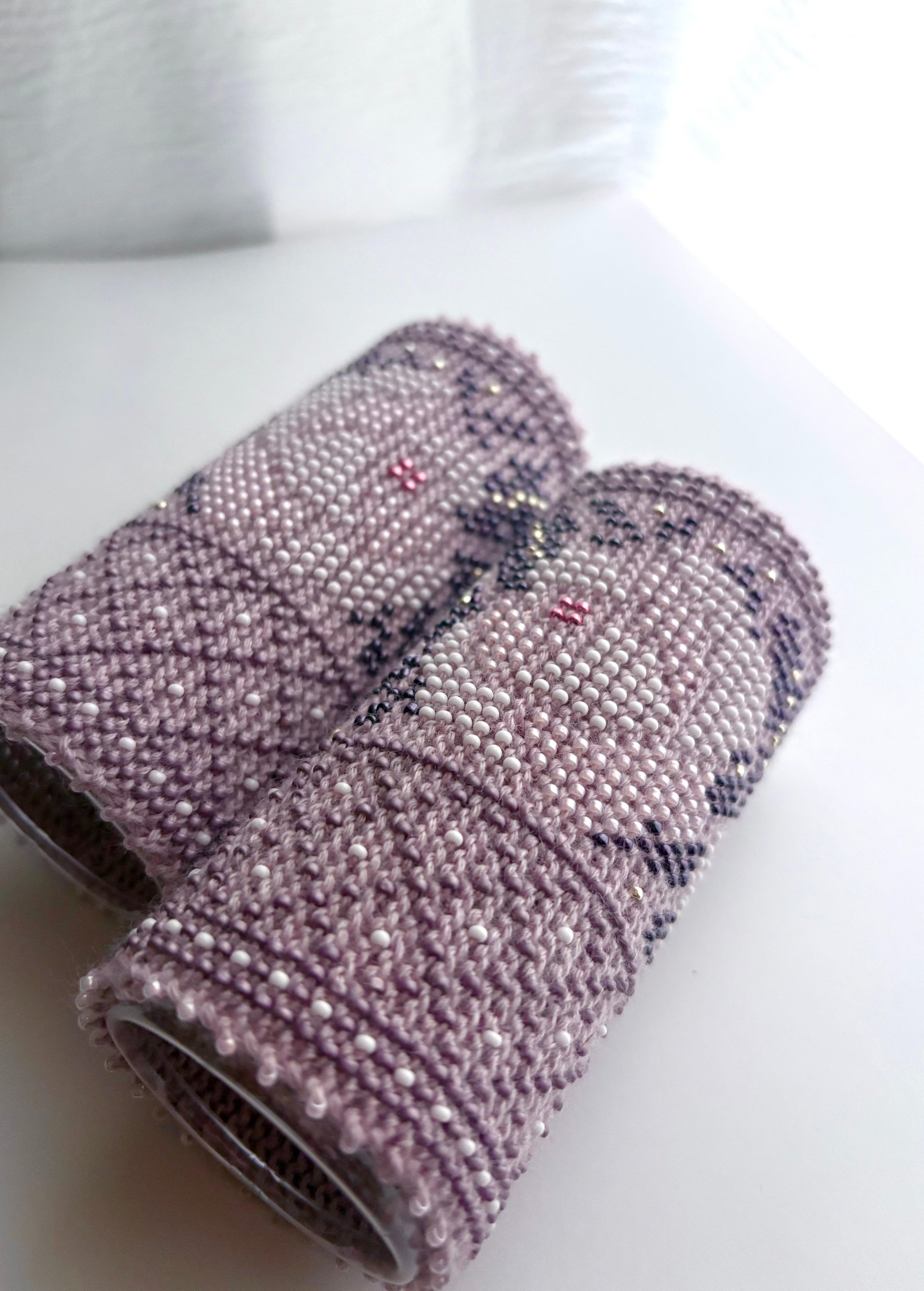 マウチは編み始める前に柄を全て計算して(図におこして)全てのビーズを毛糸に通してから細い編み棒で編むという想像もつかない大変な工程で作られています。
