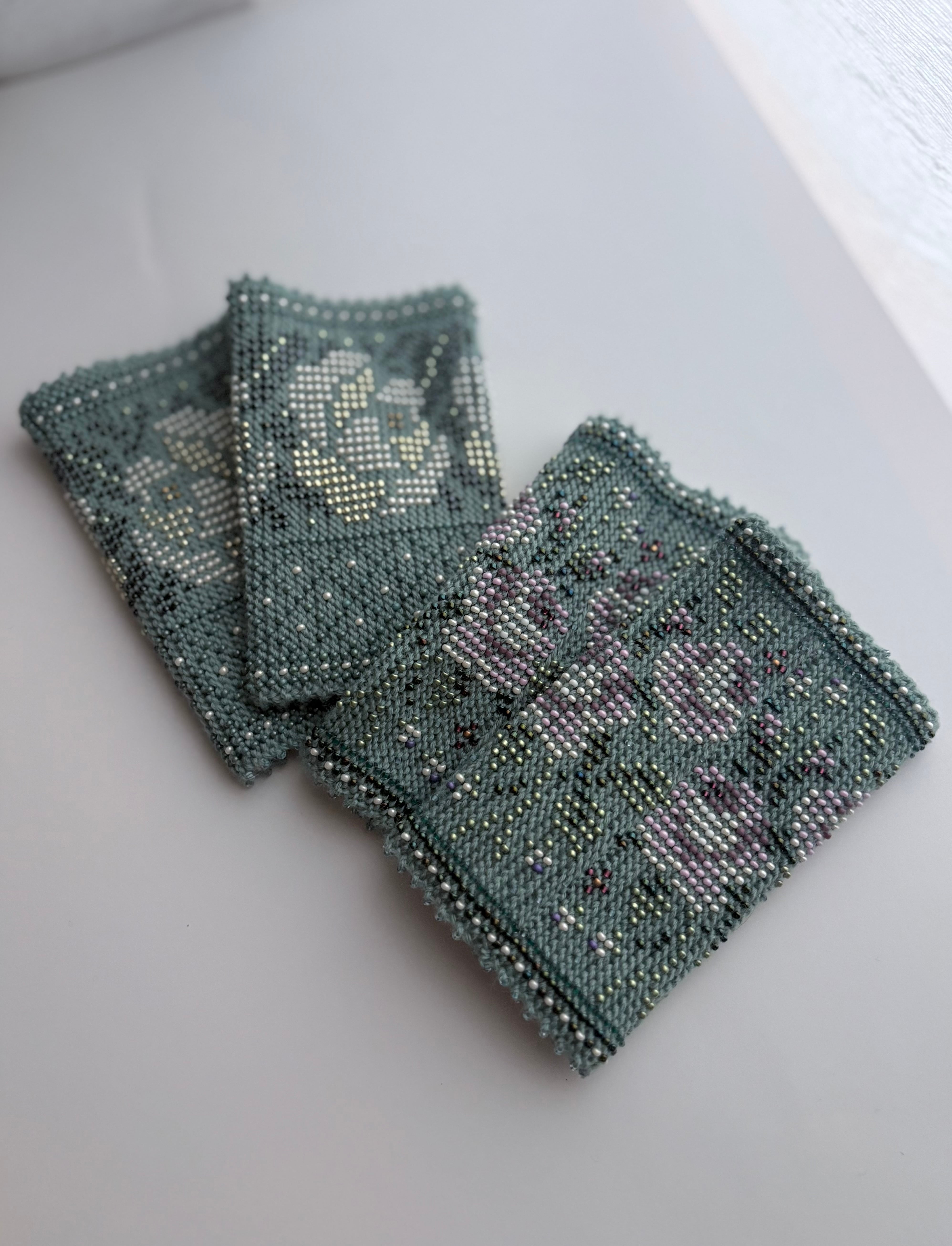 マウチは編み始める前に柄を全て計算して(図におこして)全てのビーズを毛糸に通してから細い編み棒で編むという想像もつかない大変な工程で作られています。