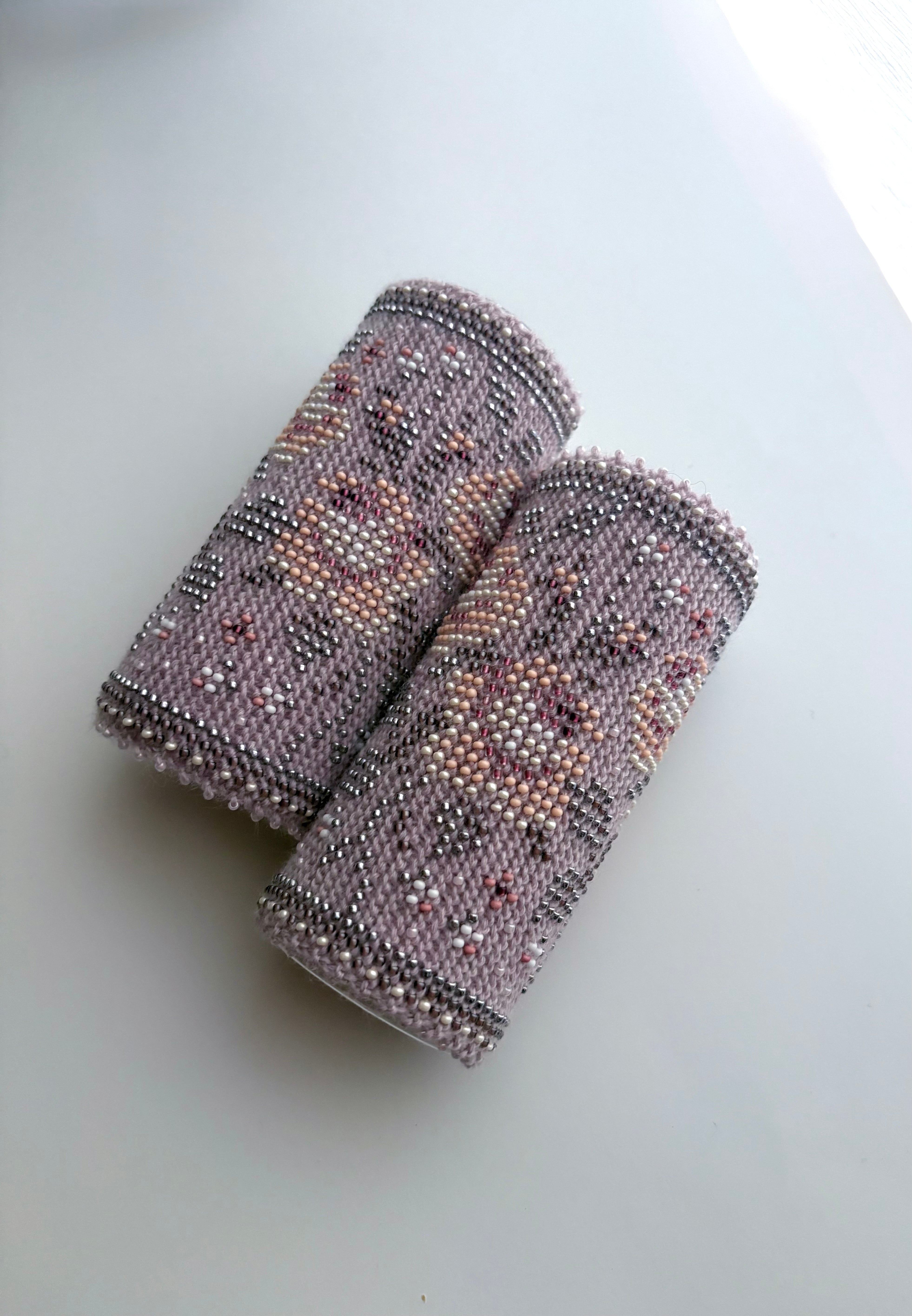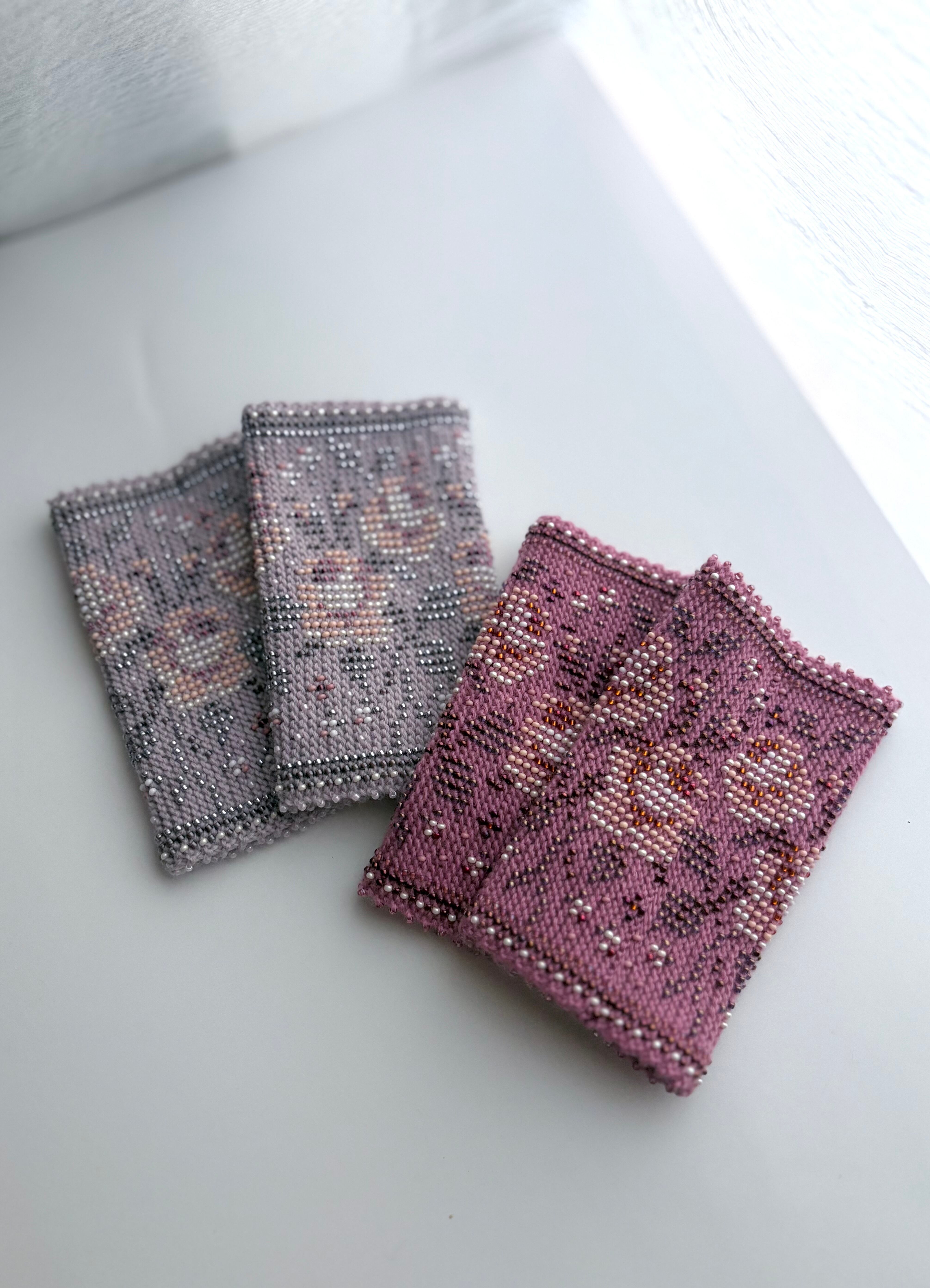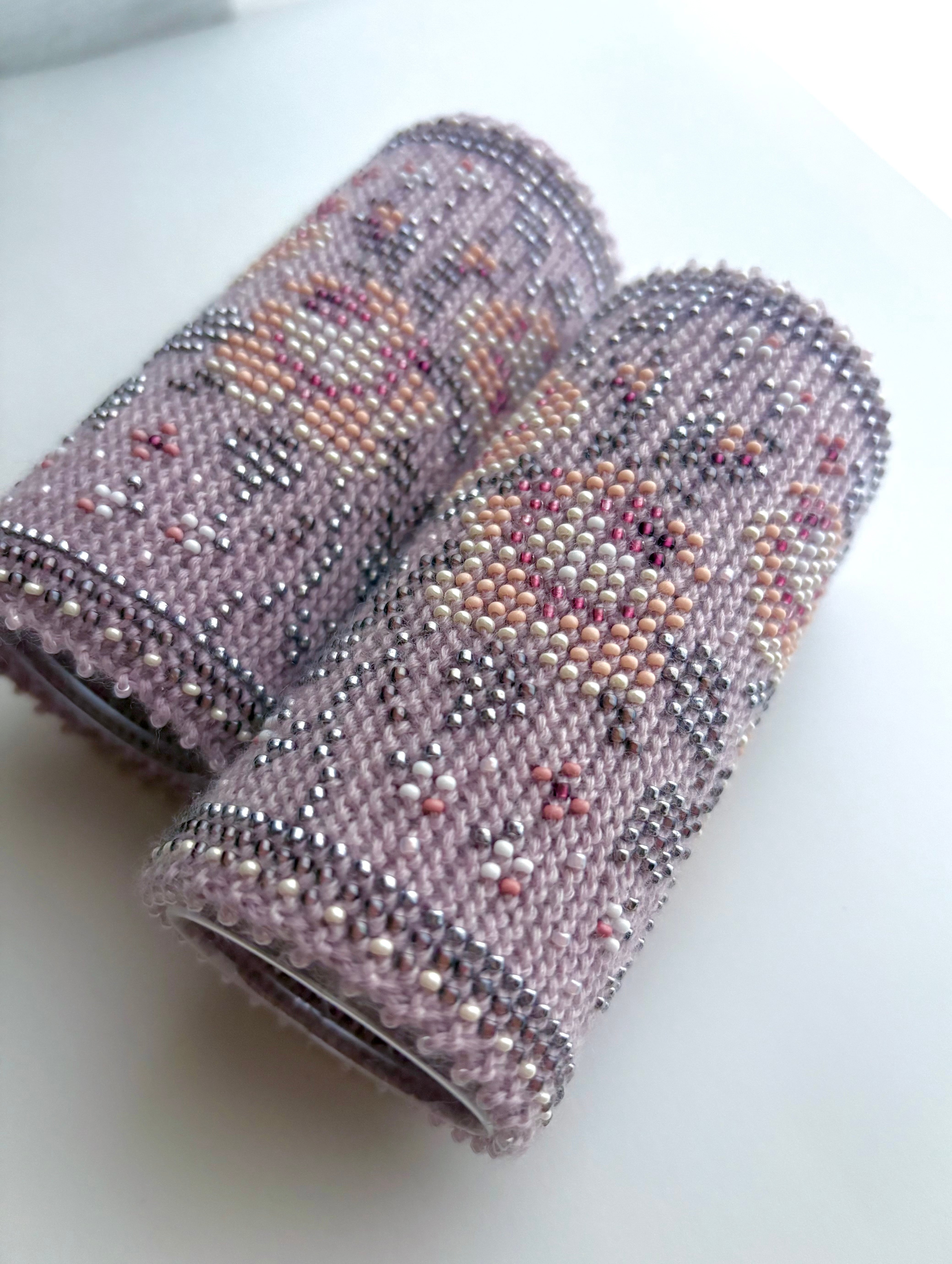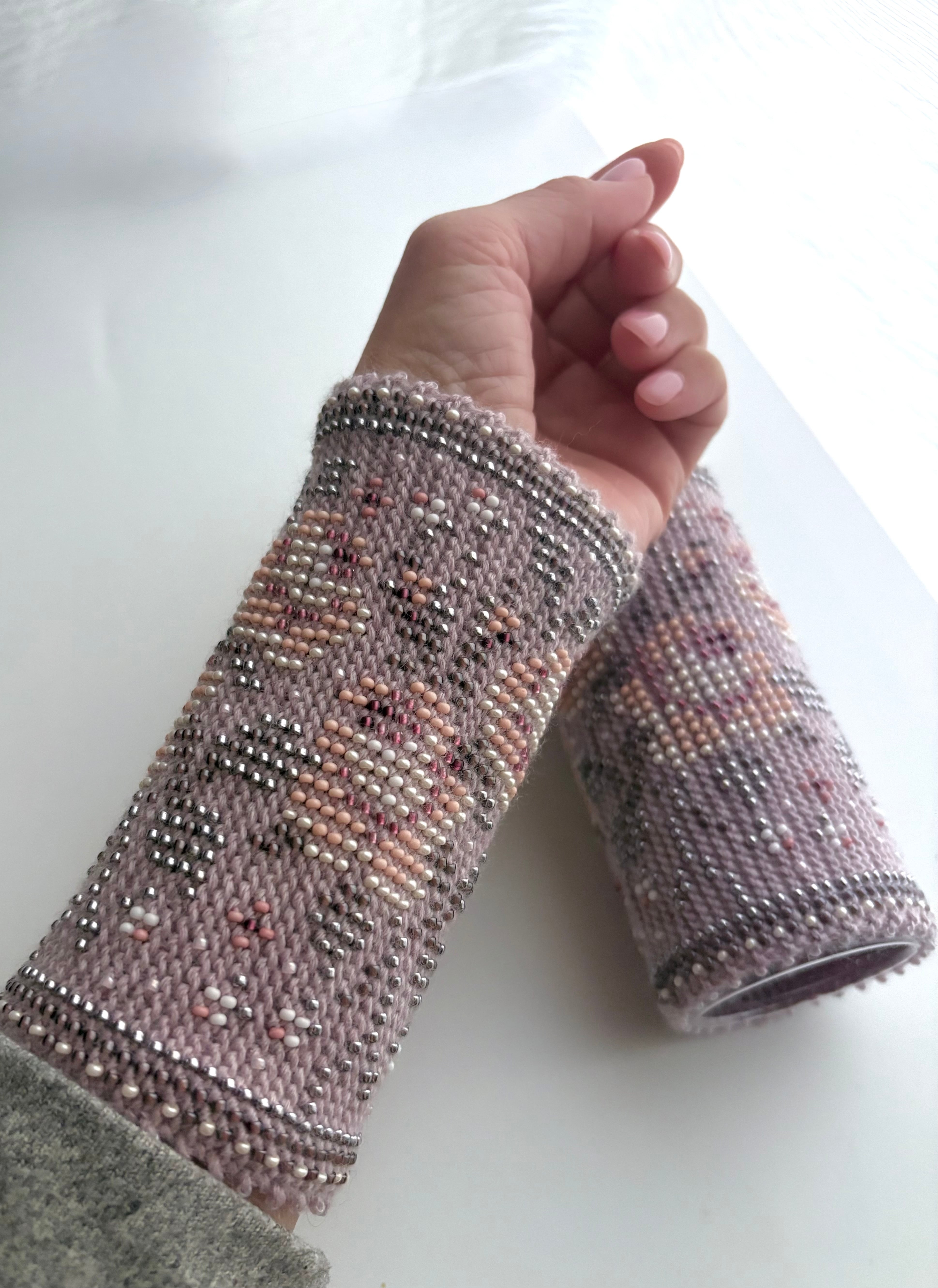 マウチは編み始める前に柄を全て計算して(図におこして)全てのビーズを毛糸に通してから細い編み棒で編むという想像もつかない大変な工程で作られています。