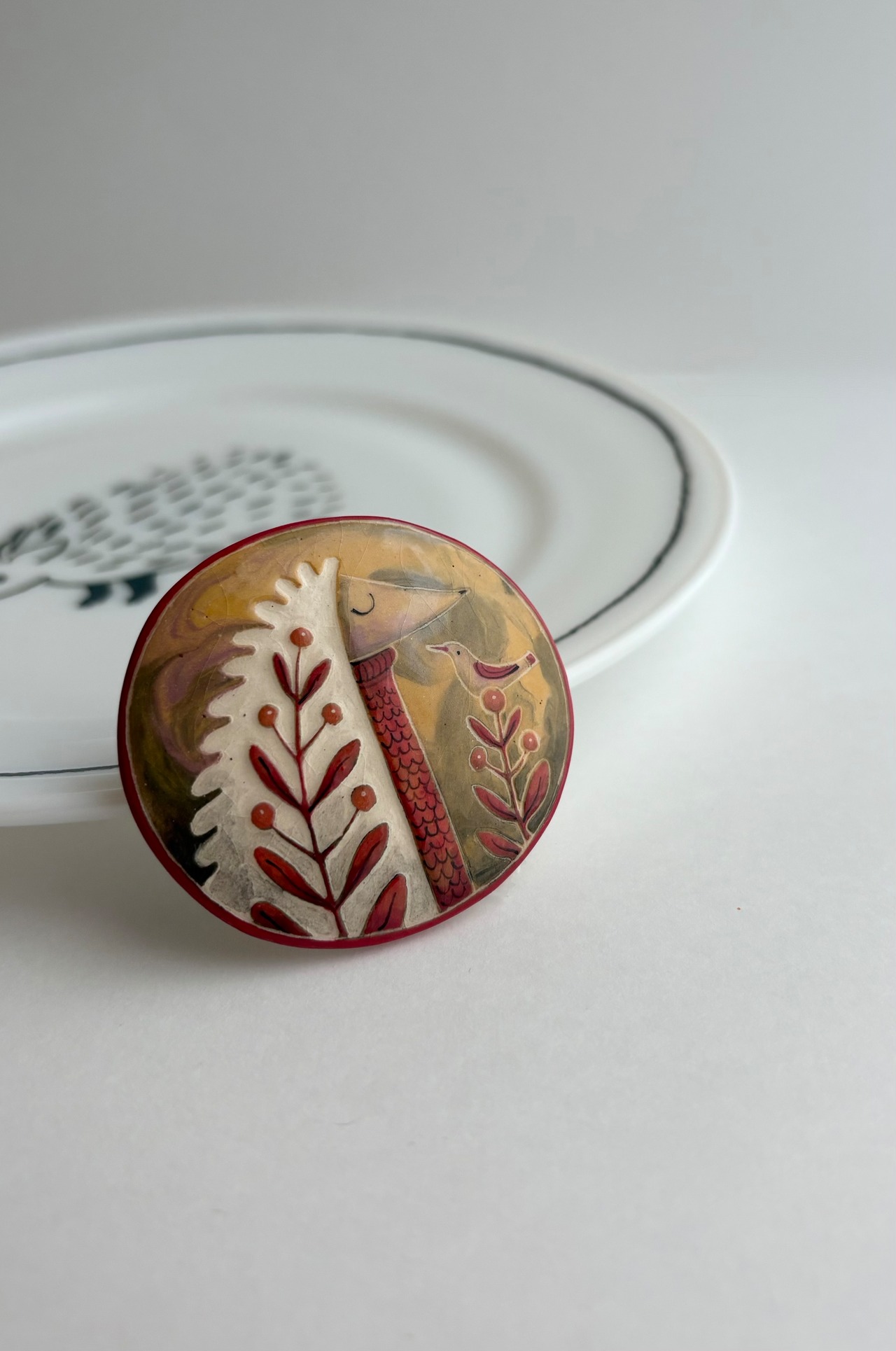 sutverimai_artの技法で作られたセラミック製のブローチです。細い針で削り、釉薬を筆で塗り焼いていきます。