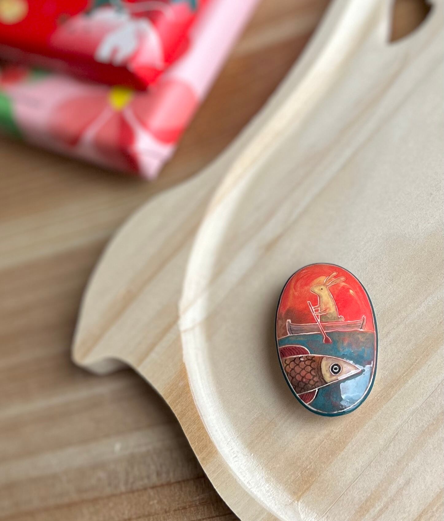 リトアニア Adomasさんのブローチ 夕陽の中、船を漕ぐうさぎさんとお魚