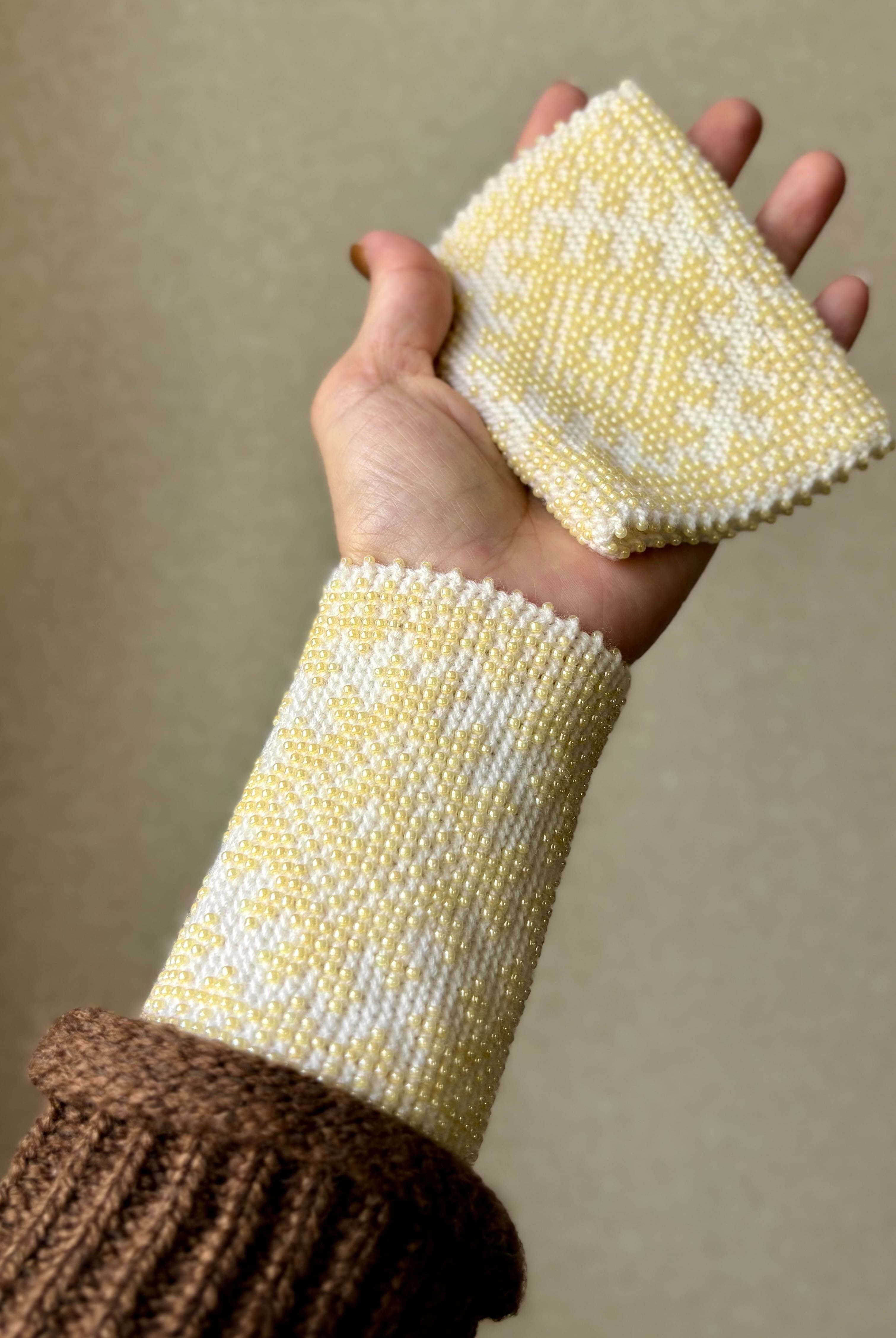 ホワイトのベースに黄色がかったパールホワイトのビーズ一色で編み込まれたマウチ。