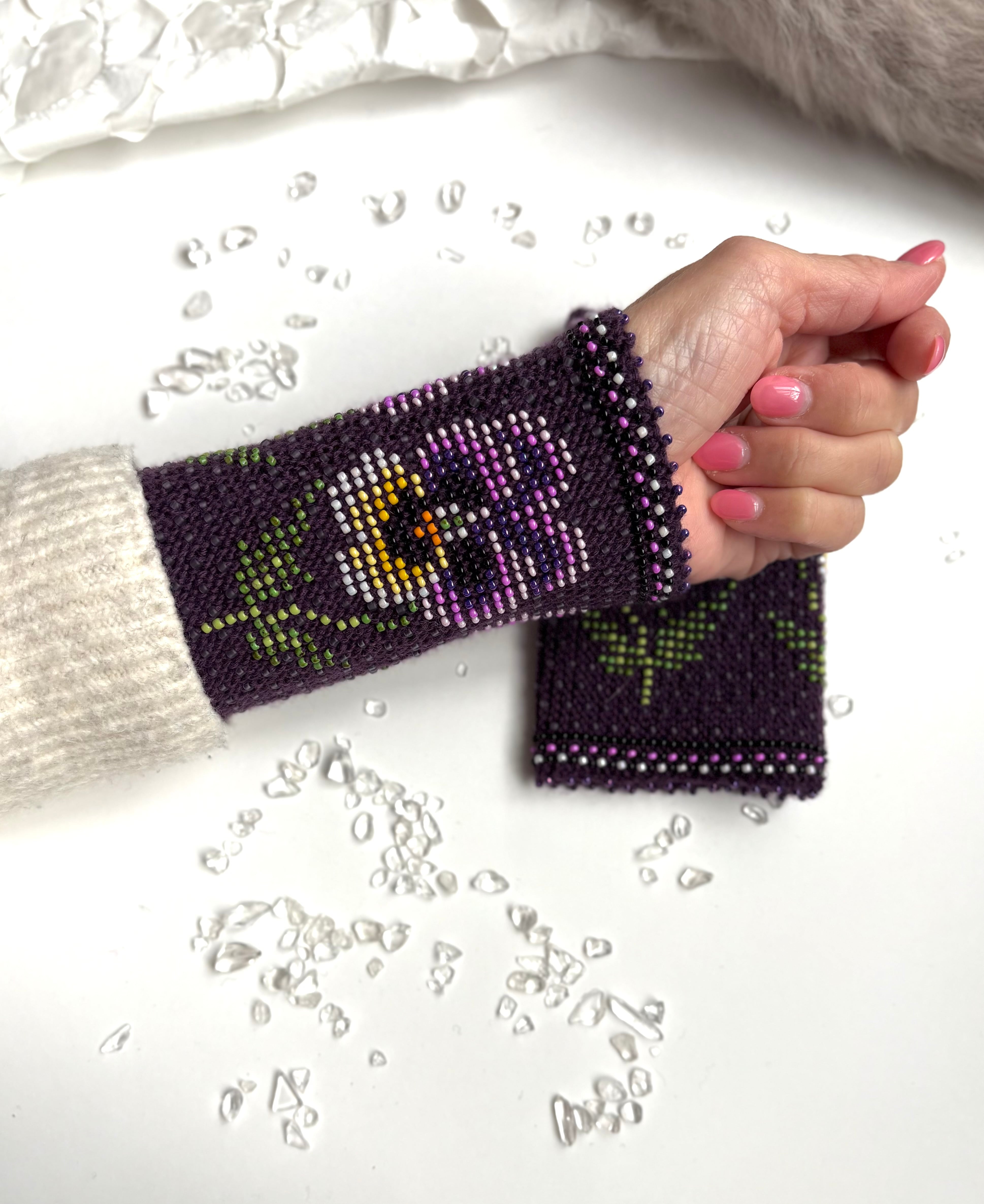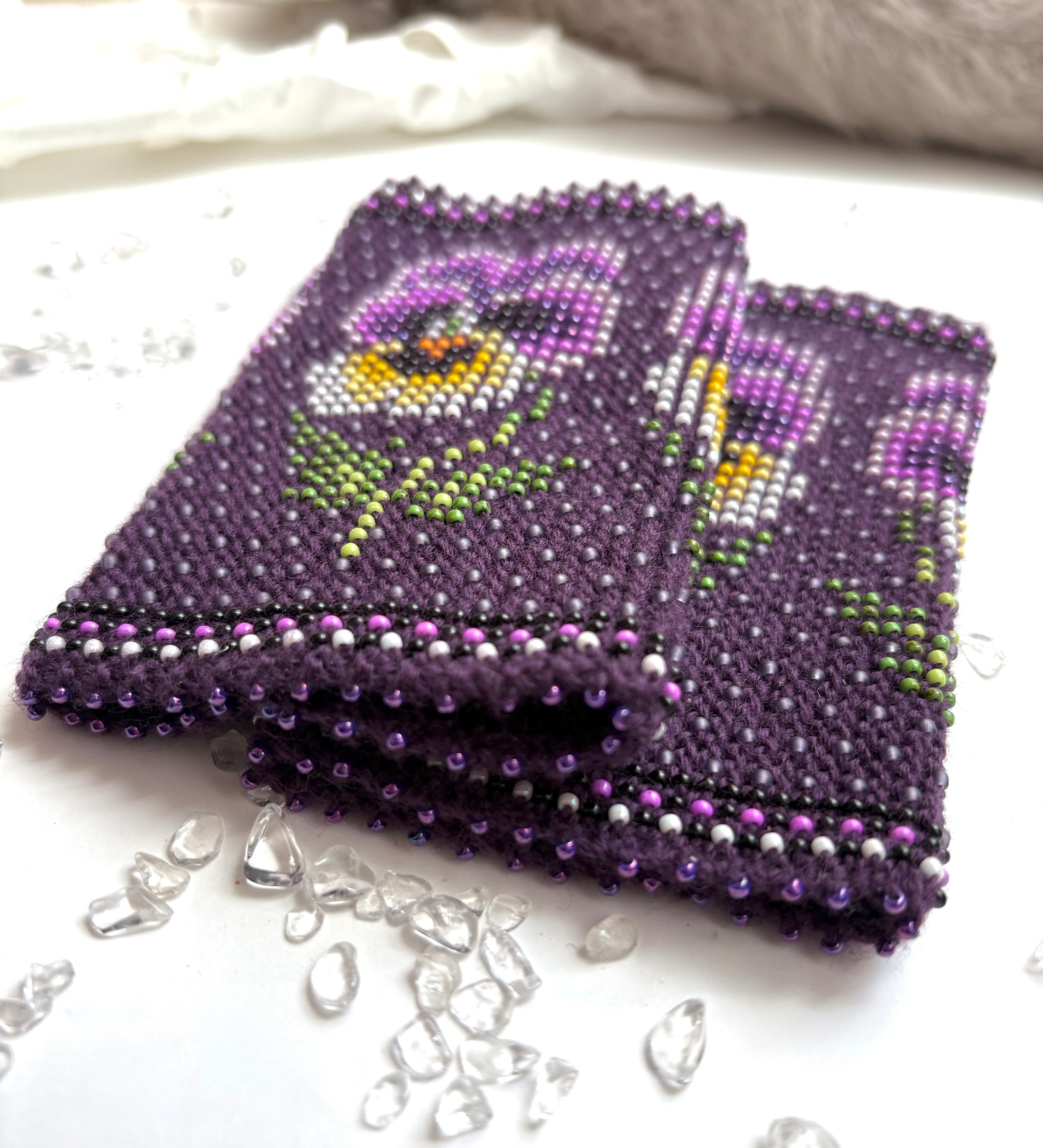 マウチは編み始める前に柄を全て計算して(図におこして)全てのビーズを毛糸に通してから細い編み棒で編むという想像もつかない大変な工程で作られています。