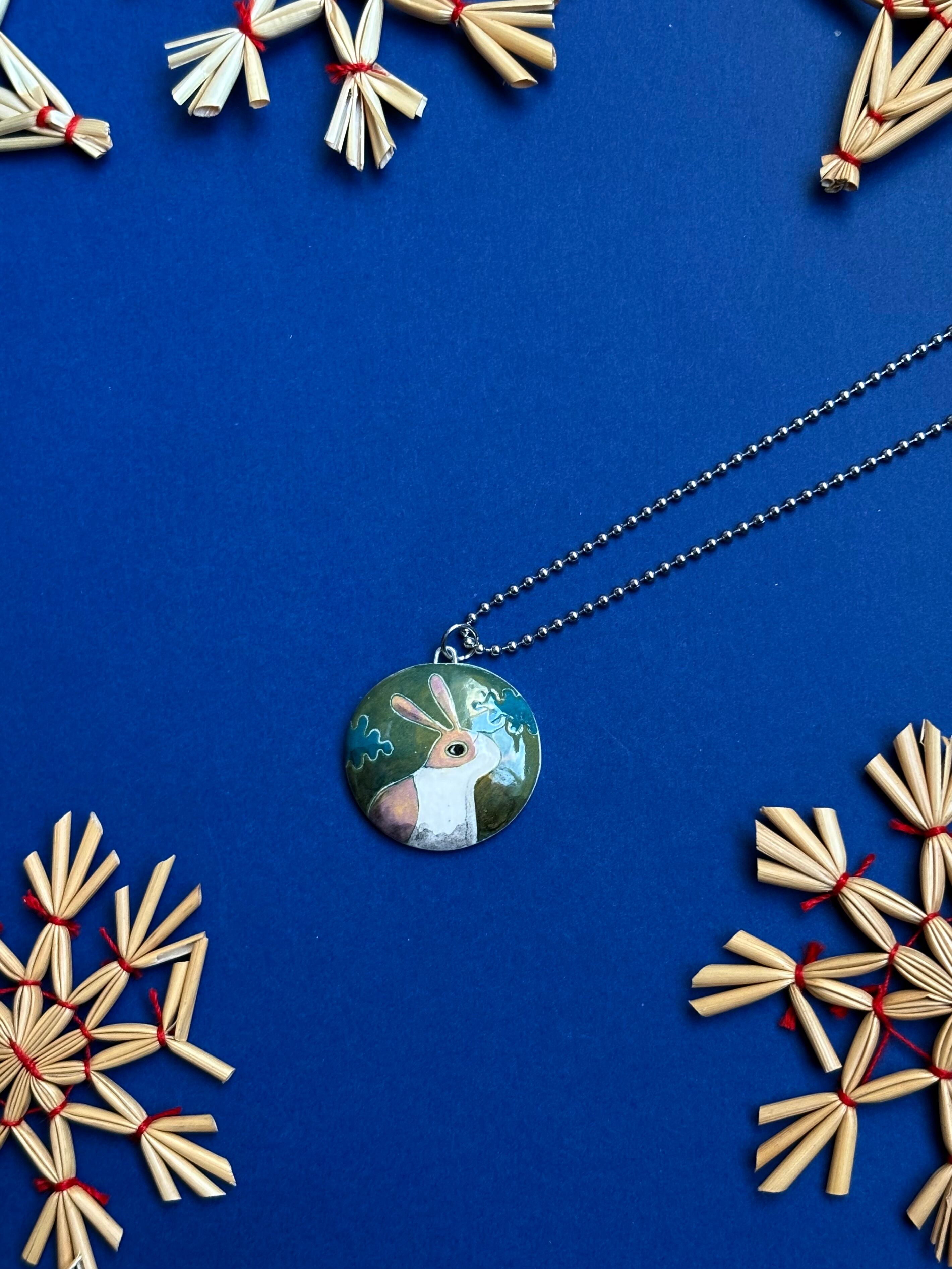 リトアニア アドマスさんの陶器のネックレス モスグリーンの森に佇むまぁるいうさぎさん